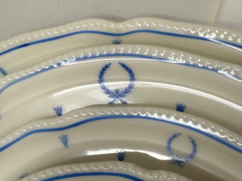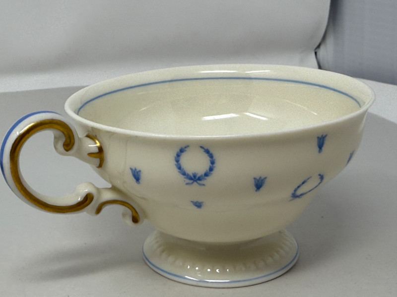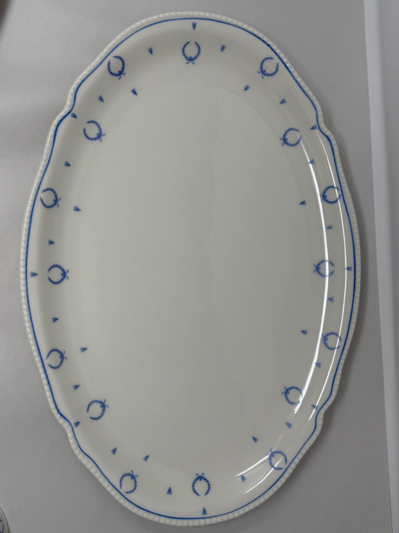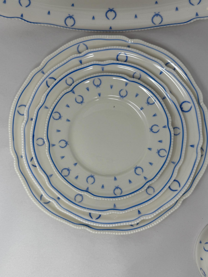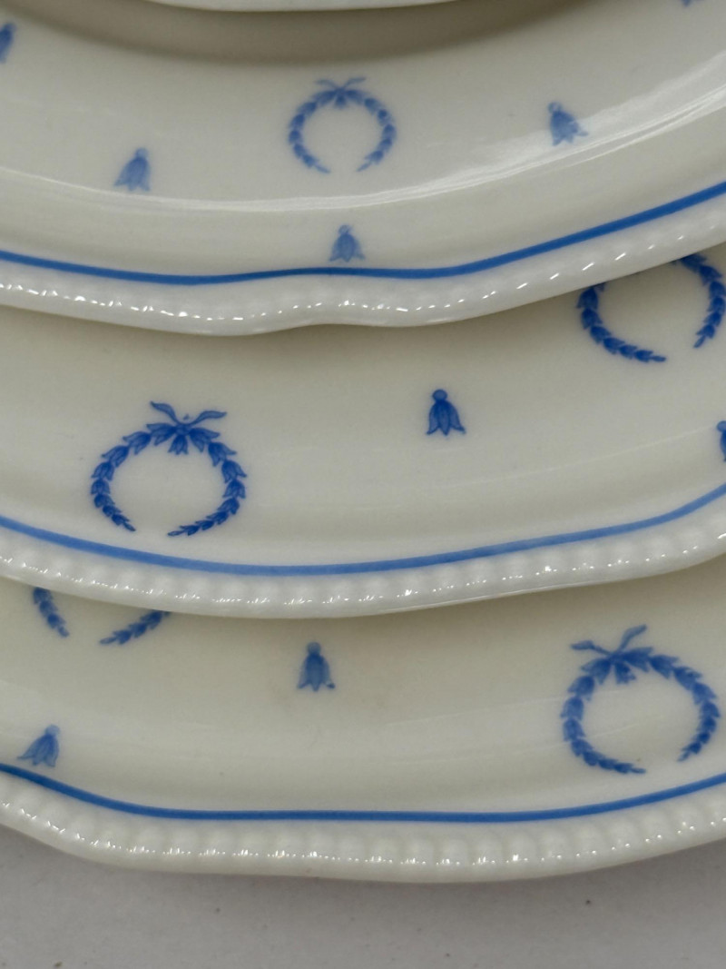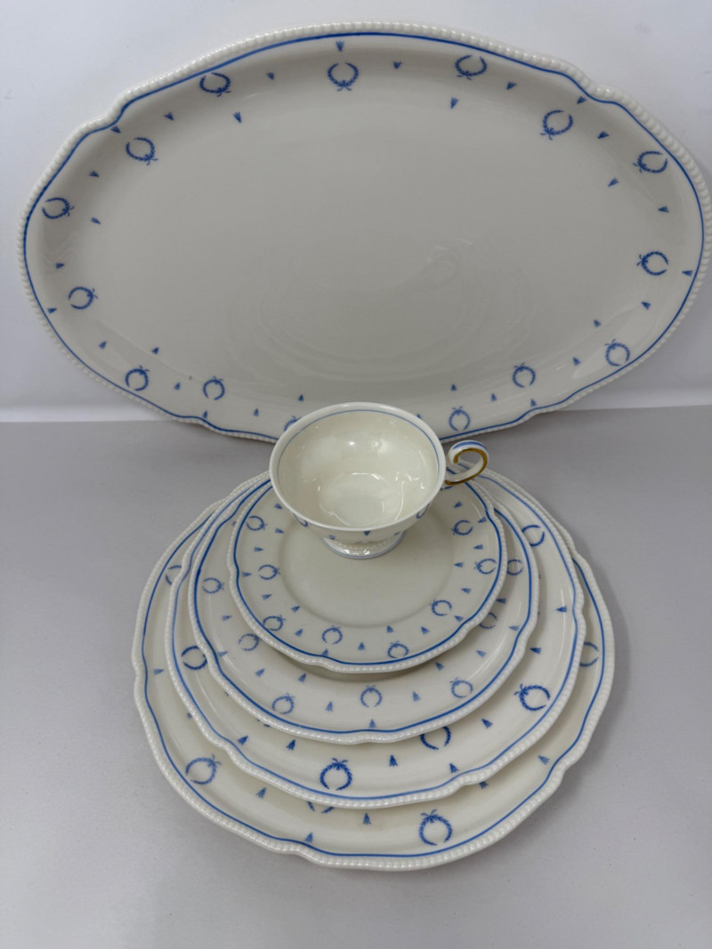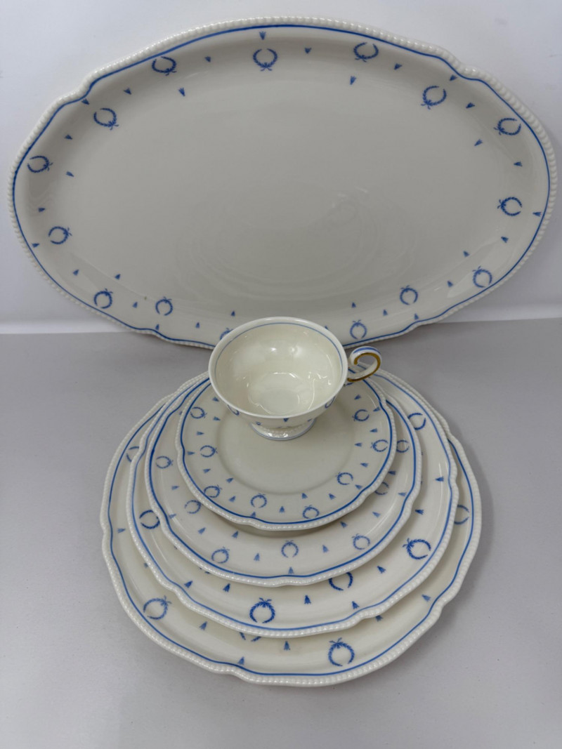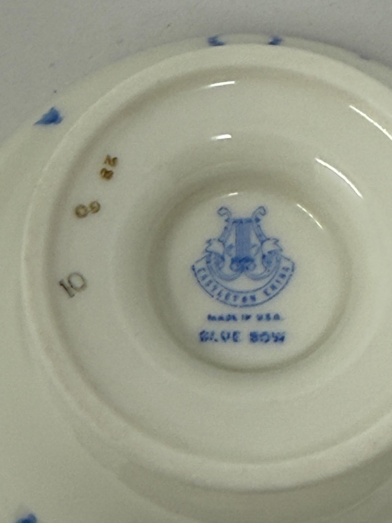 “Blue Bow” Castleton China Made in USA 6 salad plates 12 dessert plates 19 appetizer plates 16 saucers and 13 cups 1 platter 71 total pieces