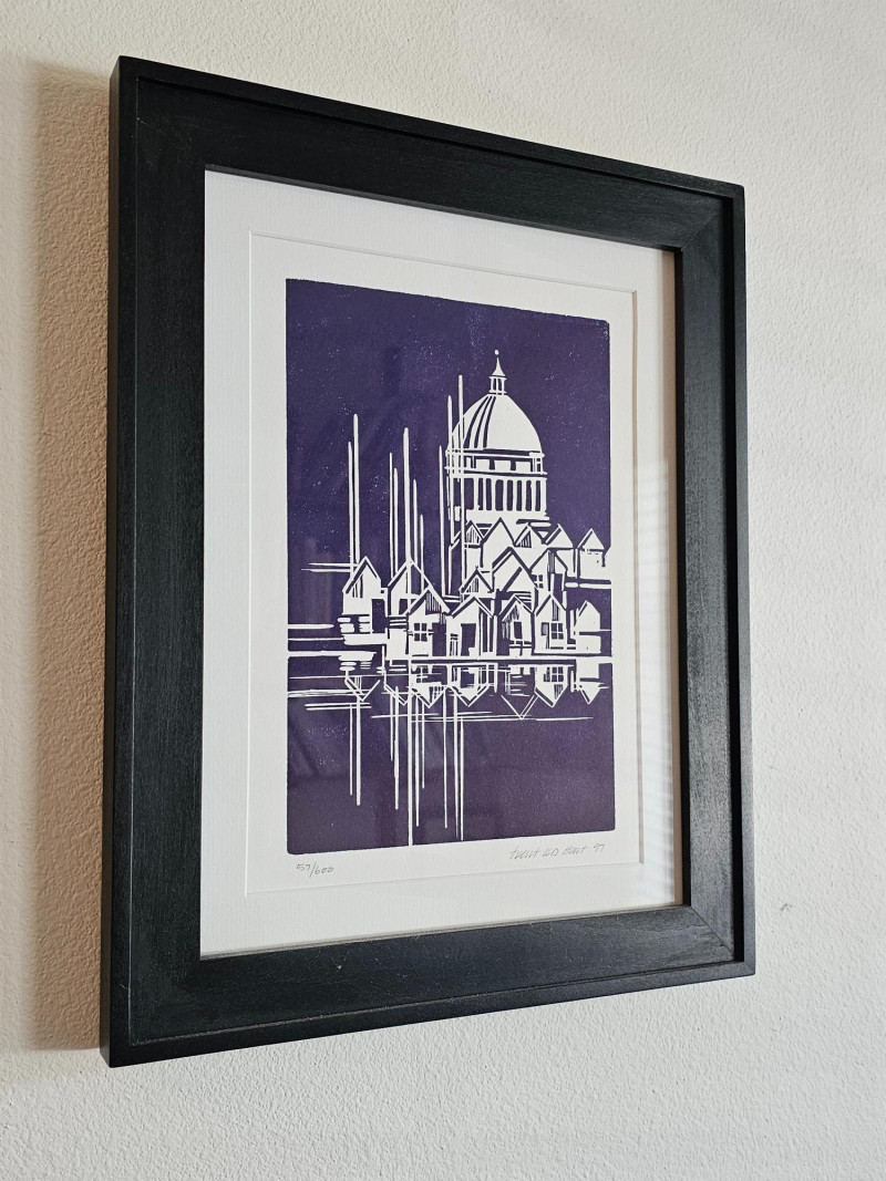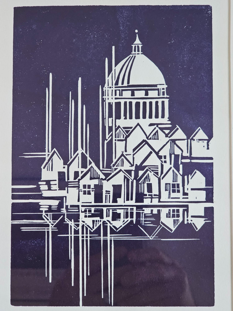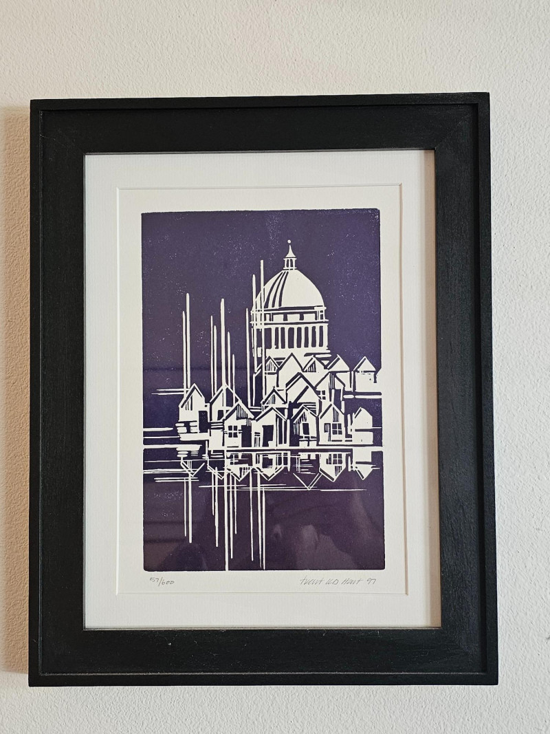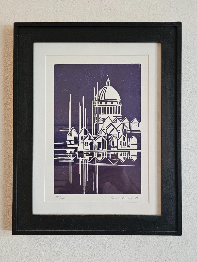 Limited Edition Artist-Signed Framed & Matted Linocut Print Appears to be a local piece, possibly of the Capitol building behind a series of boat houses on the water? Signature is hand-signed in pencil, looks like Trent KD Hart '97 Also in pencil, this appears to be #57/600 in a limited series Nice black wood frame with white matting 14.25"T x 11.25"W