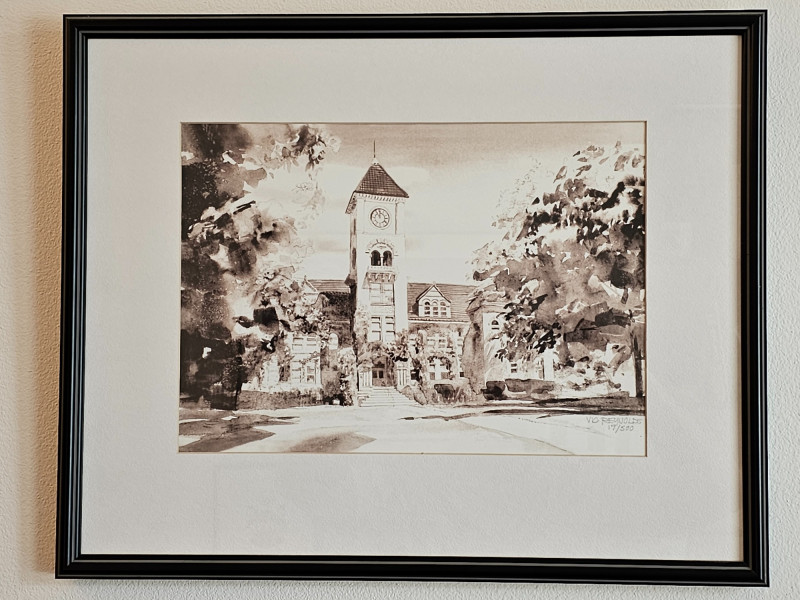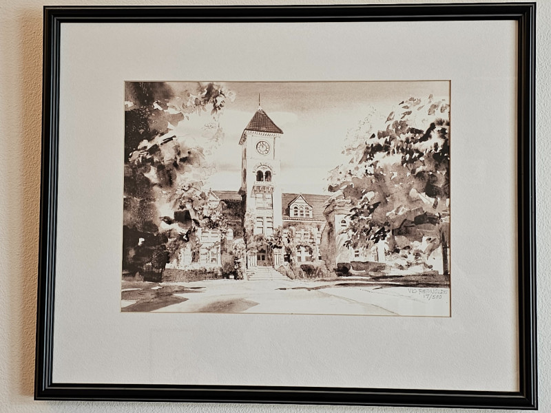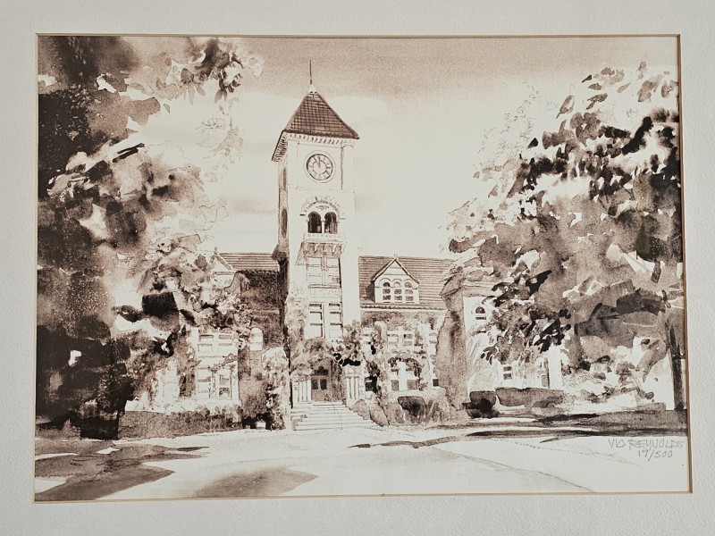 Acrylic Print By Vic Reynolds Of The Iconic Memorial Building at Whitman College in Walla Walla, Washington Hand-signed in pencil by artist Vic Reynolds Limited Edition #17/500 Vic Reynolds was a professor of art at Wayne State College in Nebraska. He also taught art at the University of Alabama & UNLV. He was selected to go to Vietnam and create artwork depicting the Vietnam War. His work is part of the permanent Smithsonian exhibit and has been published in the Washington Post and the book Forgotten Warriors. Framed and matted under glass 16.5"T x 21"W
