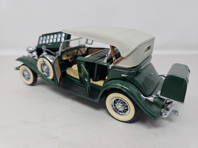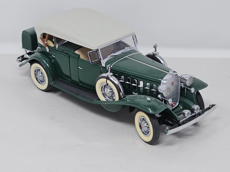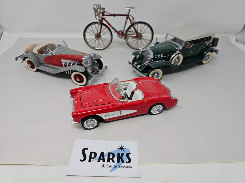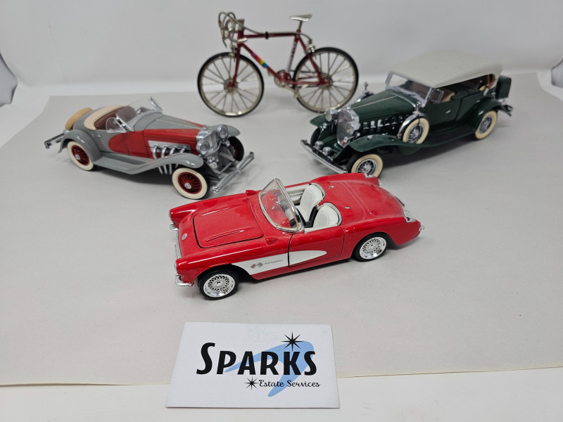 (3) Die-Cast Classic Cars & Bicycle (1)Danbury Mint 1935 Duesenberg SSJ Original box included (1) Danbury Mint 1932 Cadillac V-16 Sport Phaeton Original box included (1) 1957 Chevrolet Corvette (1) 1987 Haleakala Downhill Cruiser Brakes & pedals function, original box included All are in very nice "shelf displayed" condition (a bit dusty)