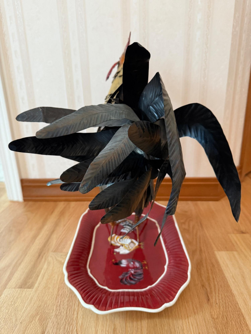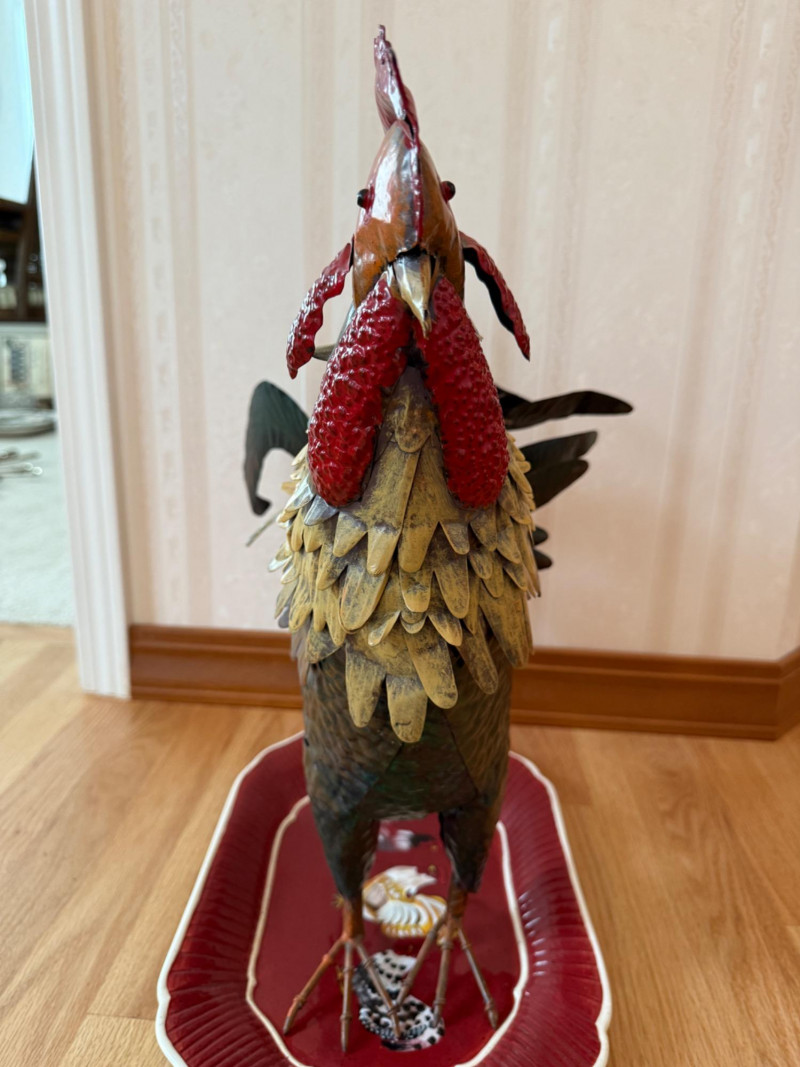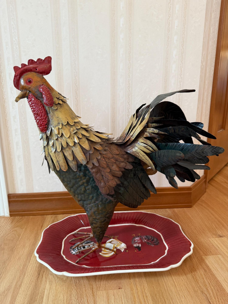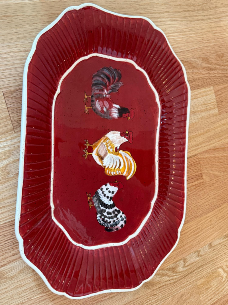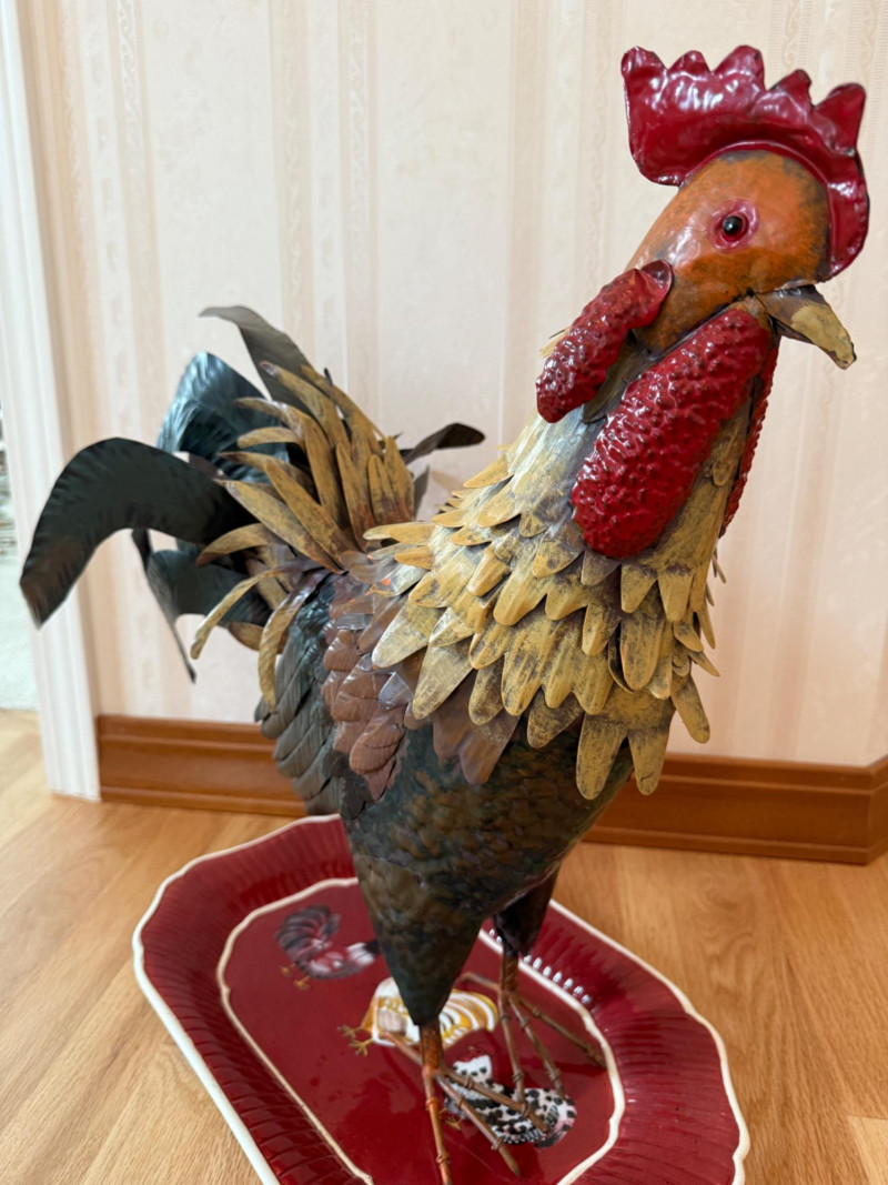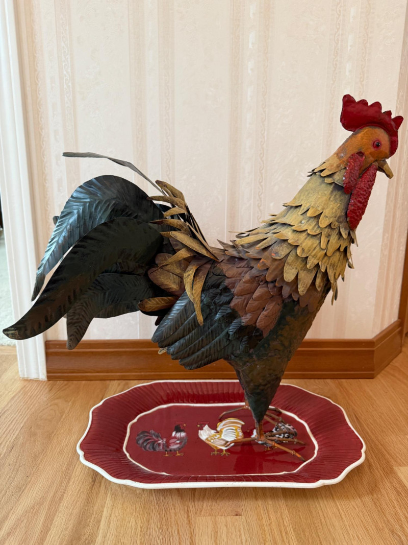 Tin Rooster & Ceramic Rooster Platter Metal rooster measures 18” x 19.5” Platter measures 16” x 10.5”.