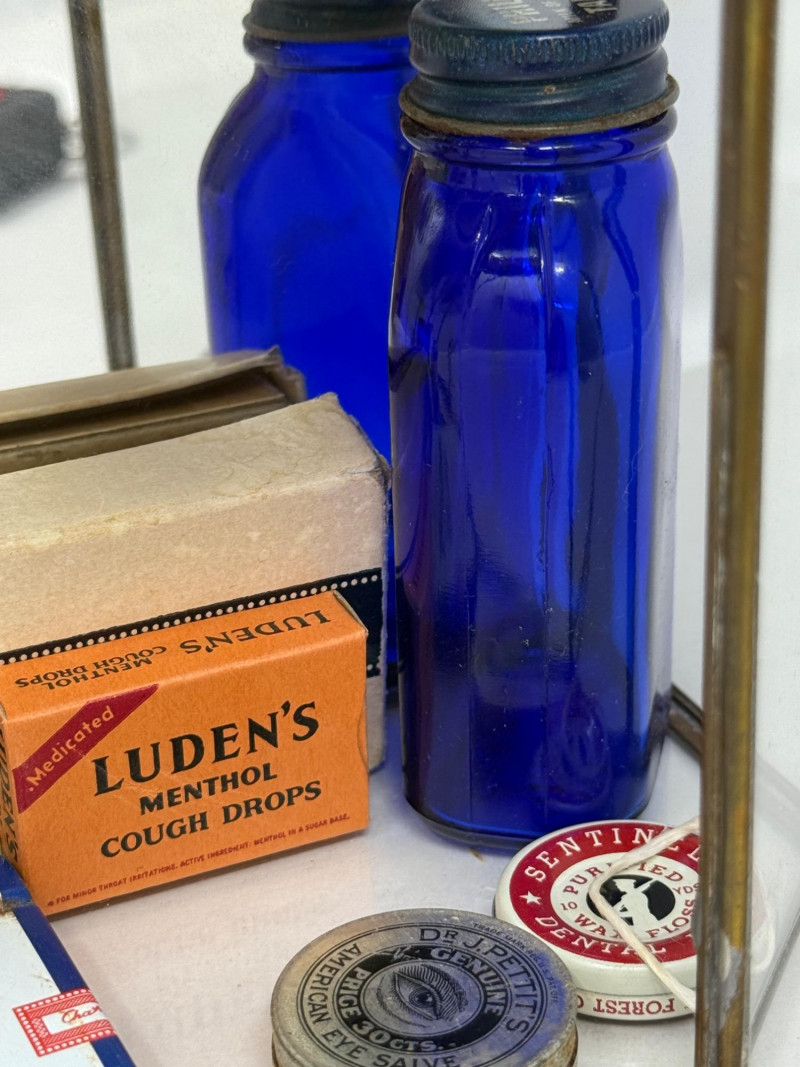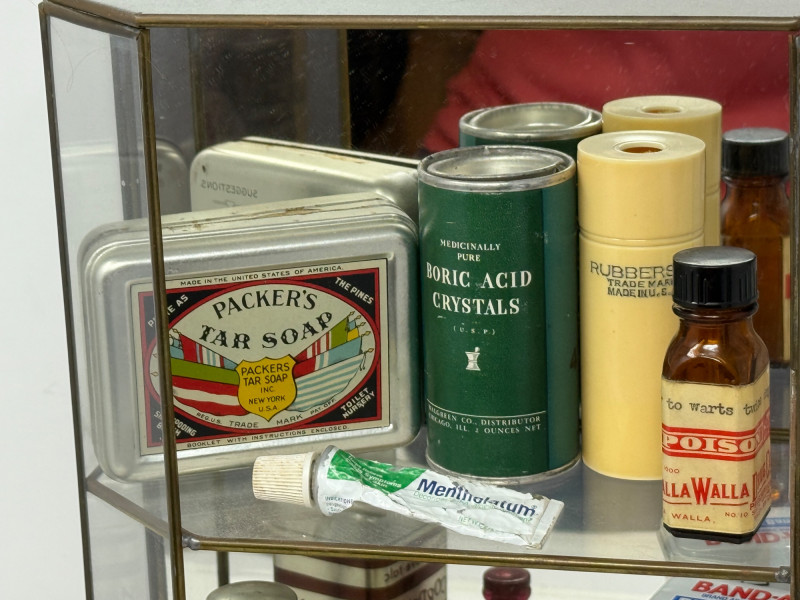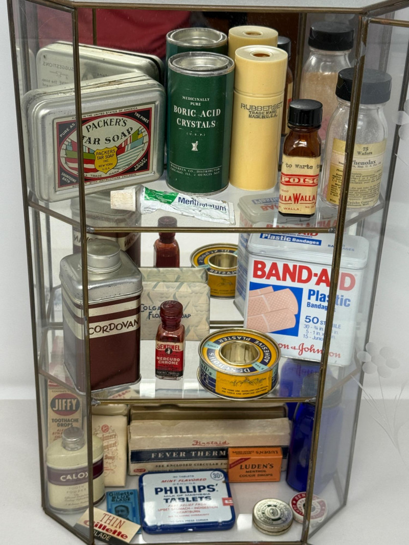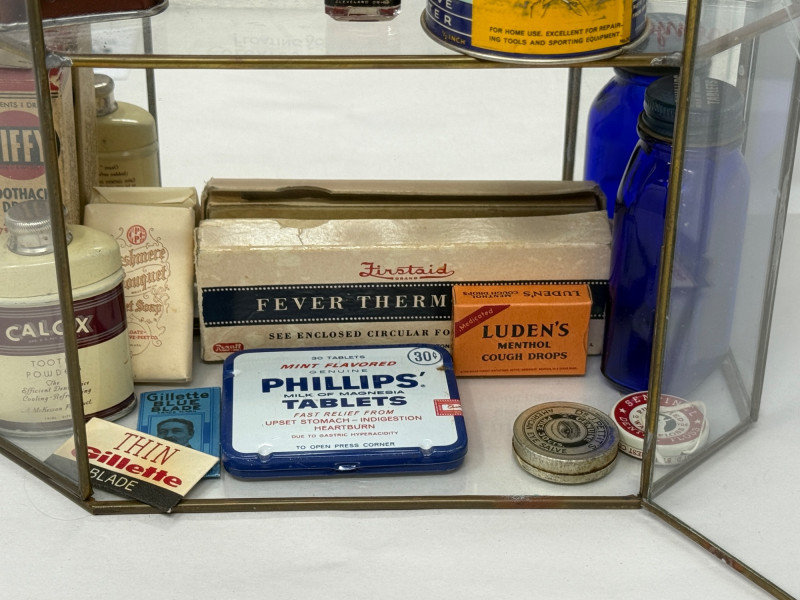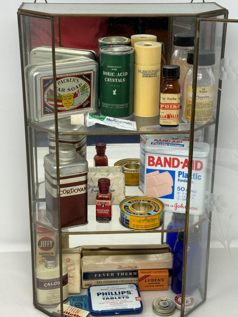 Old Apothecary & Drug Store Goods in Display Case 9.25x15.25x4” Etched glass display case door does not latch.