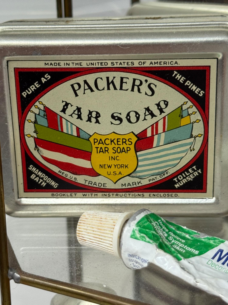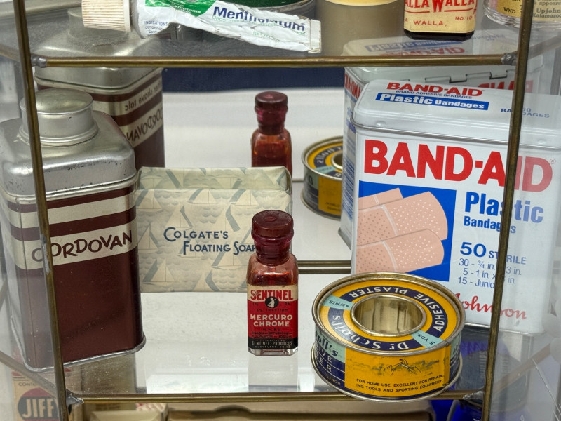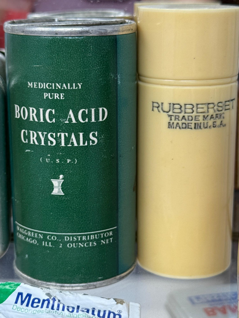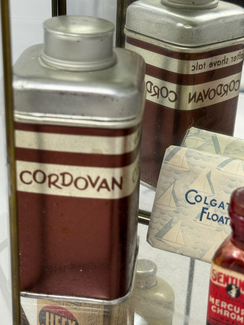 Old Apothecary & Drug Store Goods in Display Case 9.25x15.25x4” Etched glass display case door does not latch.