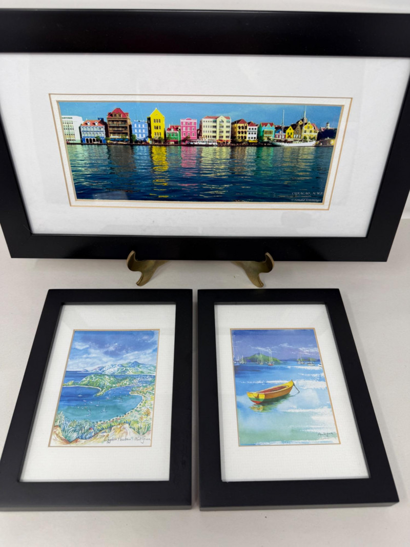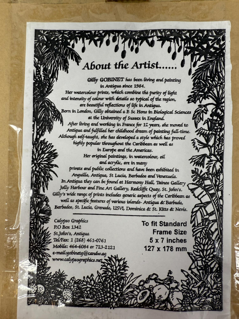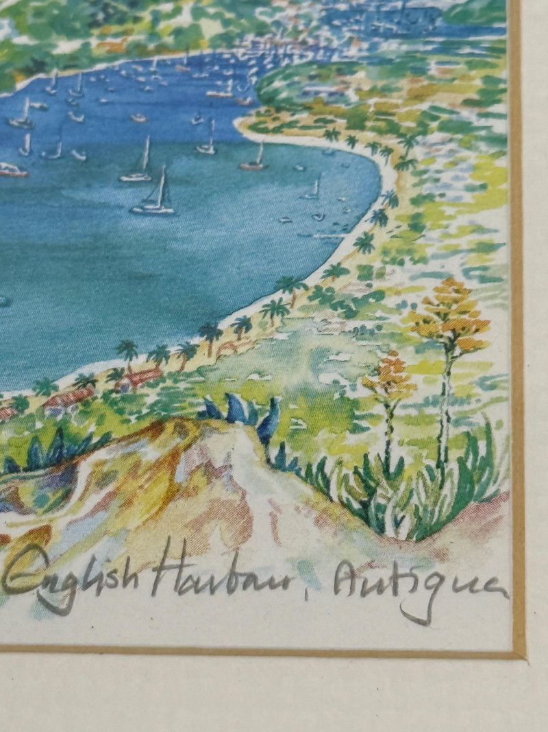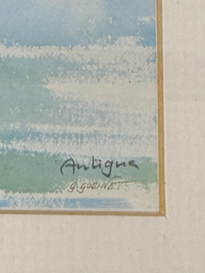 Curaçao & Antigua Art 2 Antigua Watercolors each 6x8” English Harbor Antigua Boat watercolor signed by G Gobinet Does not include brass stand.