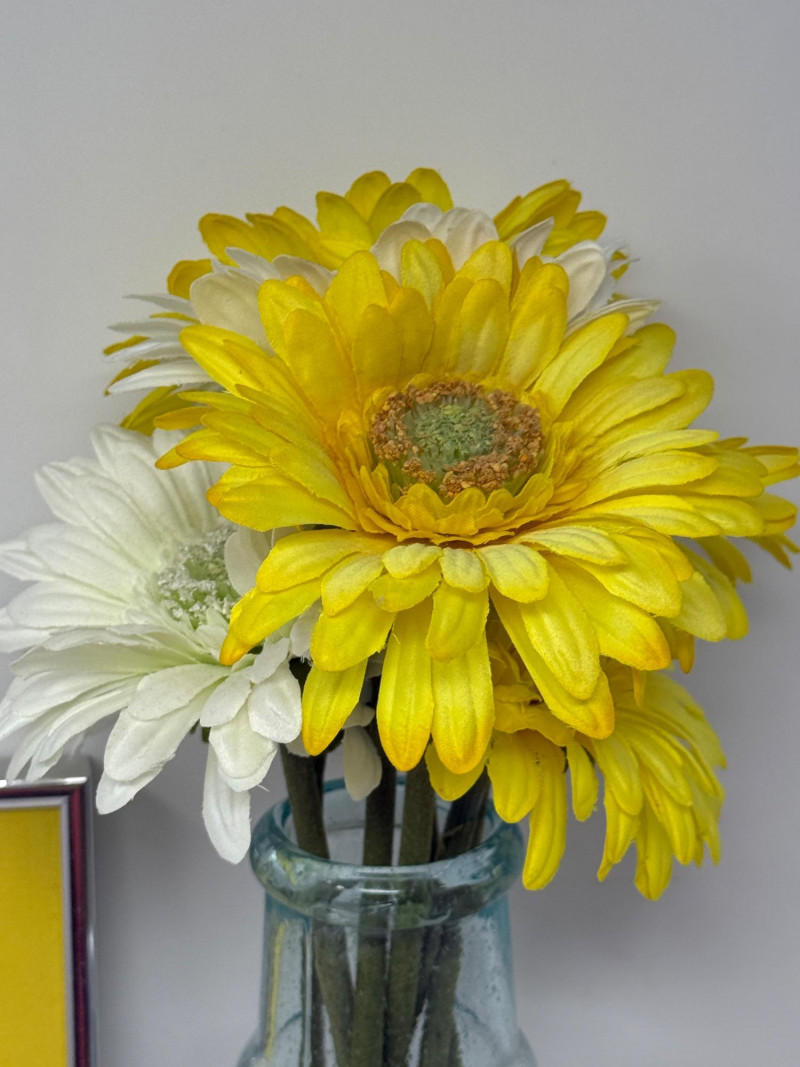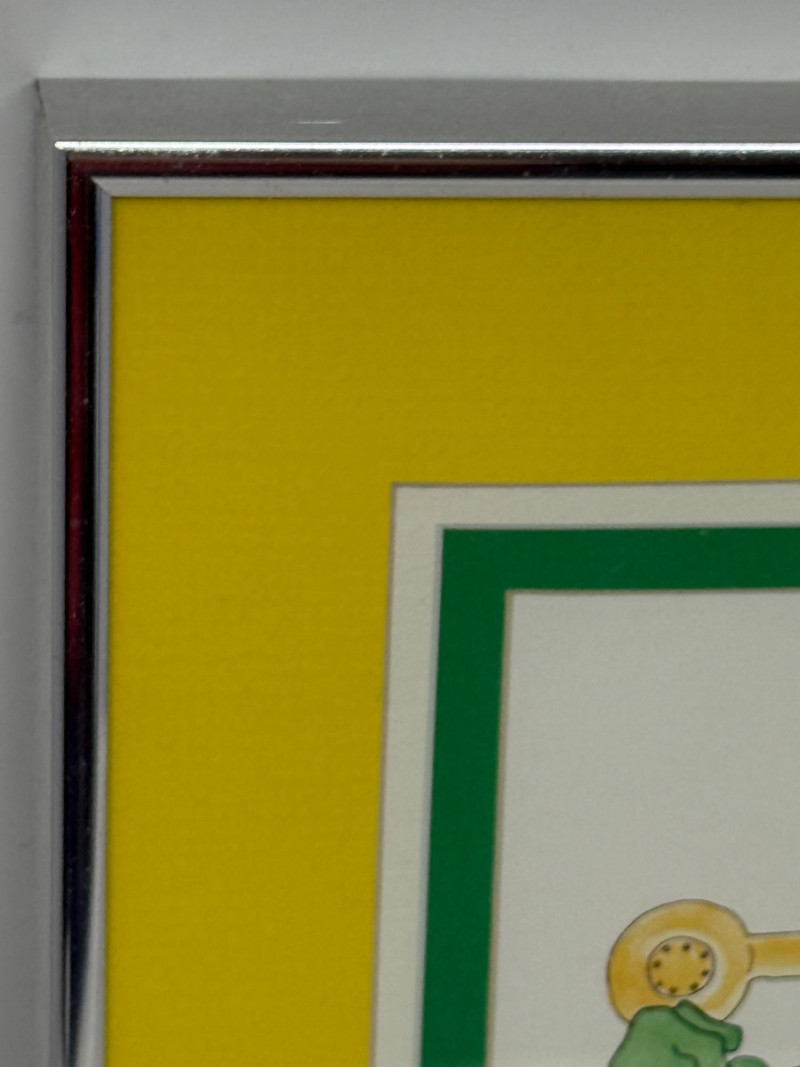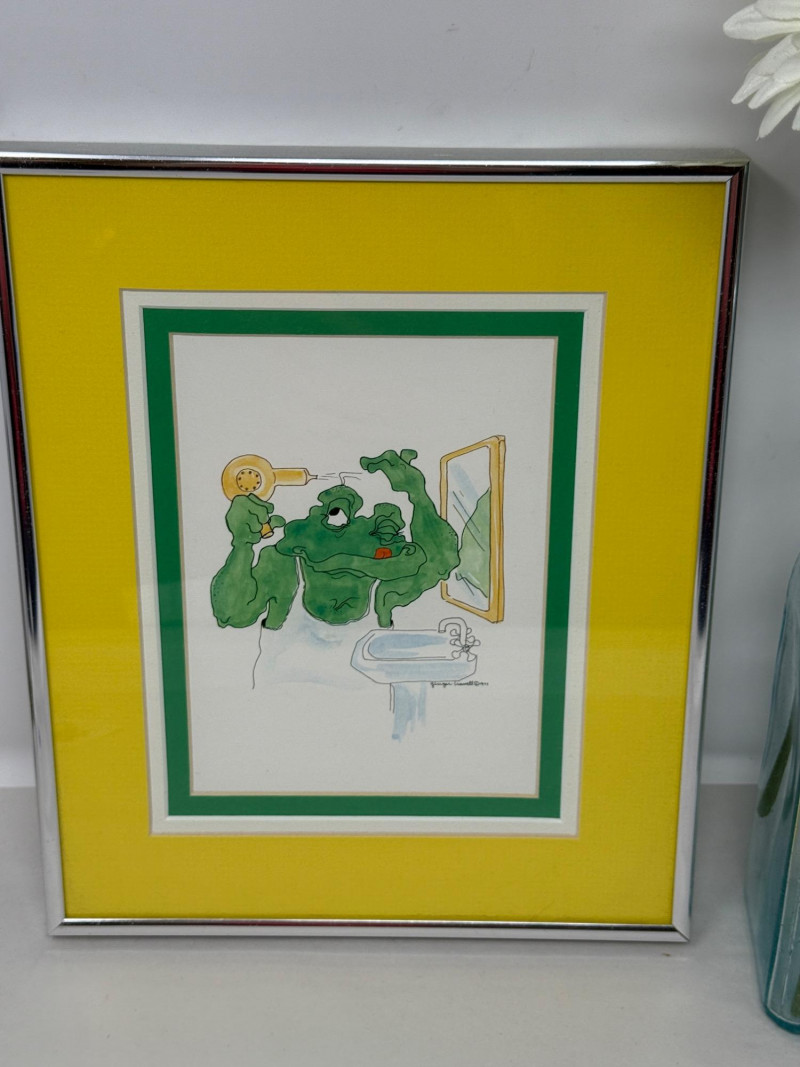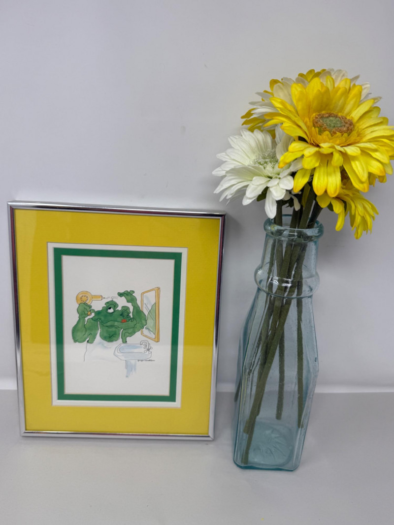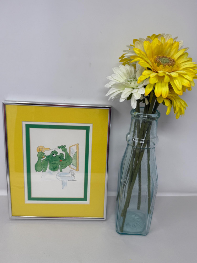 Bathroom Watercolor Print & Vase Yellow and green matted art under glass in brushed silver metal frame. 9.25x11”