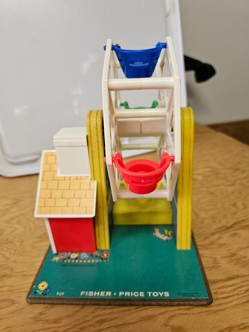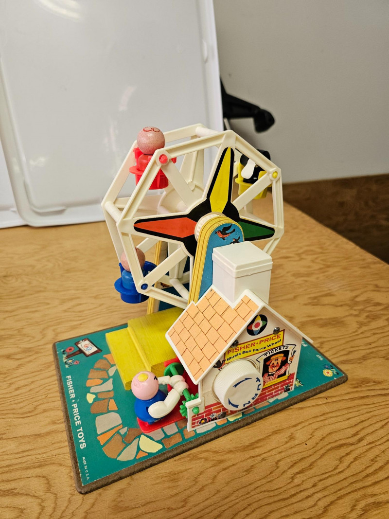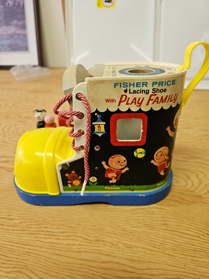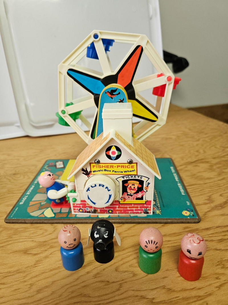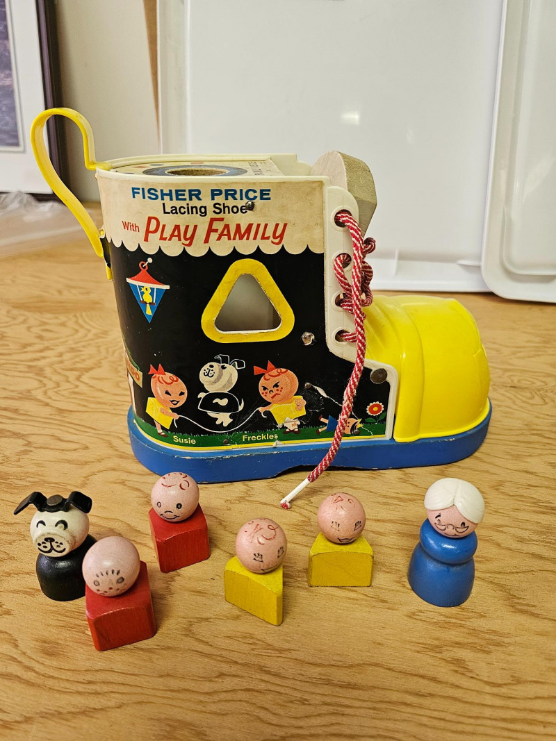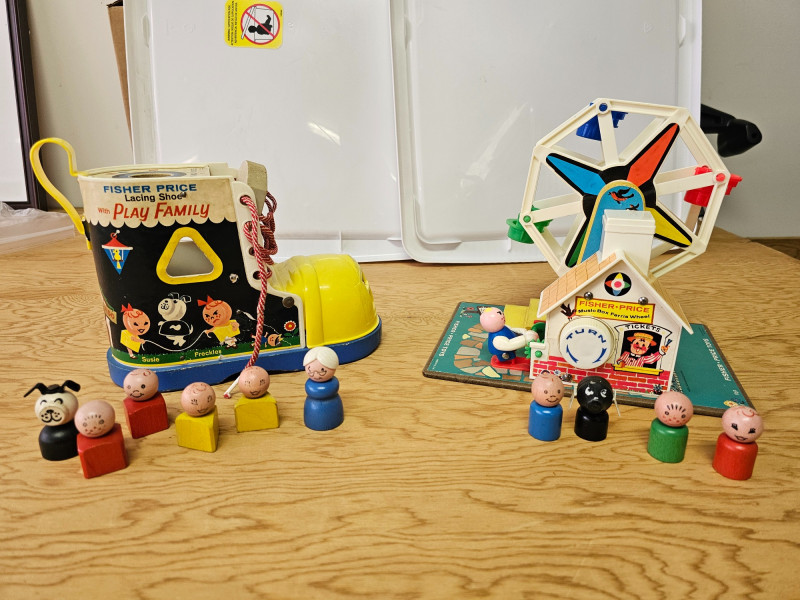 Fisher Price Music Box Ferris Wheel & Lacing Shoe With Play Family 1966 Fisher Price Music Box Ferris Wheel #969 Includes 3 kids & 1 dog. Toy works and plays music when wound 1965 Fisher Price Lacing Show With Play Family #136 Includes 4 kids, 1 dog, and 1 grandma Vintage toys have been played with but appear in good condition (see pics).