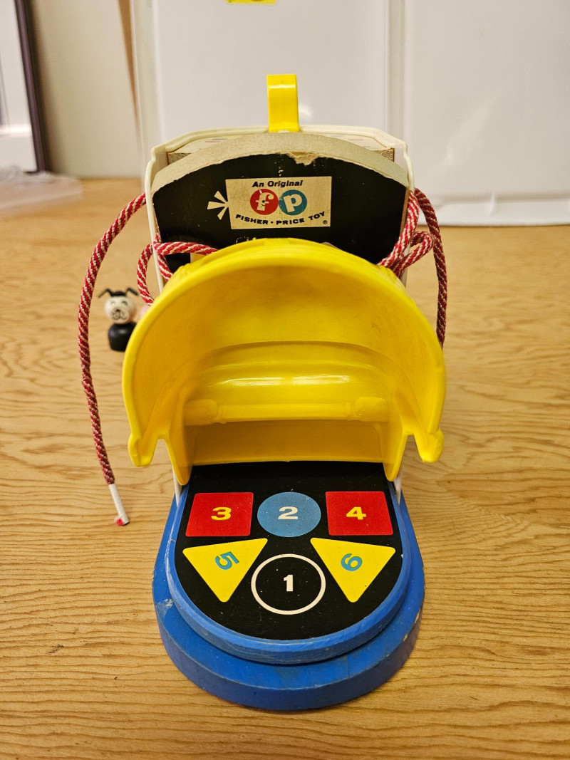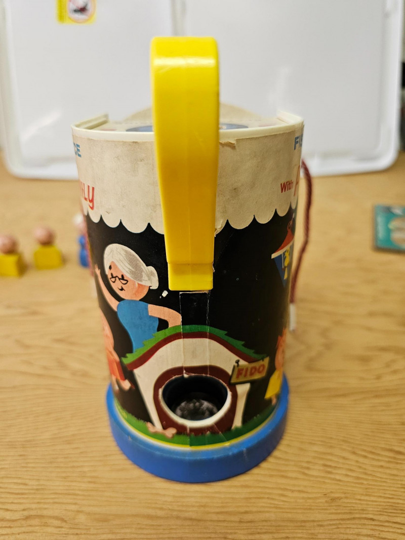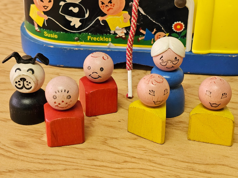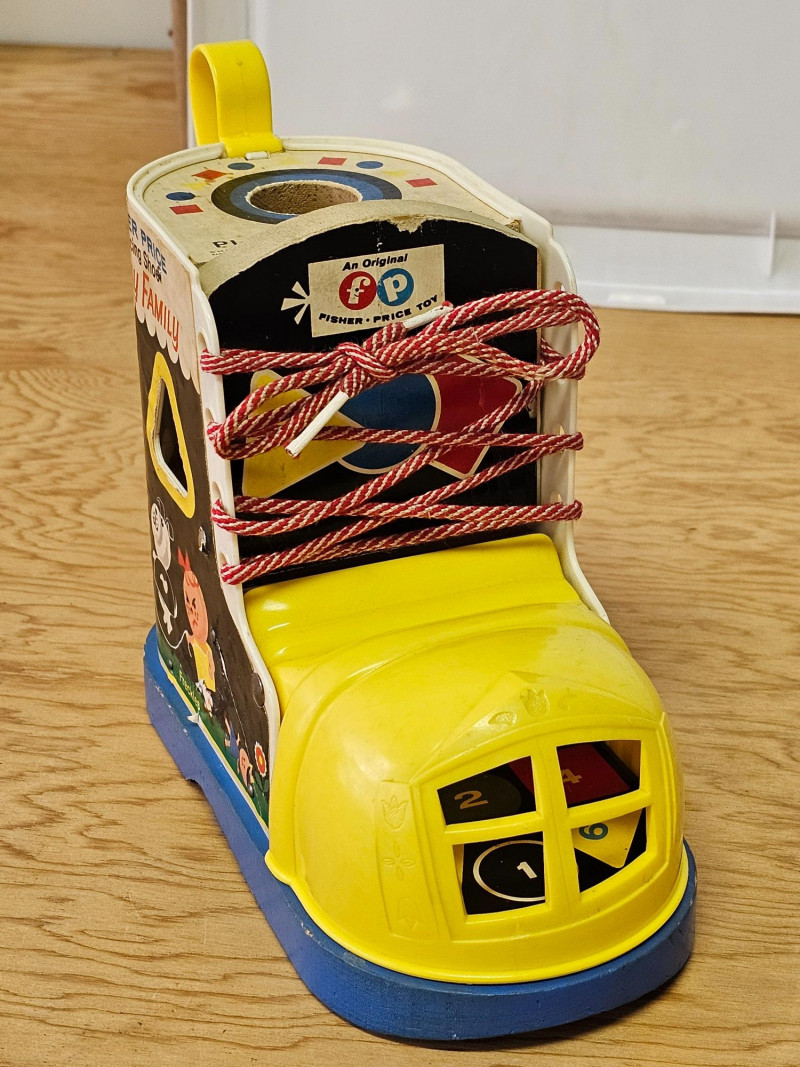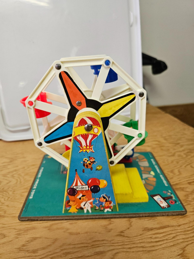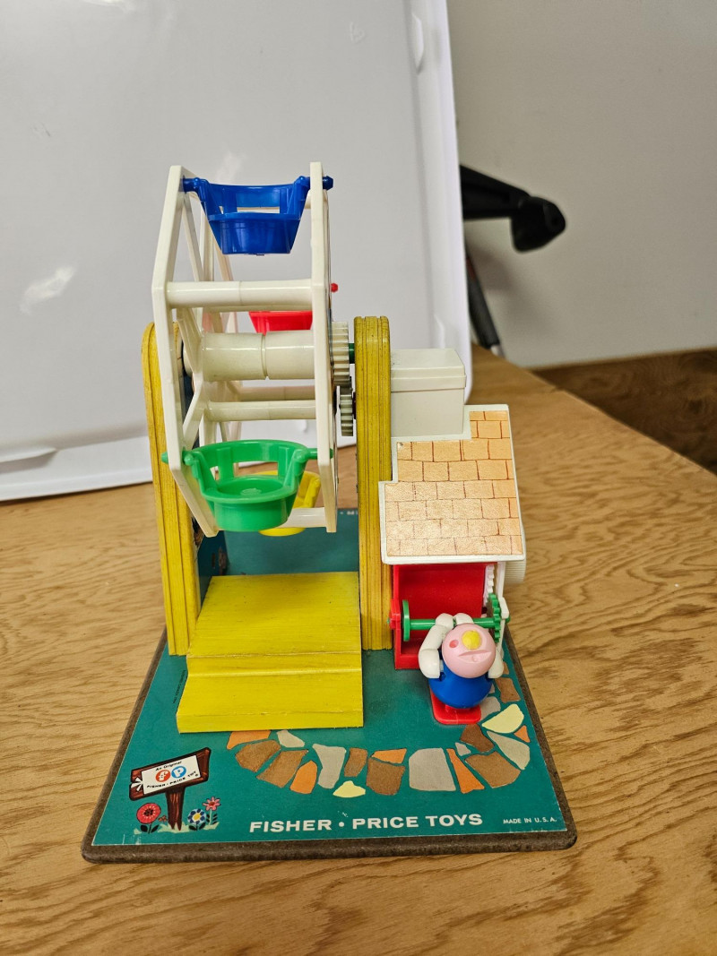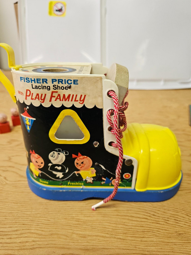 Fisher Price Music Box Ferris Wheel & Lacing Shoe With Play Family 1966 Fisher Price Music Box Ferris Wheel #969 Includes 3 kids & 1 dog. Toy works and plays music when wound 1965 Fisher Price Lacing Show With Play Family #136 Includes 4 kids, 1 dog, and 1 grandma Vintage toys have been played with but appear in good condition (see pics).