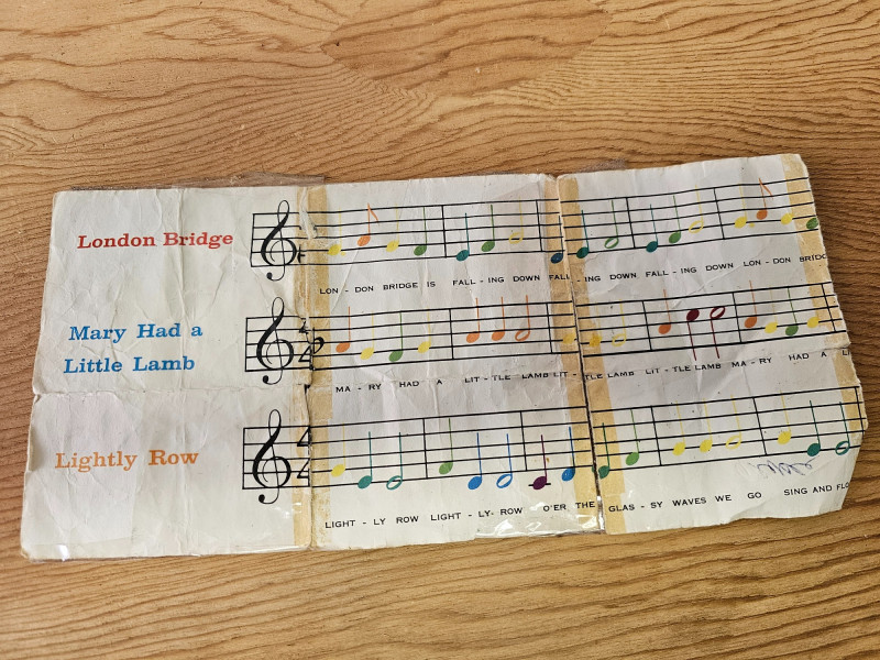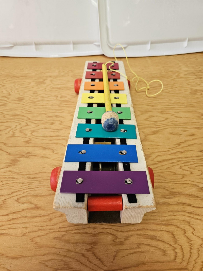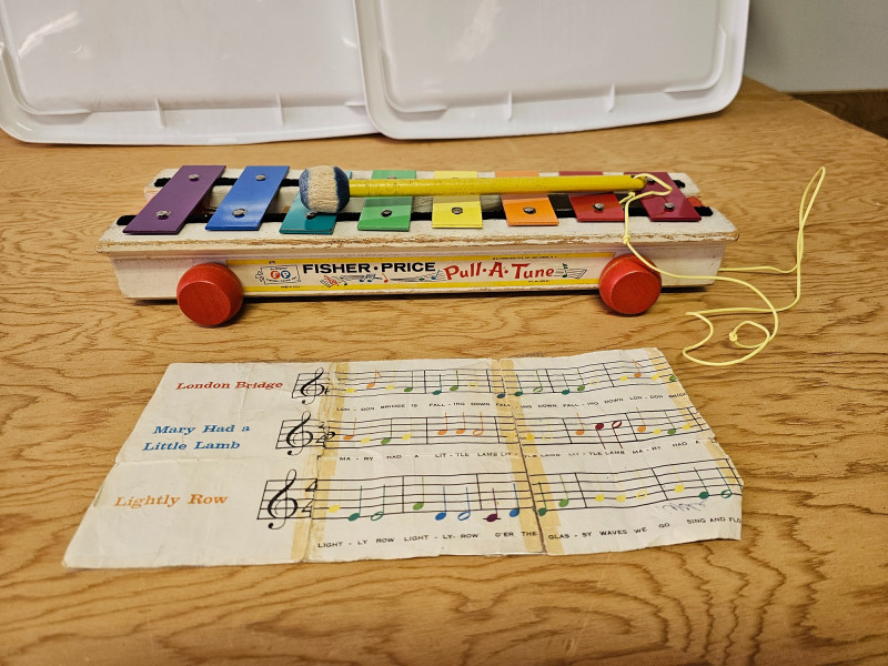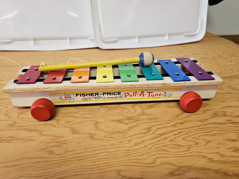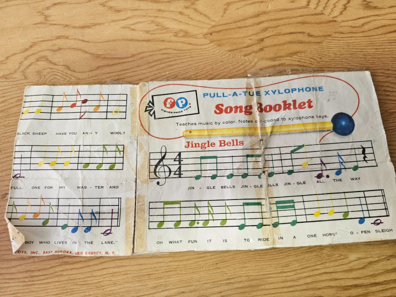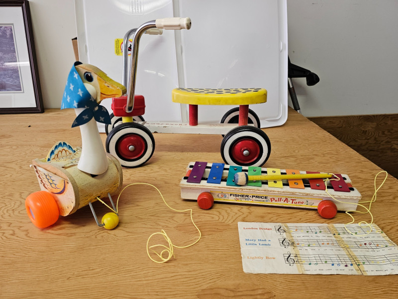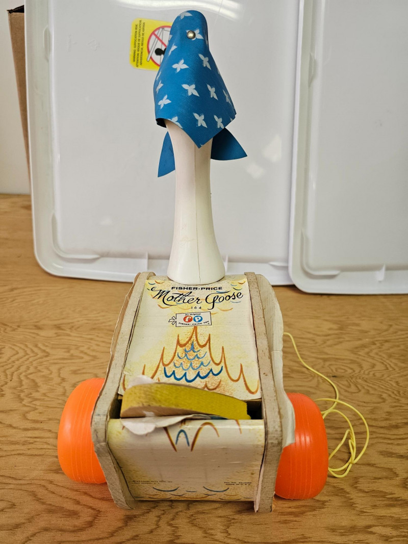 Fisher Price Mother Goose & Pull-A-Tune, Playskool 4-Wheel Scooter 1964 Fisher Price Mother Goose Pull Toy (#164) stickers are peeling but intact 1964 Fisher Price Pull-A-Tune (#870) includes original sheet music Vintage Playskool 4-Wheel Scooter Everything appears to work as it should! Vintage toys have been played with but appear in good condition (see pics).