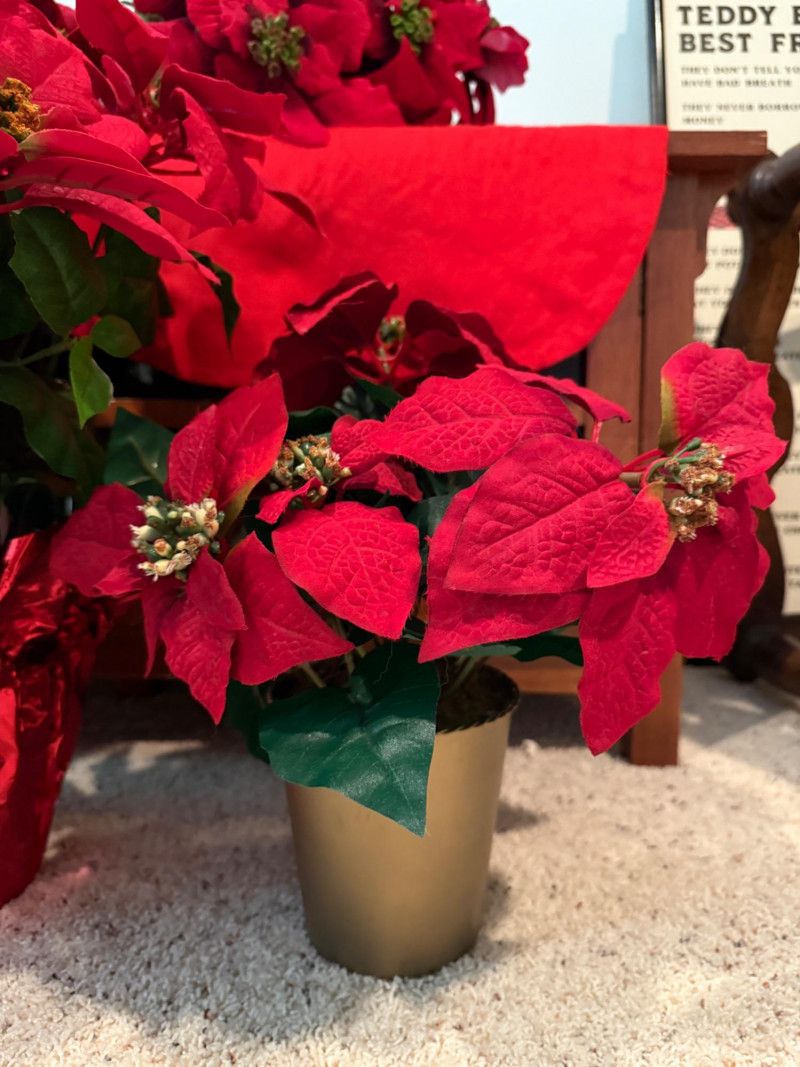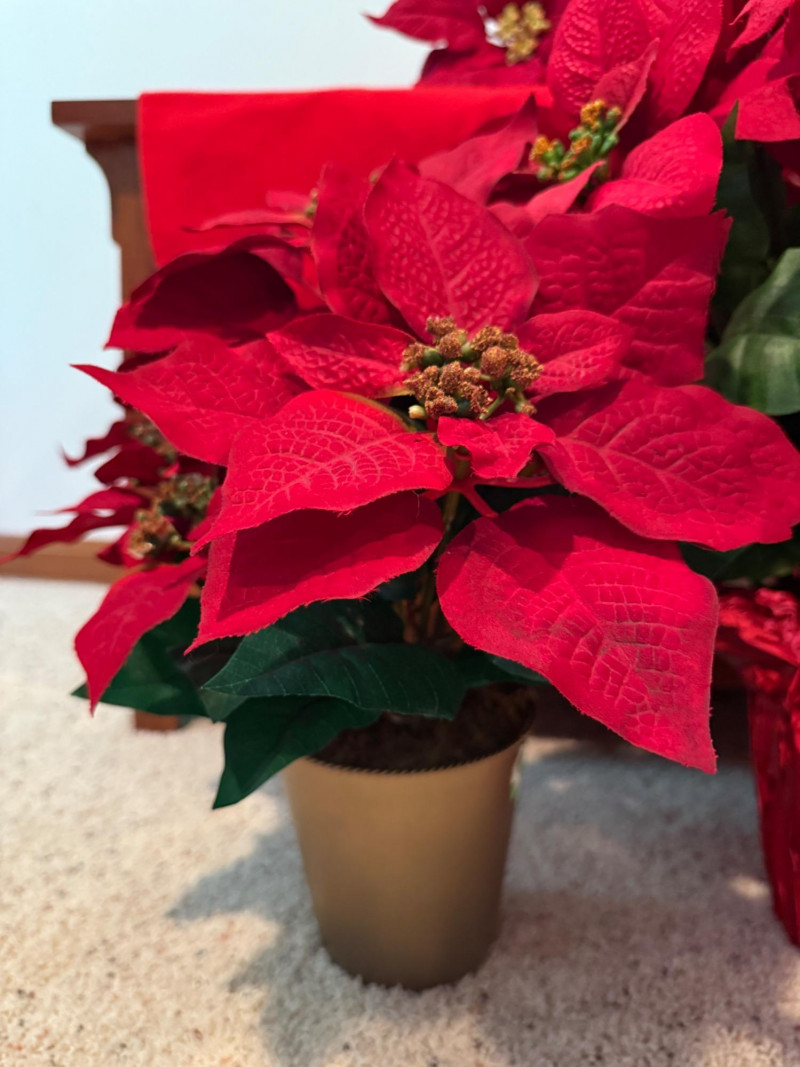 3 Potted Faux Poinsettias & Large Bundle of Premium Picks (2) 5” pots x15” tall 1 7” pot x 20” tall Bundle of stems/picks, see photos.