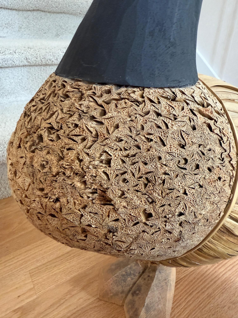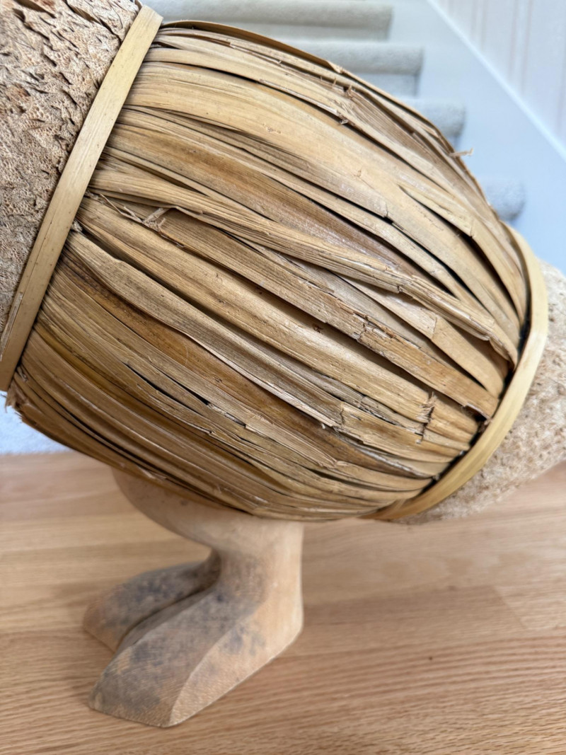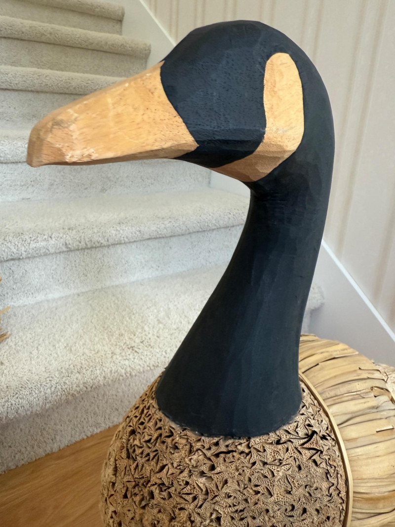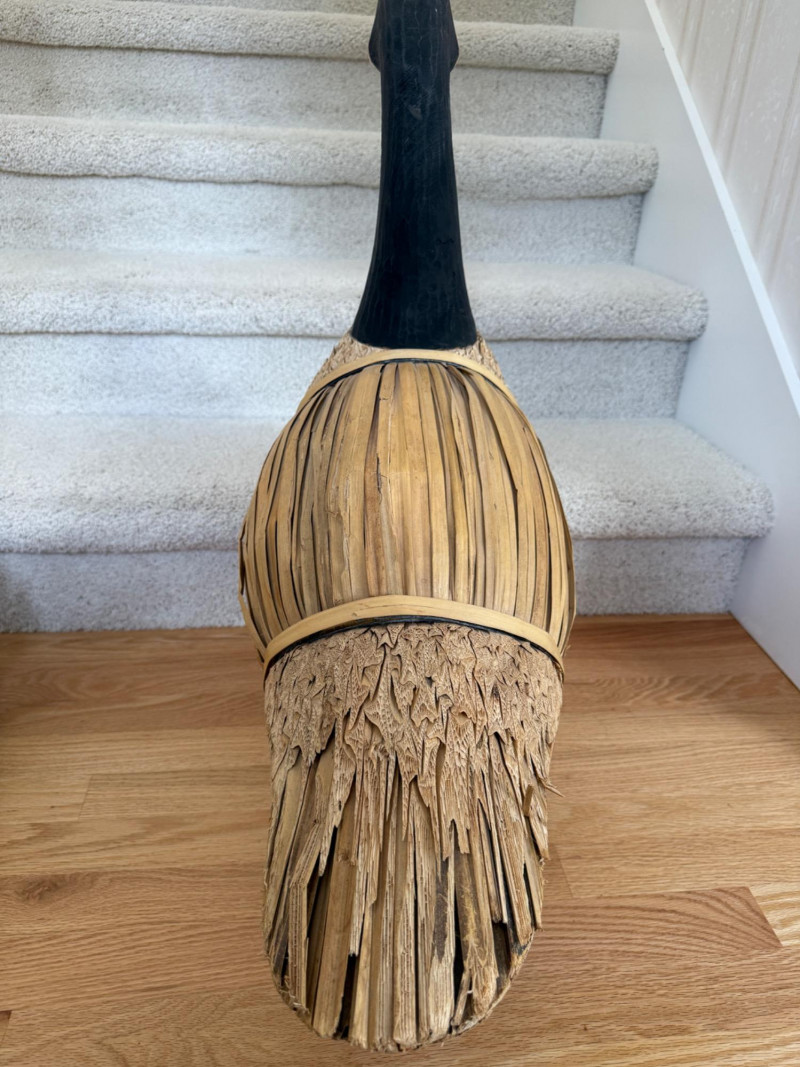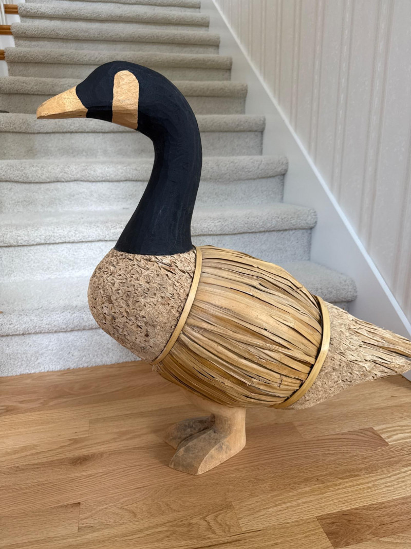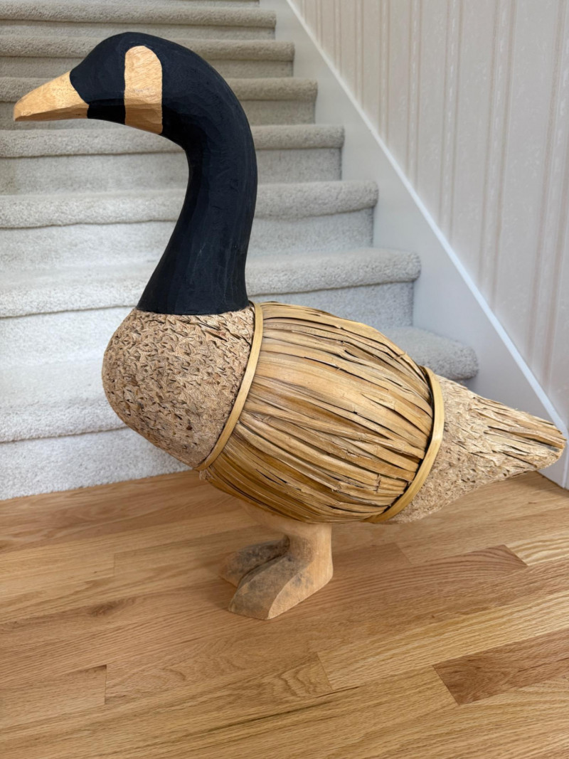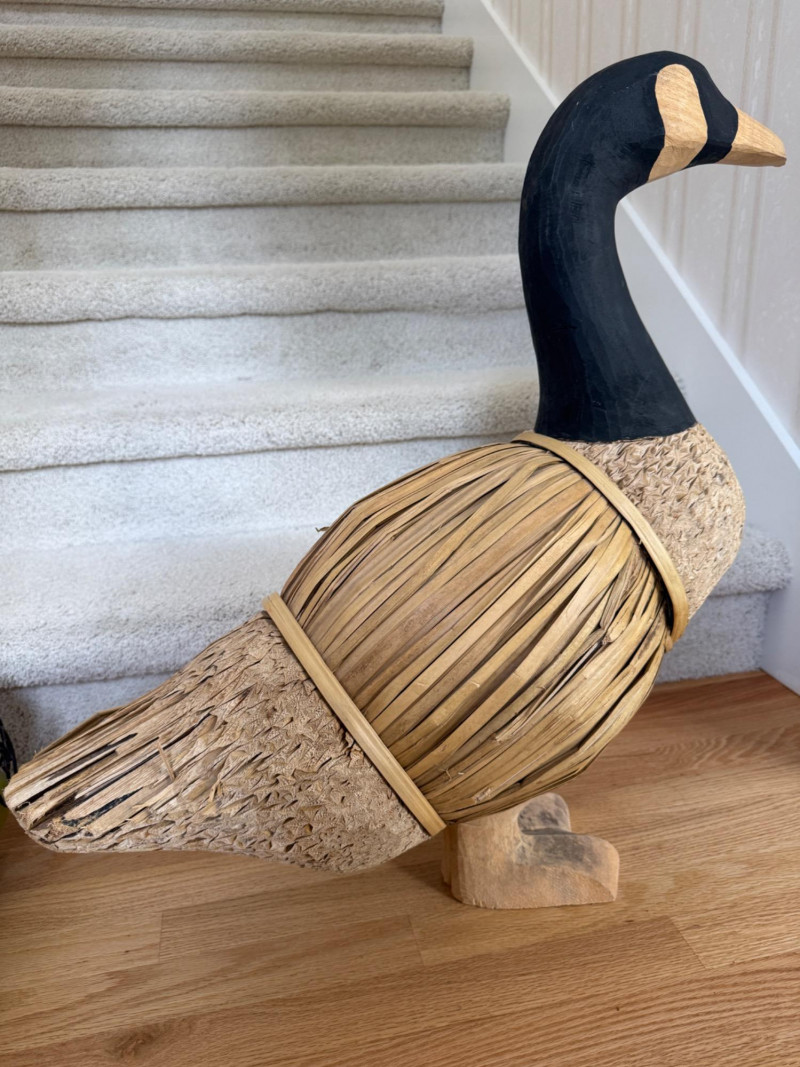 Features a carved wooden head and feet, with the body constructed from corn husks, straw, or reed Life Size Vintage Canada Goose Decoy Measures 25x9x26.5” tall.