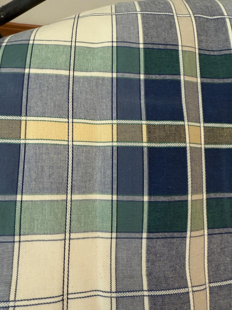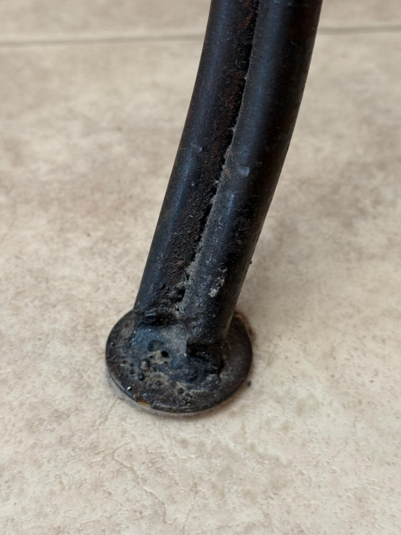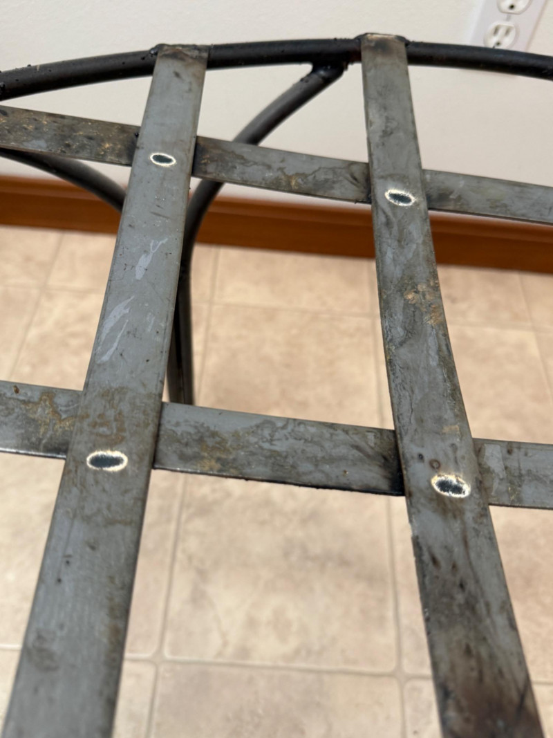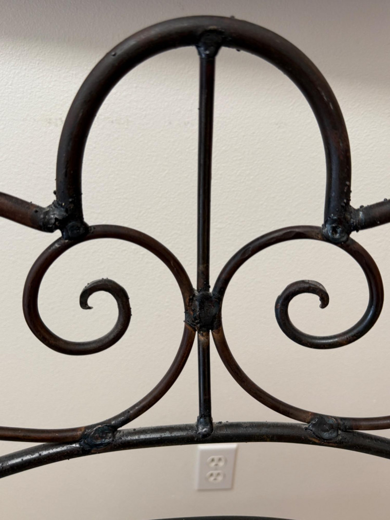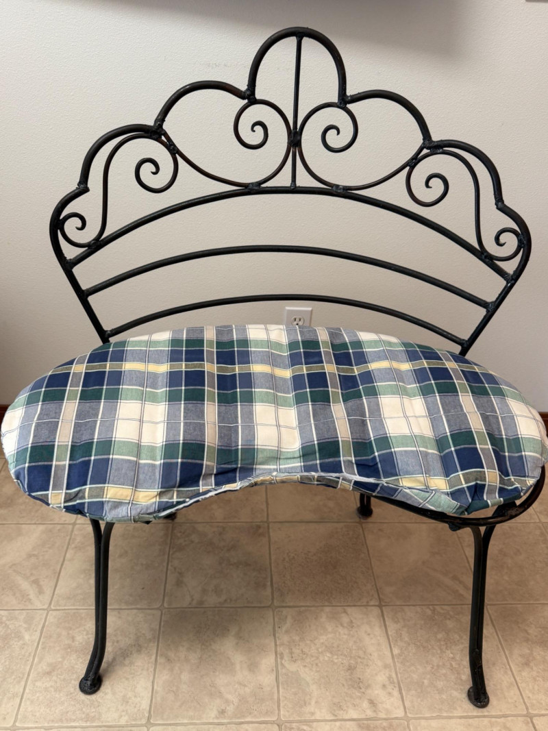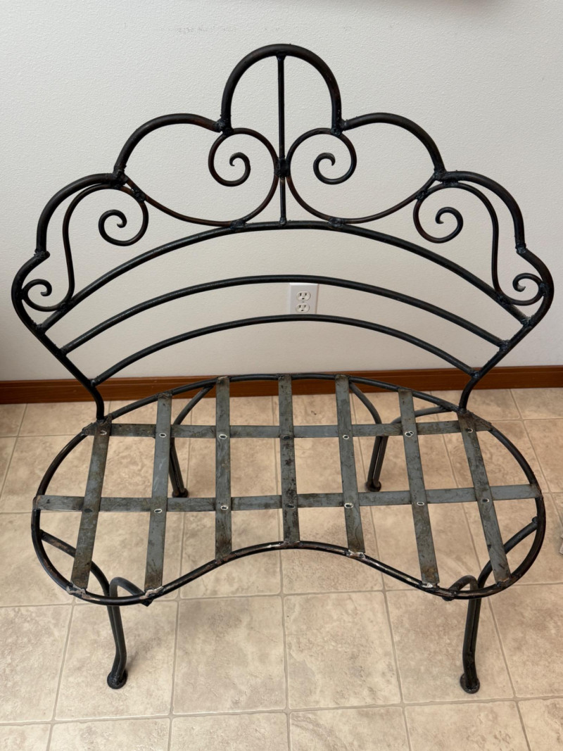 Curved High Scroll Back Iron Bench with Cushion 33x20x41” tall. Seat height is 18” Metal tag with numbers is attached to the right front leg.
