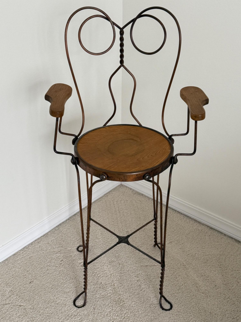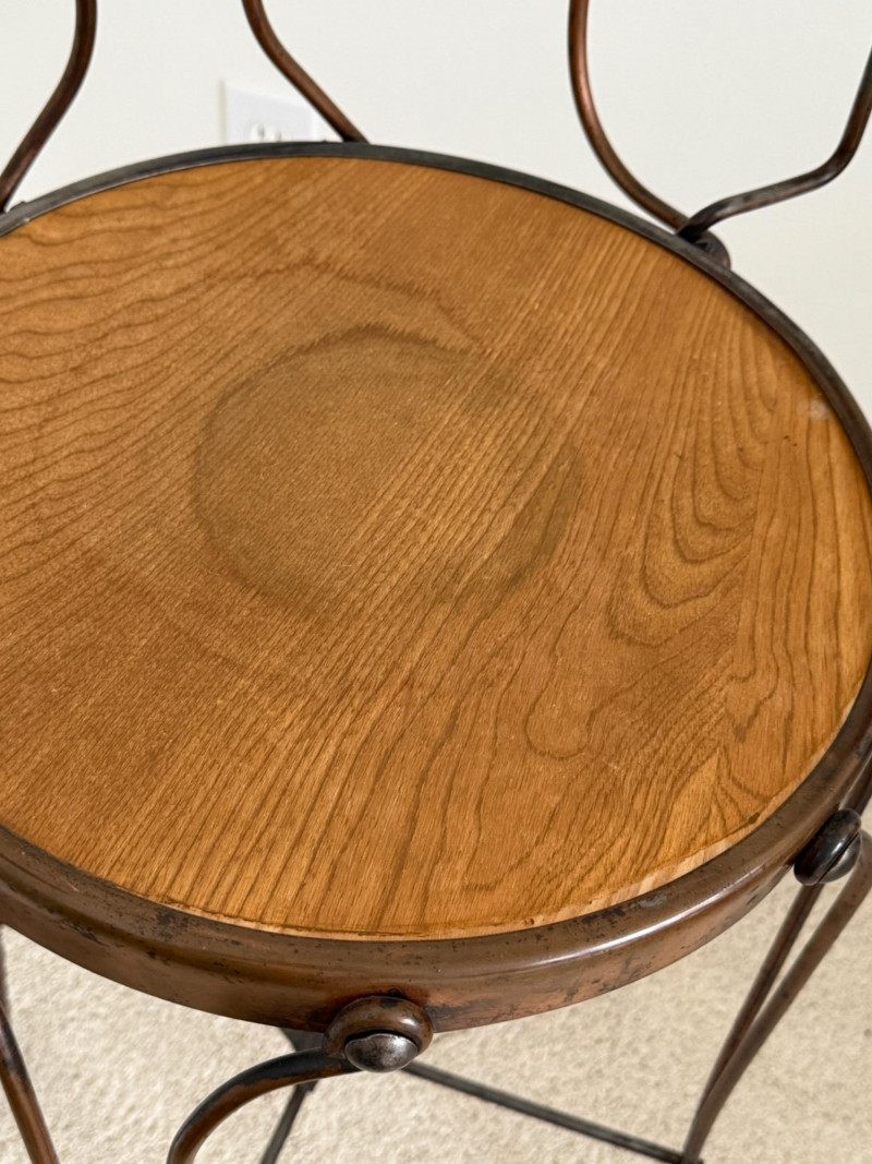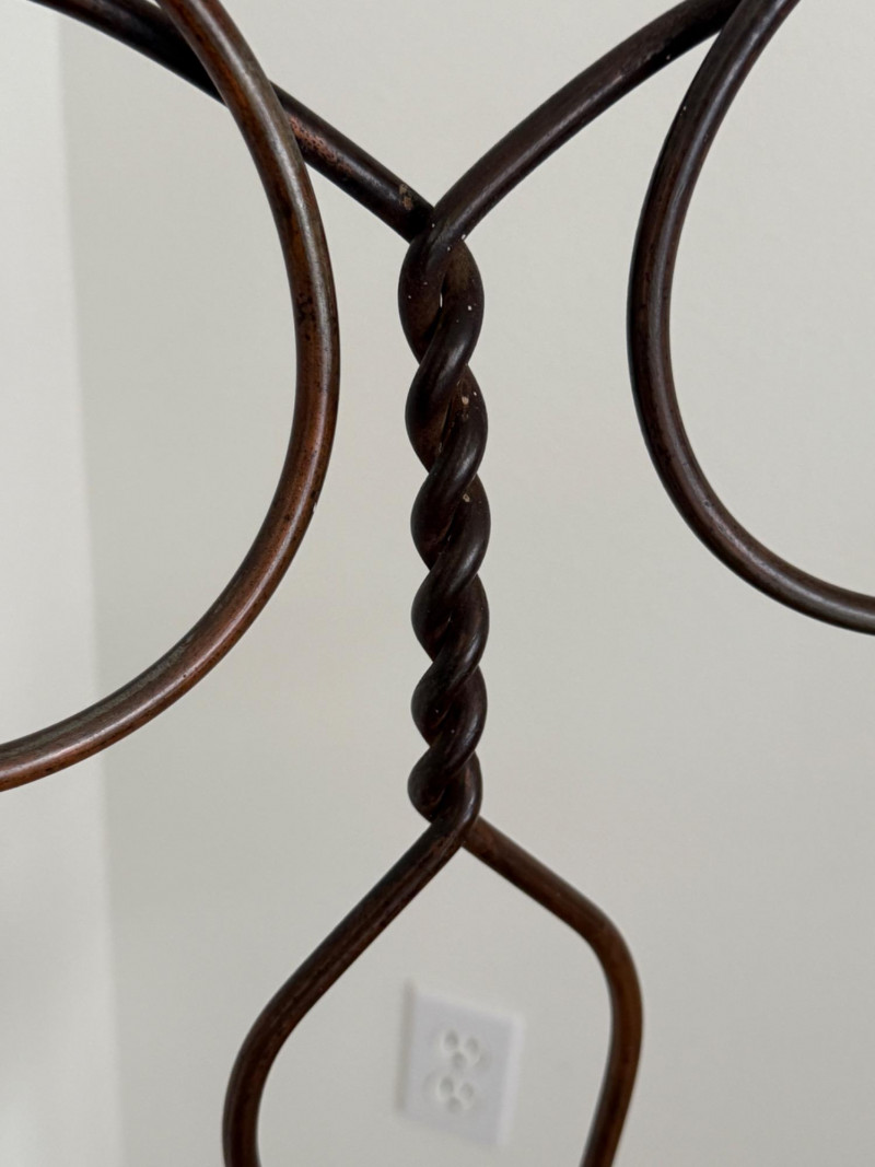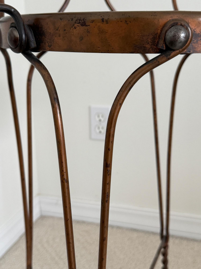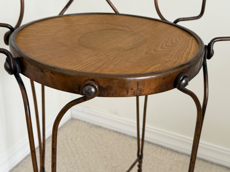 Cool twisted copper metal chair with wood seat and arms. Studded detail around the seat. MY have been used as a plant stand.