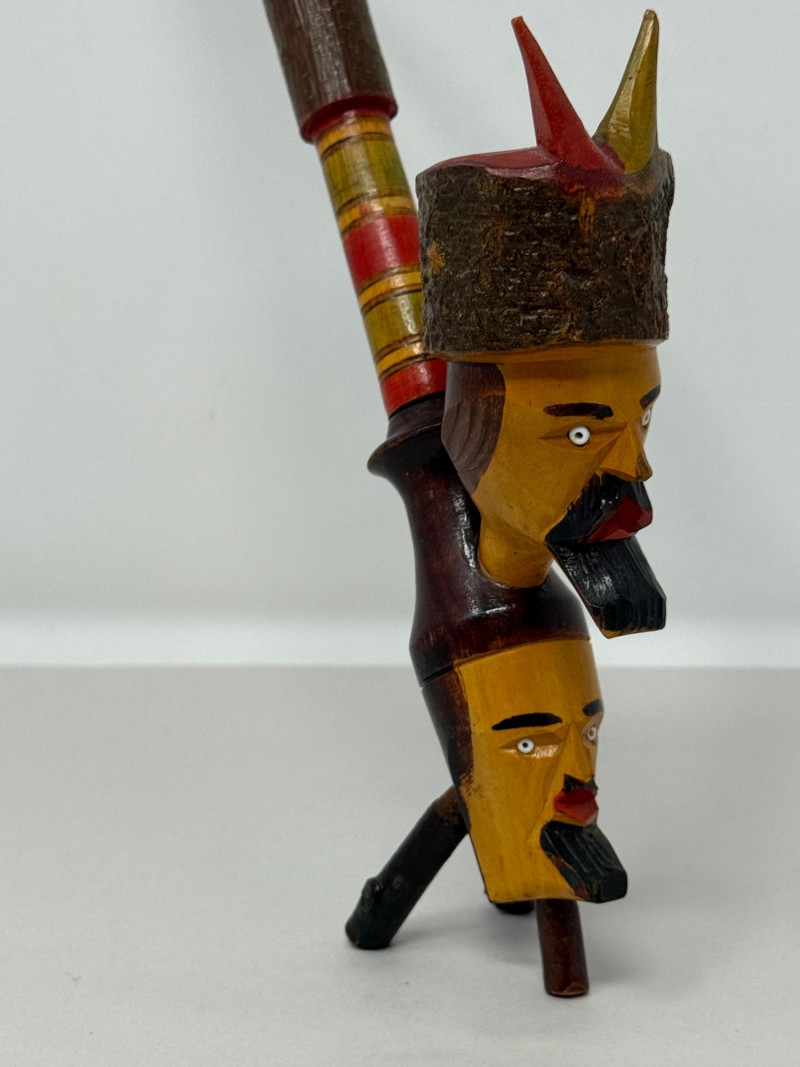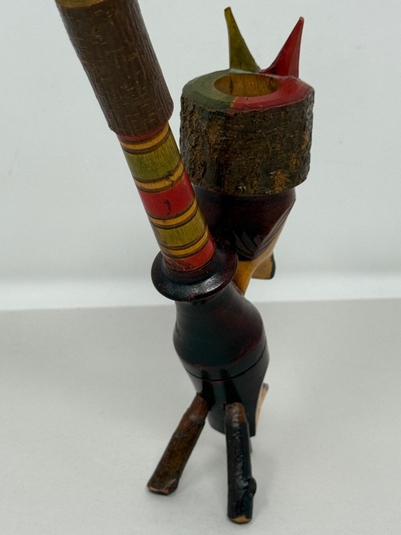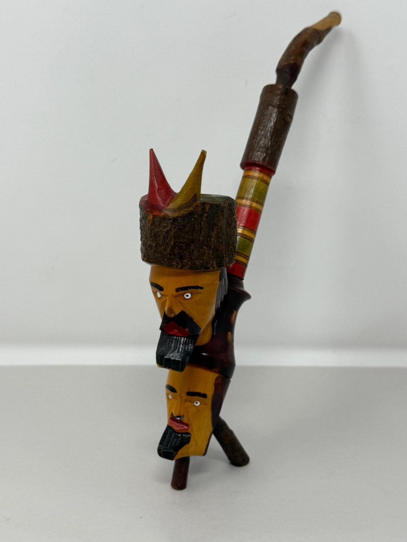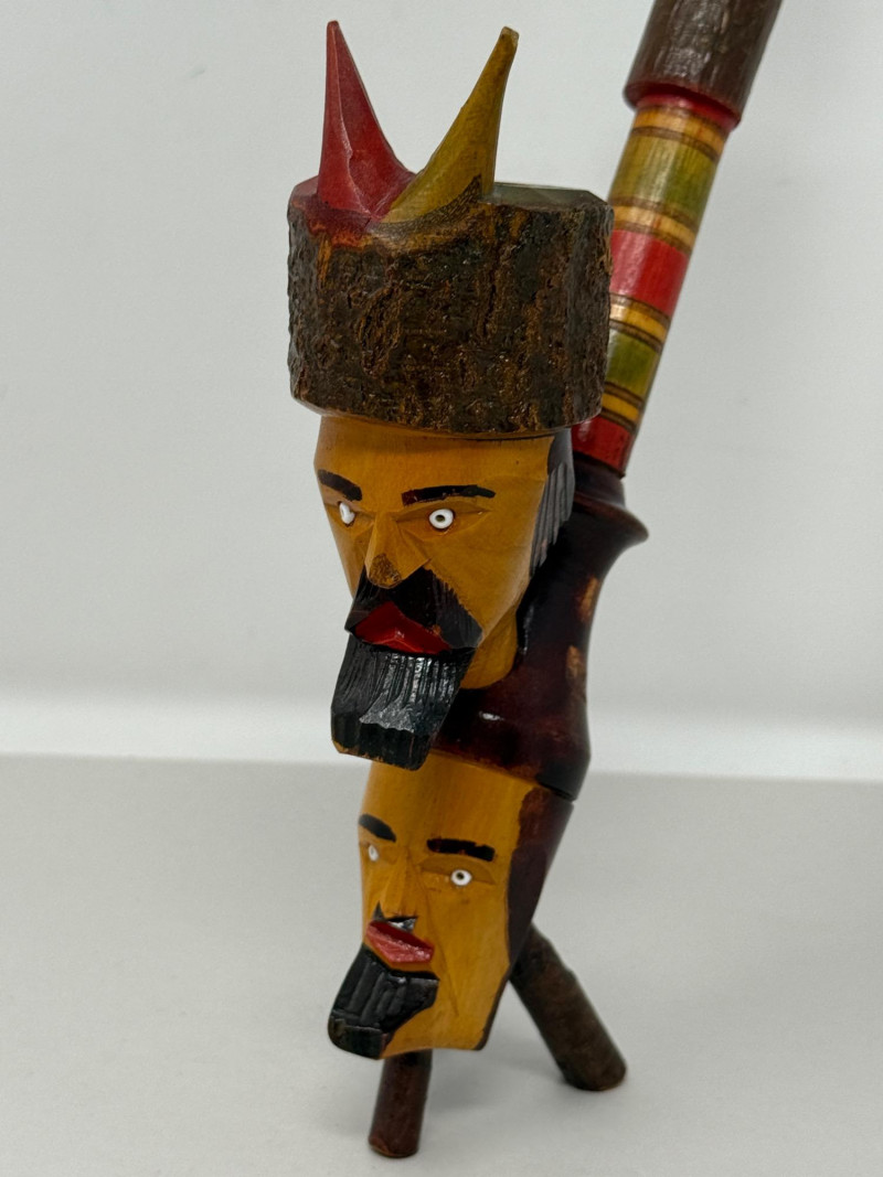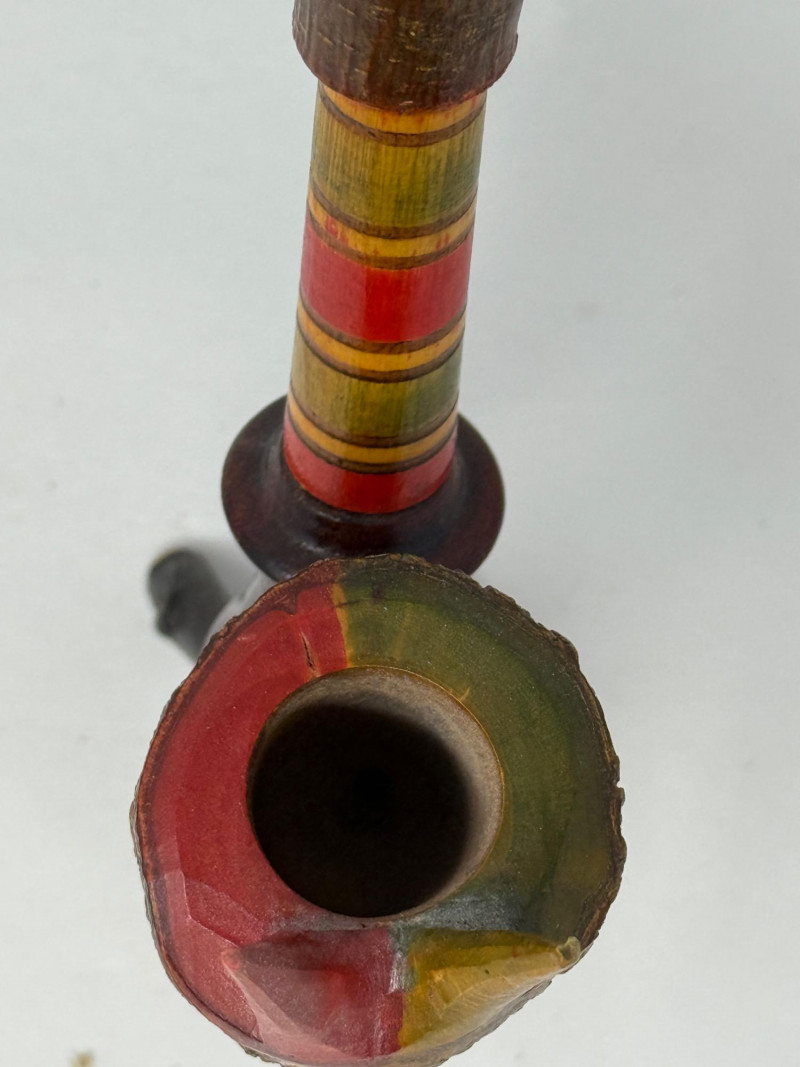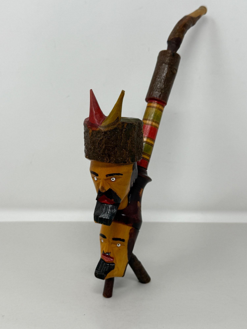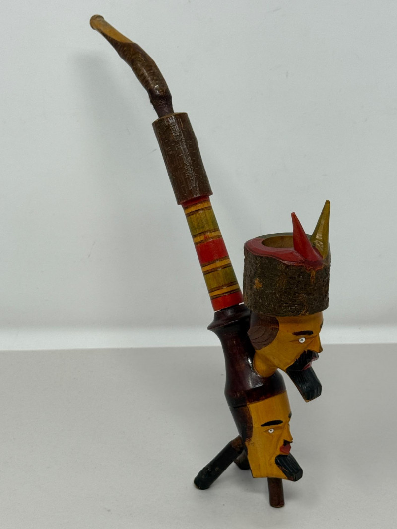 Double Face Wood Smoking Pipe - Never Used Folk Art pipe with removable top head 9” tall x 1.75” wide