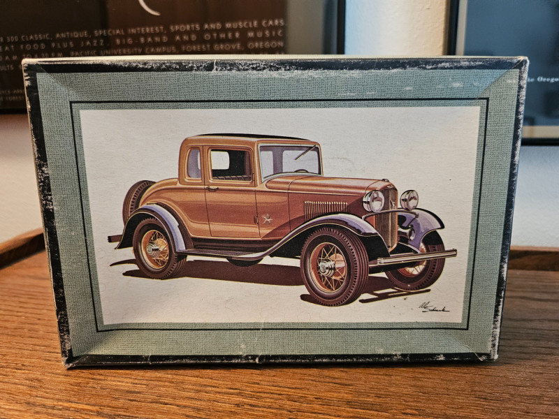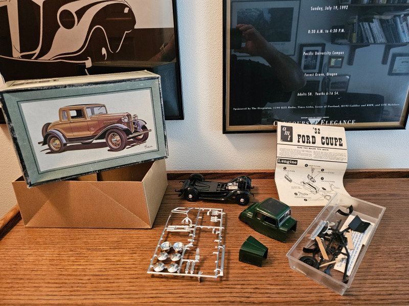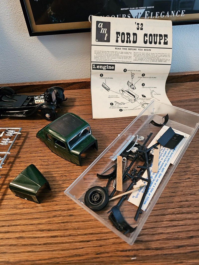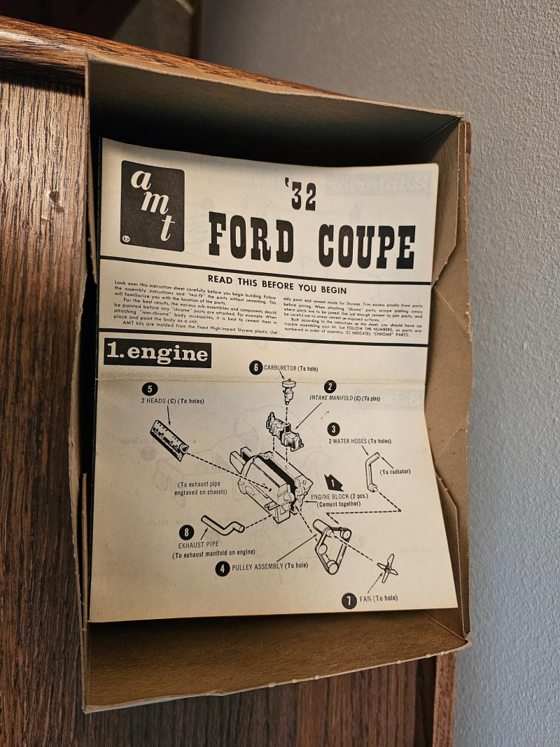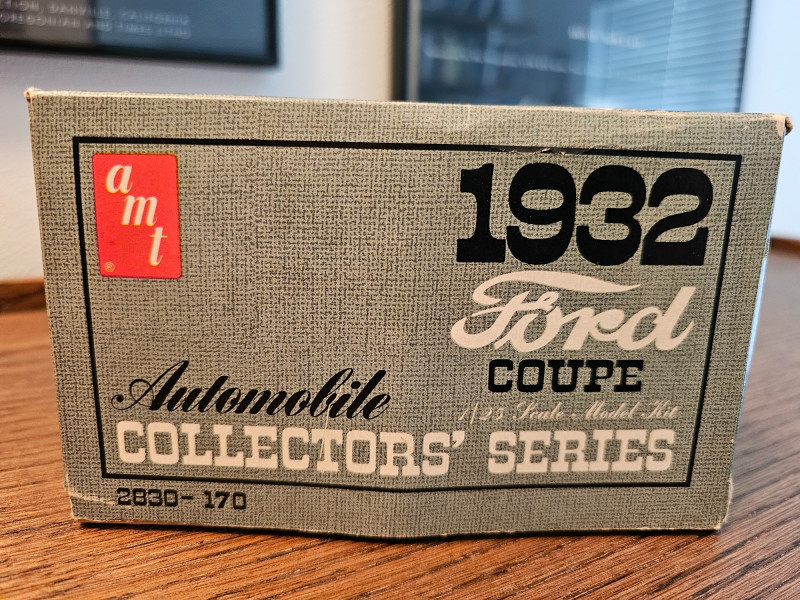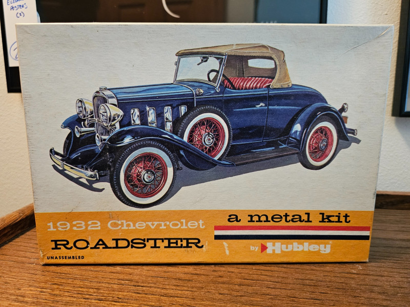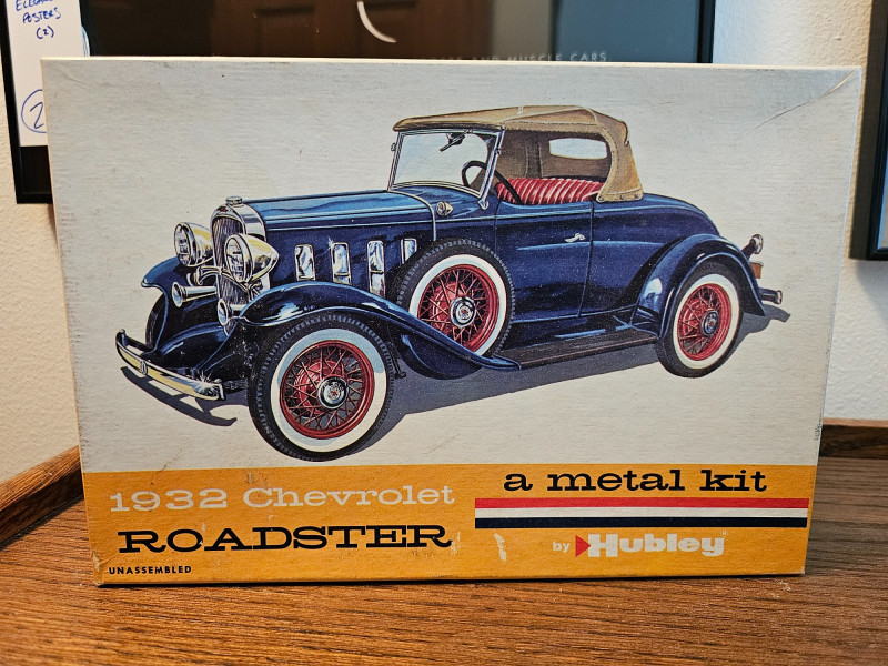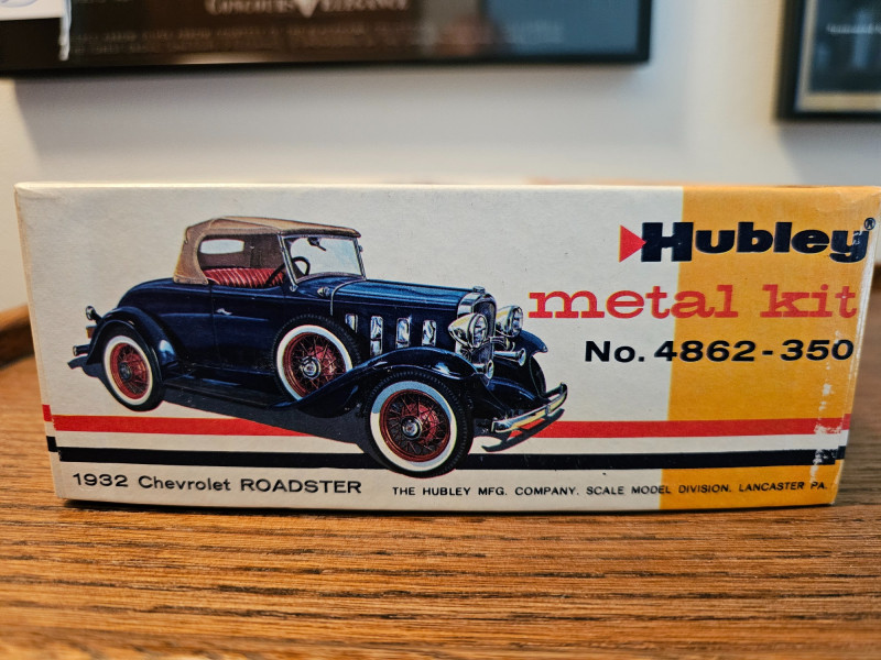 1960s Unassembled Hubley 1932 Chevrolet Roadster Metal Kit Hubley Model #4862-350 Metal model kit is completely unassembled in original box, with some parts still sealed in original plastic bags (some bags have been opened). Original box while not perfect is in very nice condition with great color illustrations on the model cars 3"T x 10.5"W x 7"D Bonus! Included is a 1970s partially assembled AMT 1932 Ford Coupe plastic model kit in original box AMT Model #2030-170 Plastic model kit still has some "chrome pieces" still attached and unused. Chassis, engine and wheels appear to be done. A couple of cool nostalgia pieces! 4"T x 9.25"W x 6.25"D
