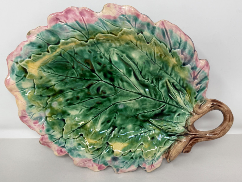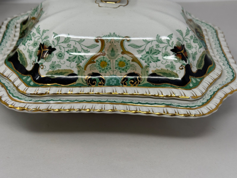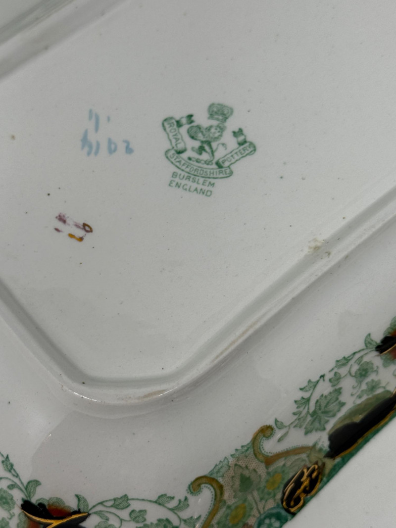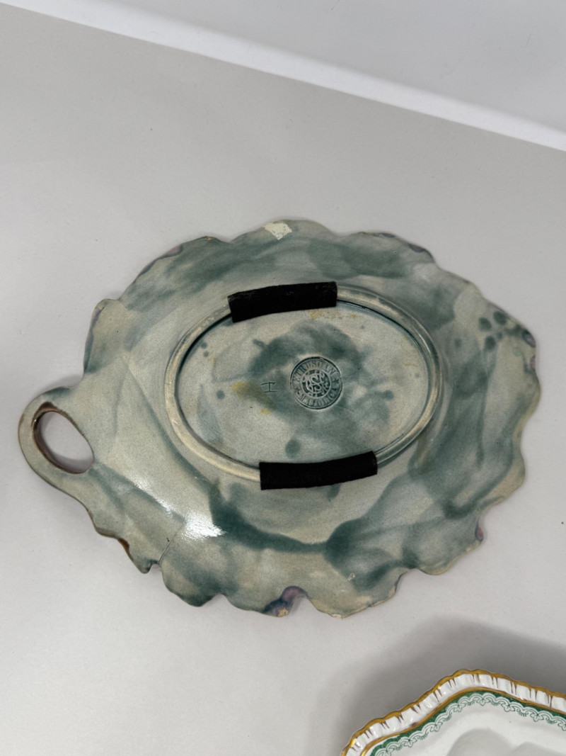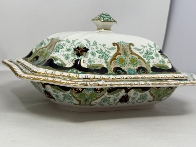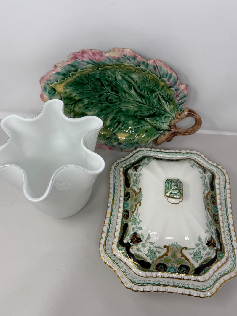 English RSP Covered Tureen - Majolica Plate - White Glass Vase Burslem England Royal Staffordshire Pottery Covered Tureen. Green, black and gold 10.5x8.5” Leaf Majolica Plate White Glass Vase
