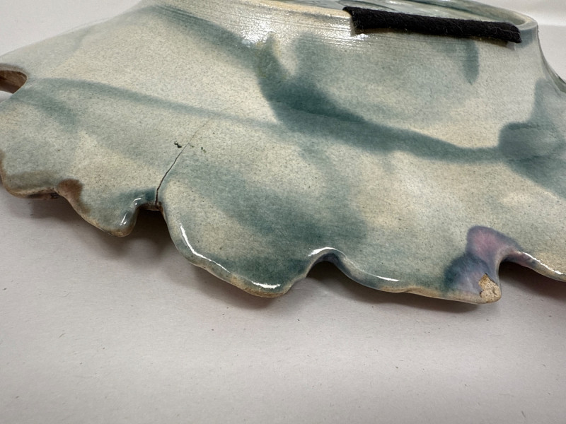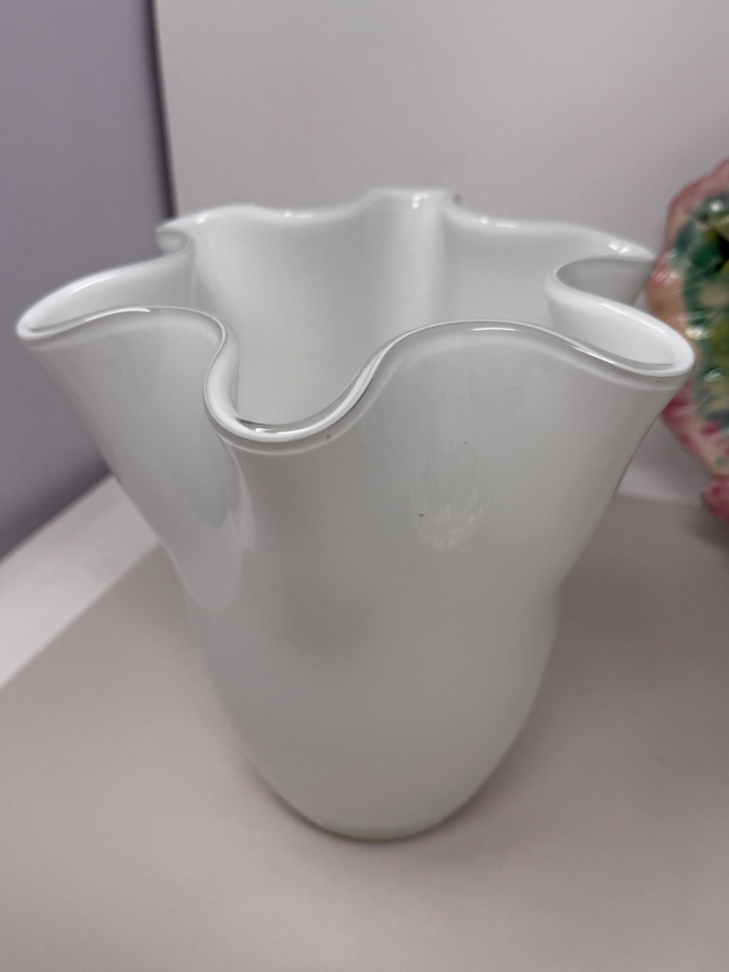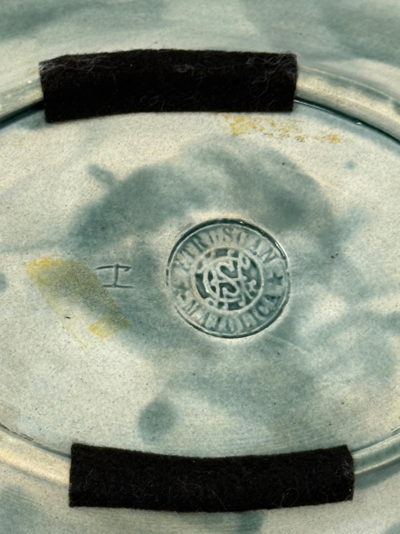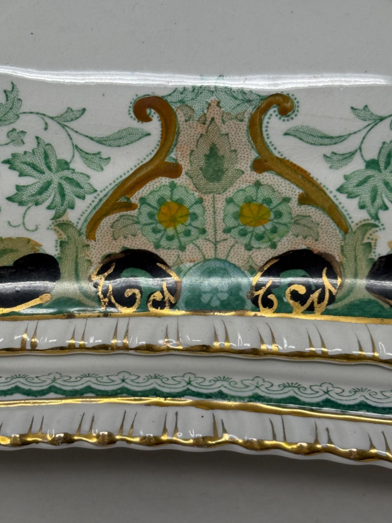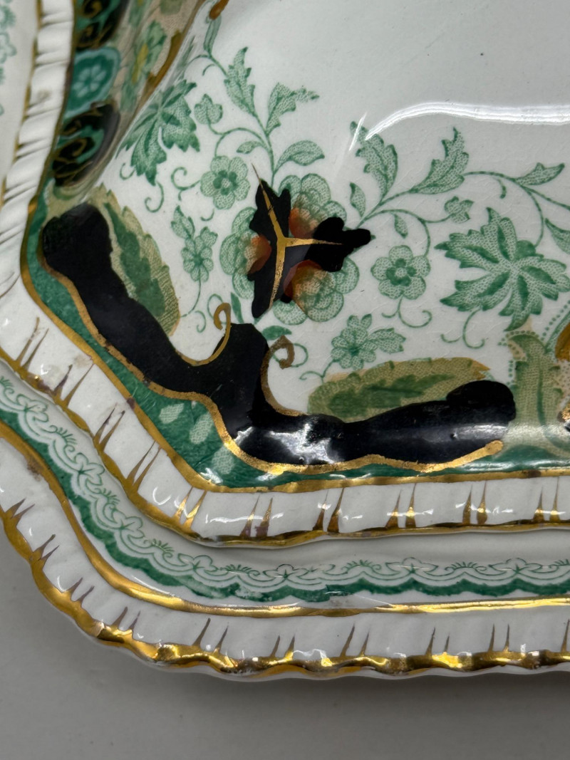 English RSP Covered Tureen - Majolica Plate - White Glass Vase Burslem England Royal Staffordshire Pottery Covered Tureen. Green, black and gold 10.5x8.5” Leaf Majolica Plate White Glass Vase