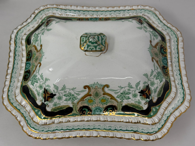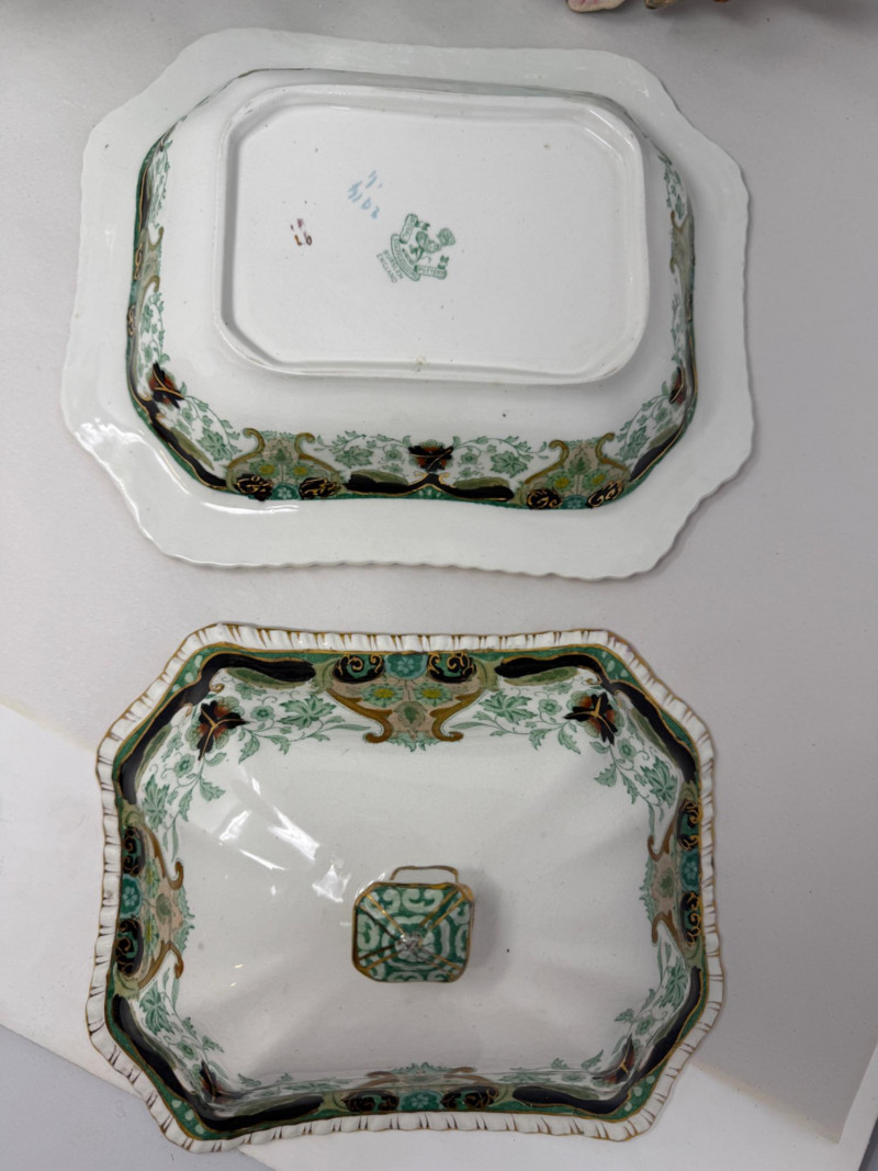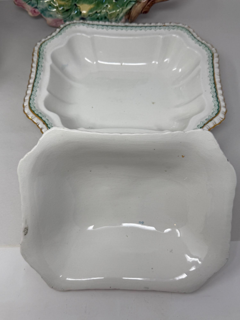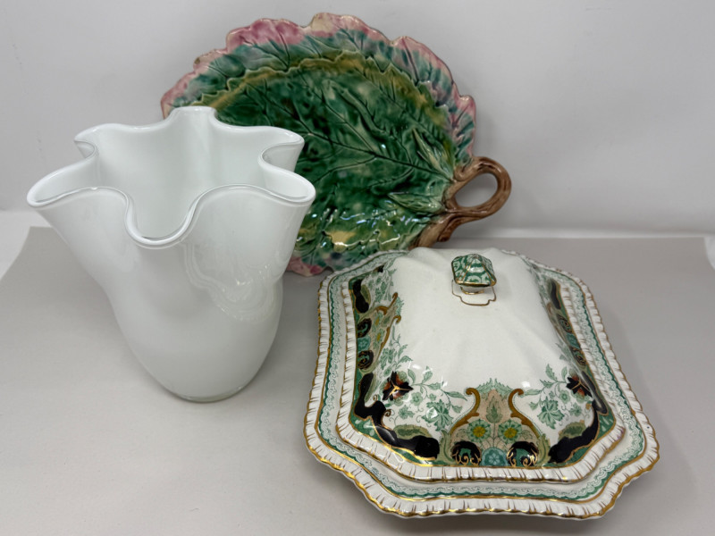 Lot # 237 - English RSP Covered Tureen - Majolica Plate - White Glass Vase