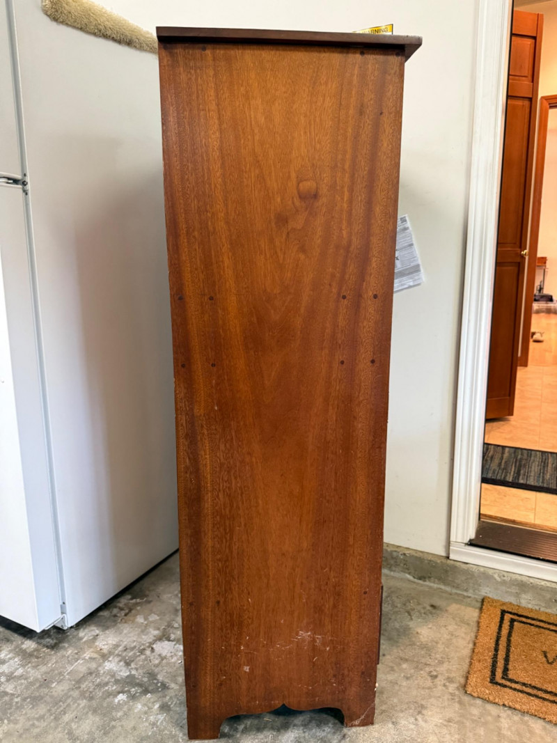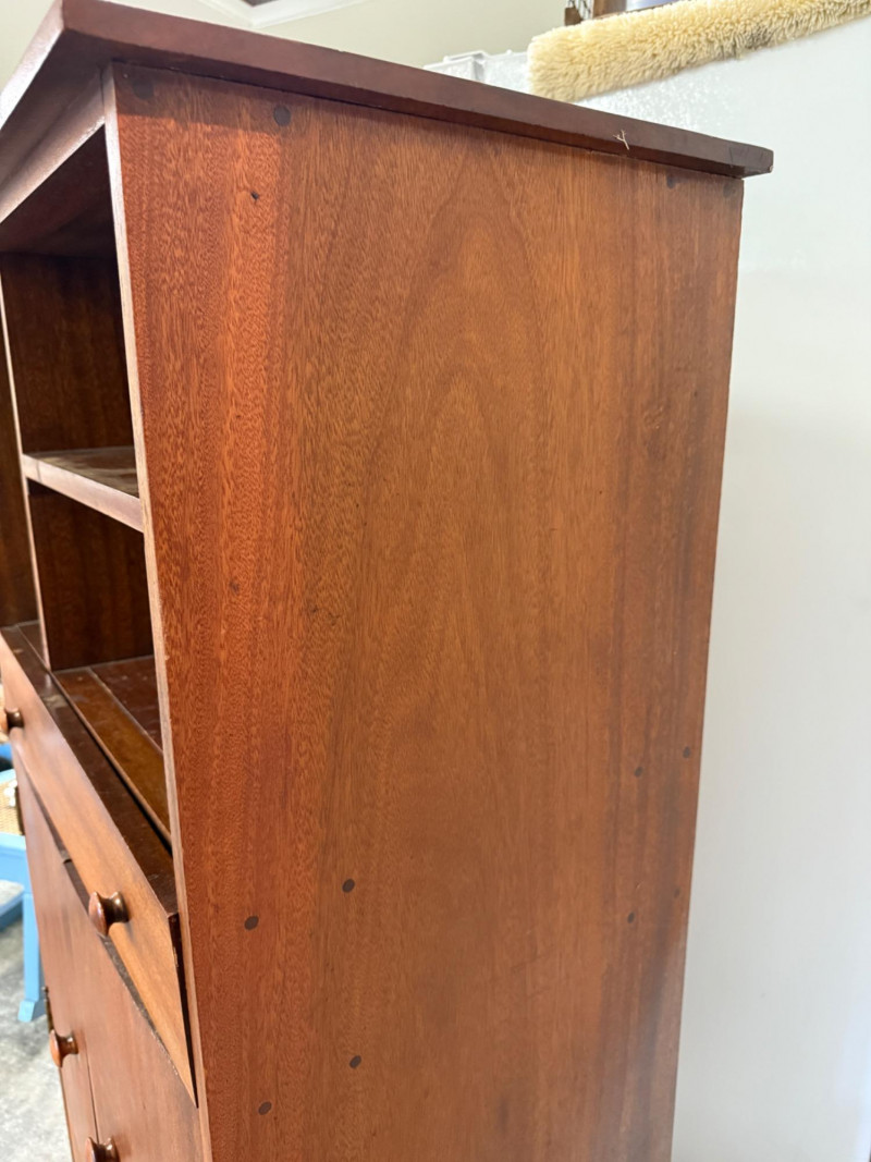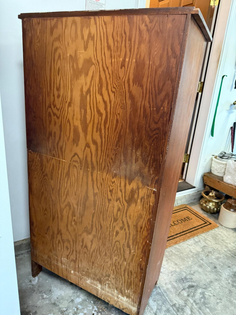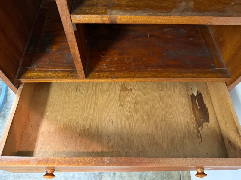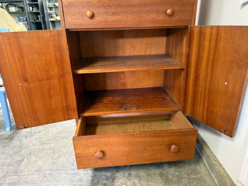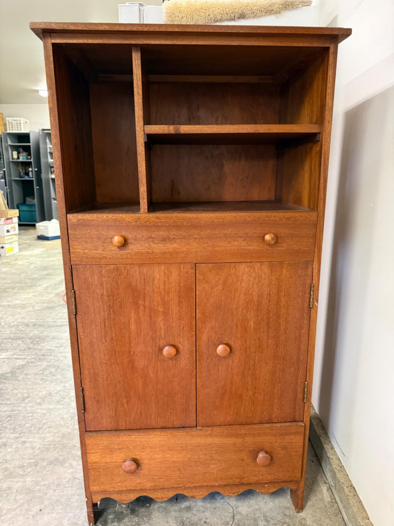 This is a vintage oak storage hutch with drawers, shelves, and cabinet space. 29x17.5x56”
