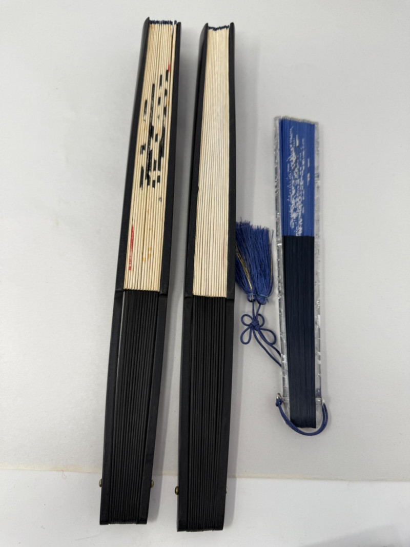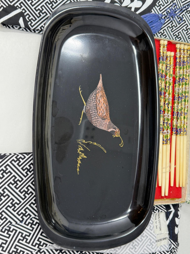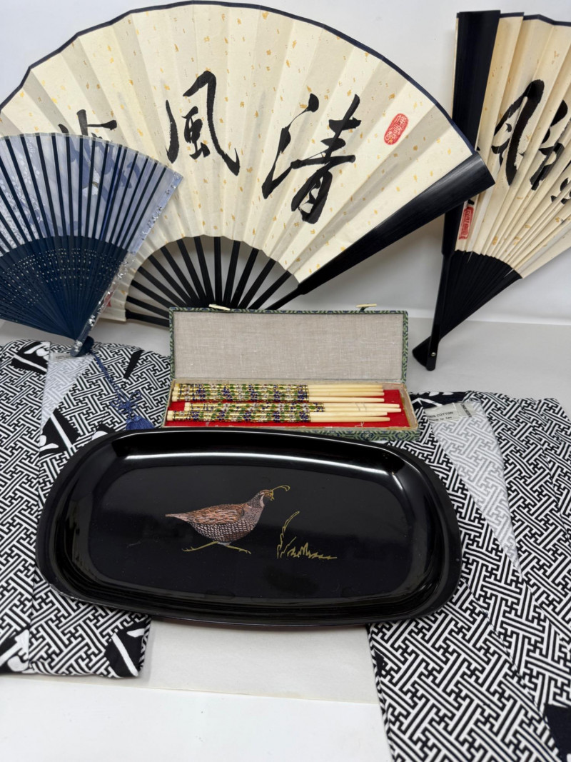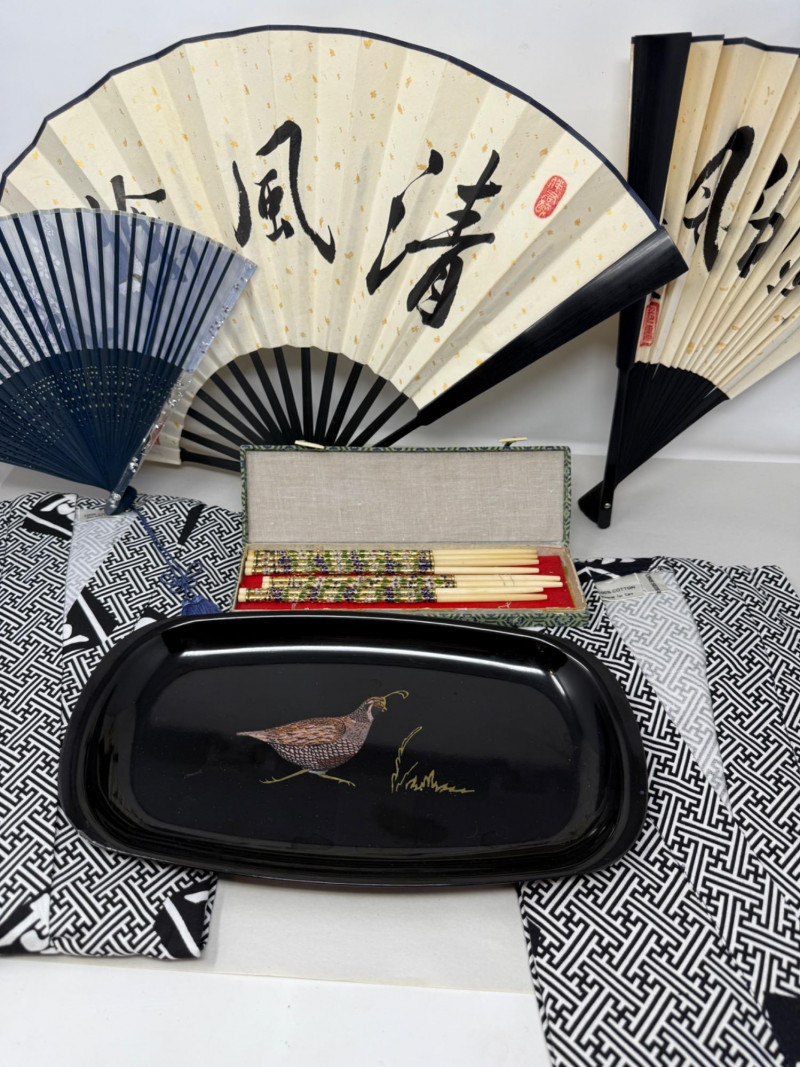 213 inch paper fans, one 8.5 inch silk fan two kimonos Clossoine chopsticks in storage box Couroc Tray 12.5x7”