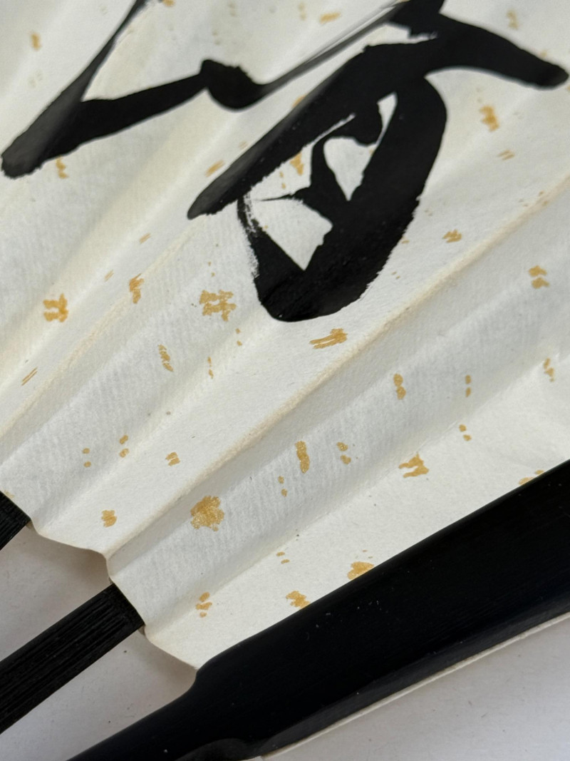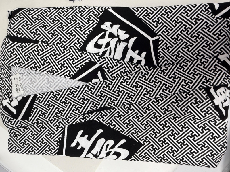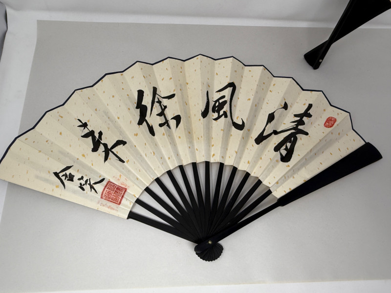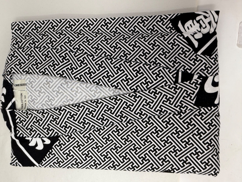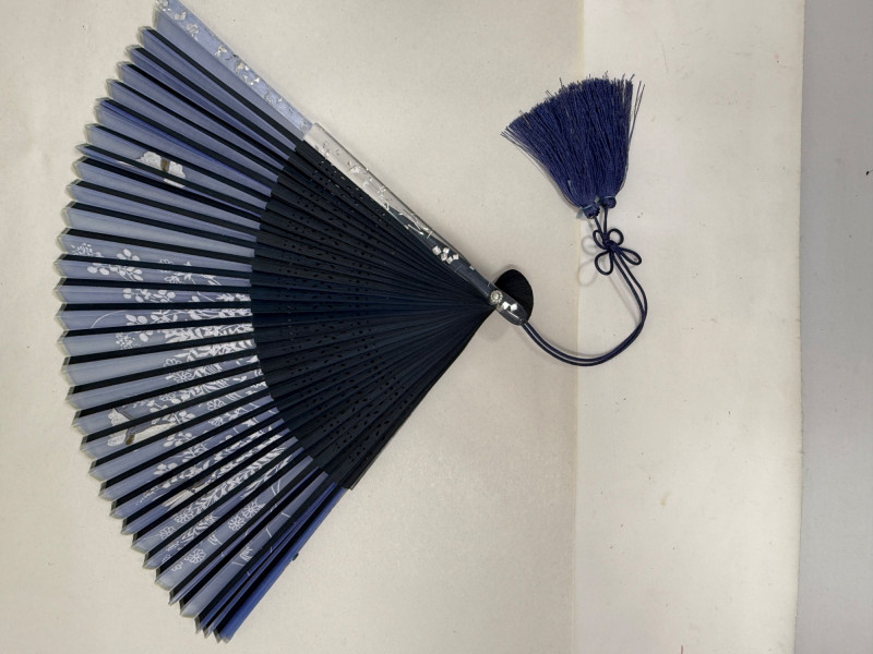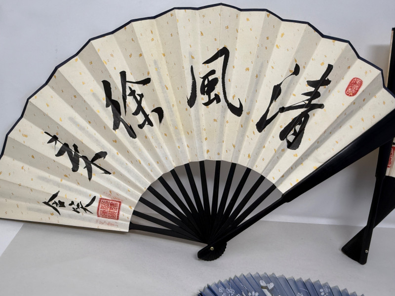 213 inch paper fans, one 8.5 inch silk fan two kimonos Clossoine chopsticks in storage box Couroc Tray 12.5x7”