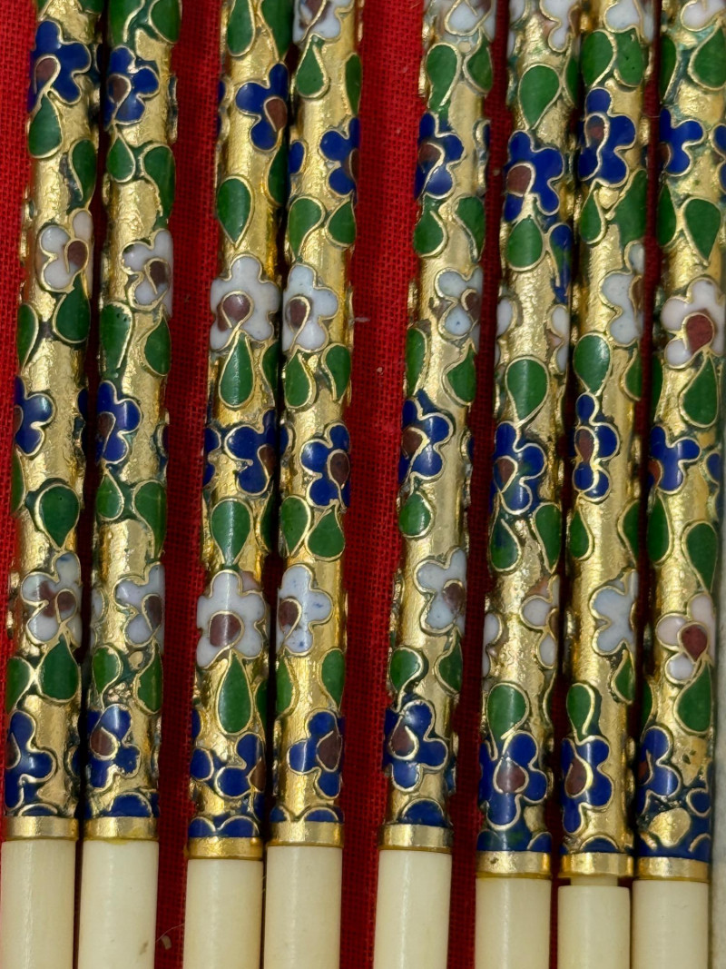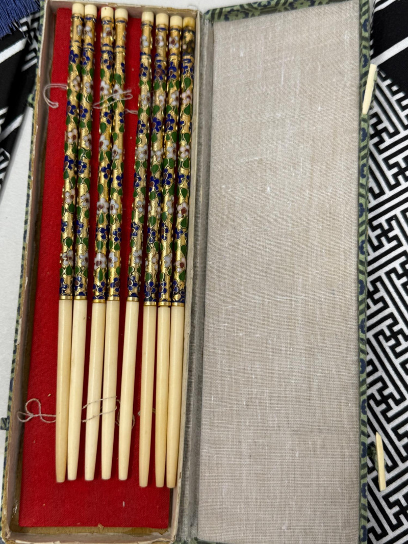 Lot # 245 - Kimonos - Fans - Cloisoinne Chopsticks & Couroc Tray