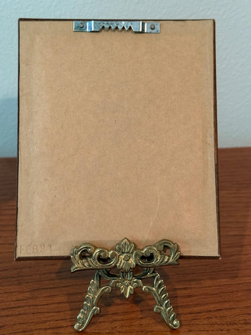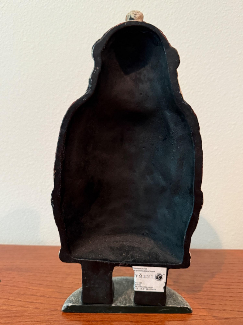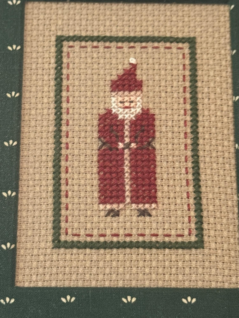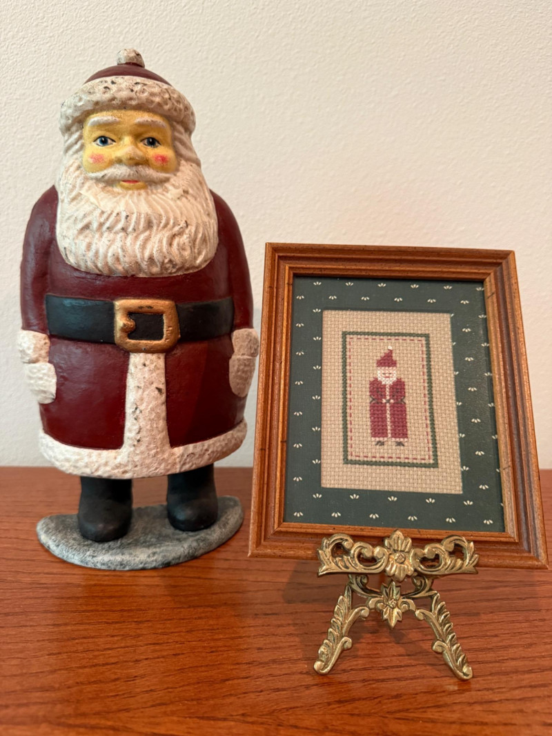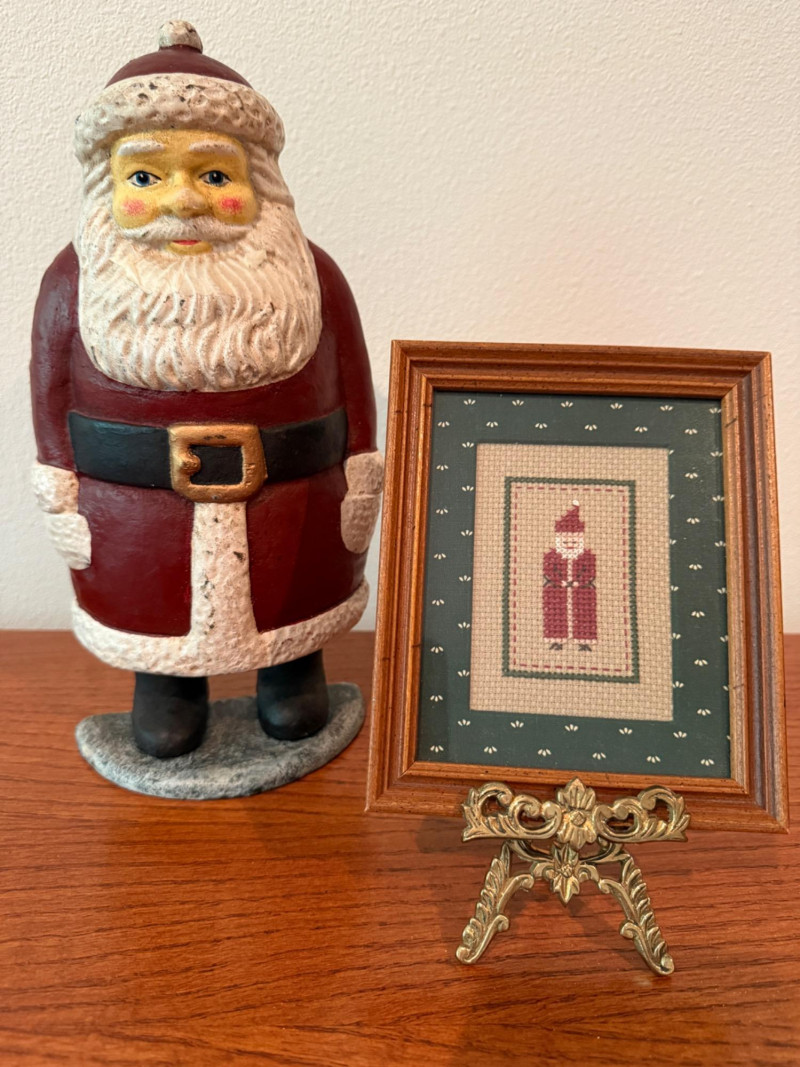 Dept 56 Cast Iron Santa Door Stop & Needlepoint Santa with brass stand. Dept 56 Cast Iron Santa Door Stop is 5.5x11” 1991 Framed Needlepoint Santa is 5x6” Brass frame stand.