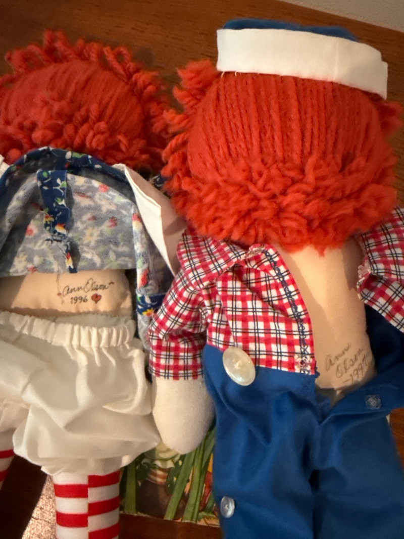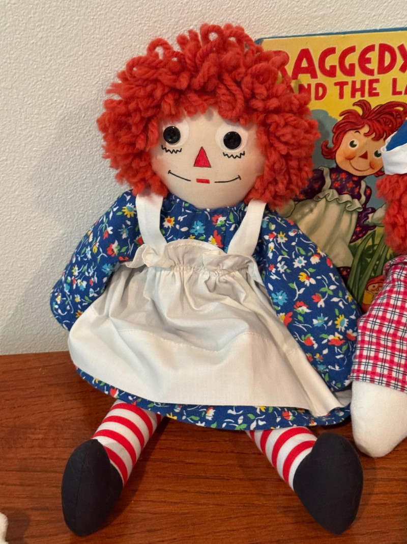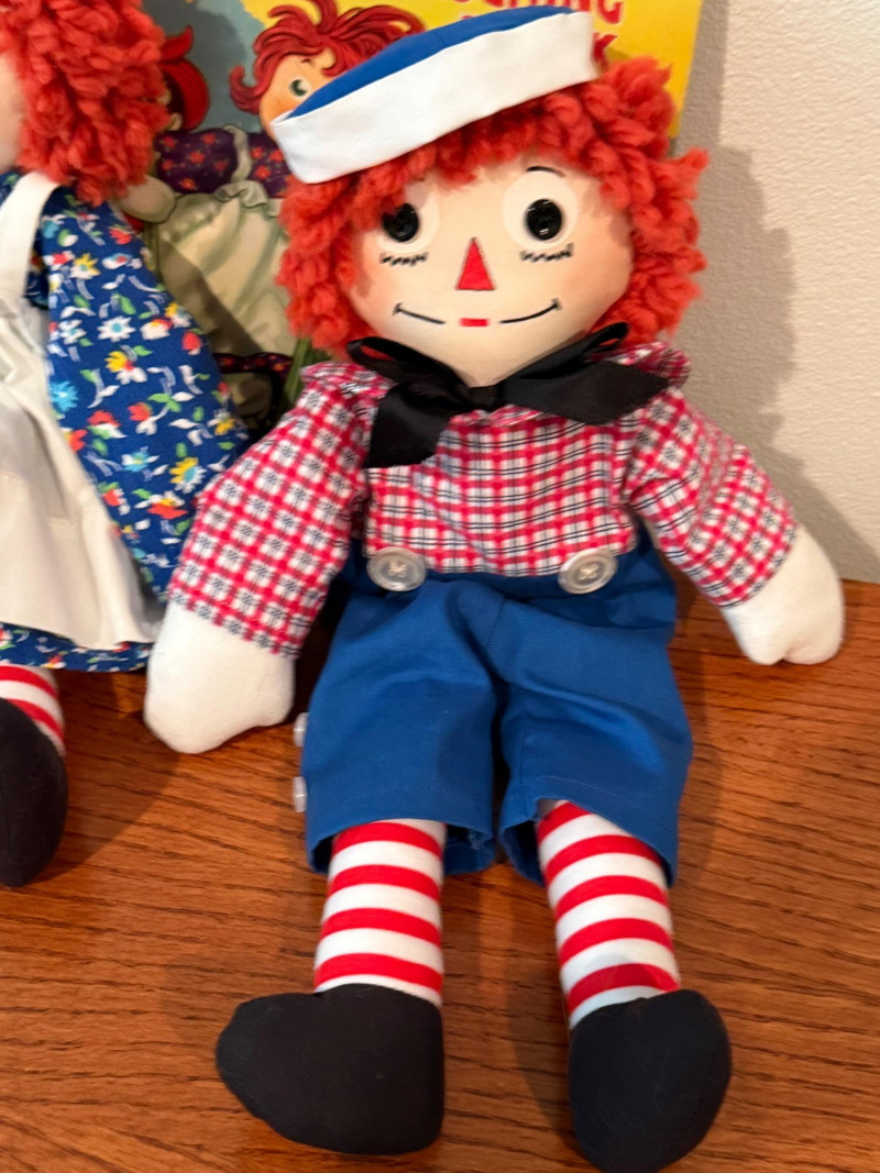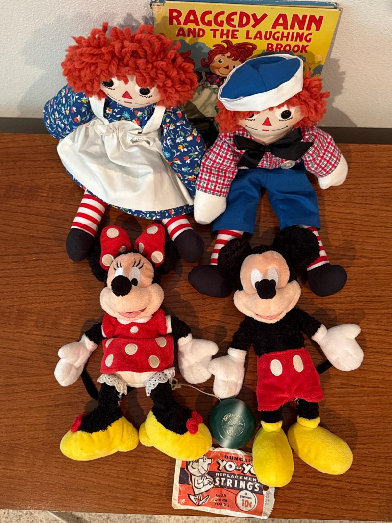 Vintage Mickey Mouse With Tail & Raggedy Ann & Andy & YoYo Vintage Mickey Mouse and Minnie Mouse With Tails are 11” Raggedy Ann & Andy are 17” long Raggedy Ann and the Laughing Brook book 1946 DUNCAN tournament YoYo with extra strings