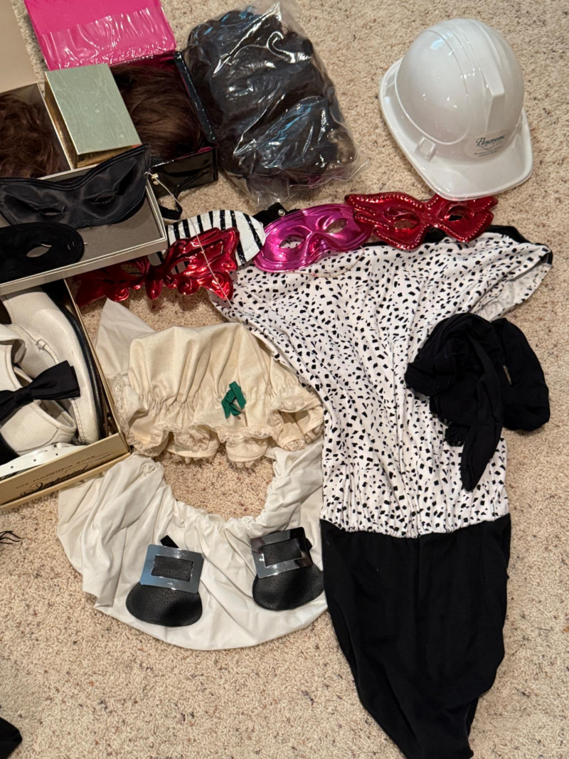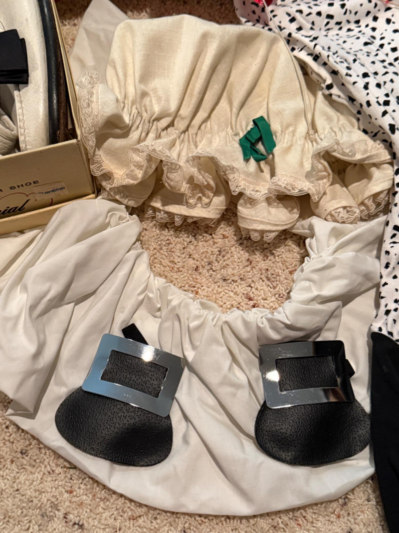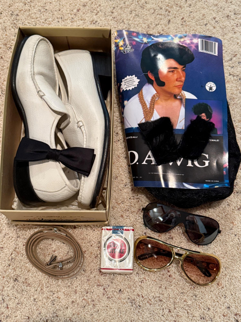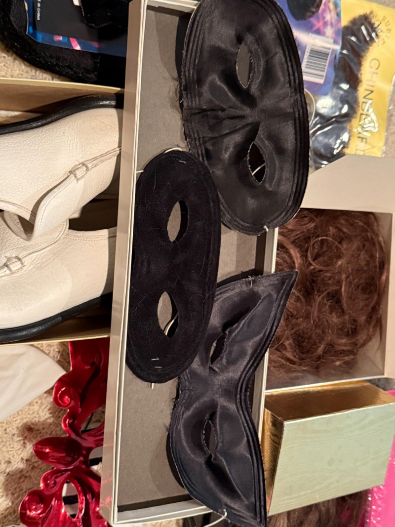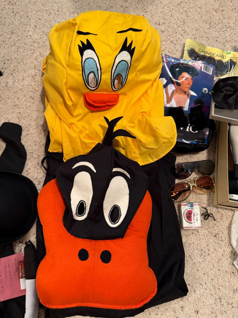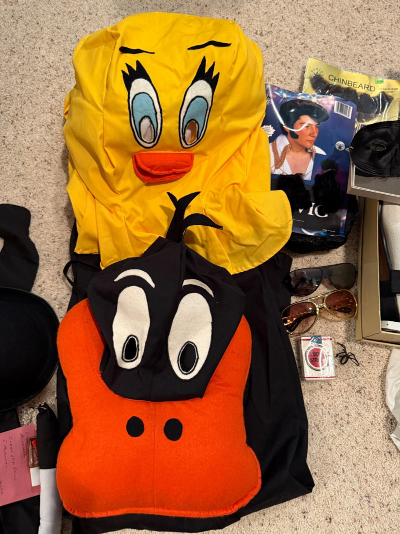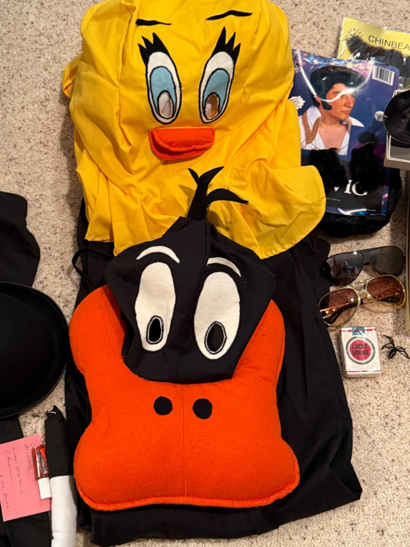 Vintage Halloween Costumes Tweety Bird fabric body and head cover adult size Daffy Duck oversized adult fabric body and head cover Pluto hat with ears, tail, nose, bow tie Elvis glasses, 10.5 shoes, smokes, belt, wig, sideburns Bonnet, dickey & shoe toppers for pilgrim real hair wigs, real hair mustache & chin hair Old and newer eye masks 3 Sombreros Very well kept quality costumes