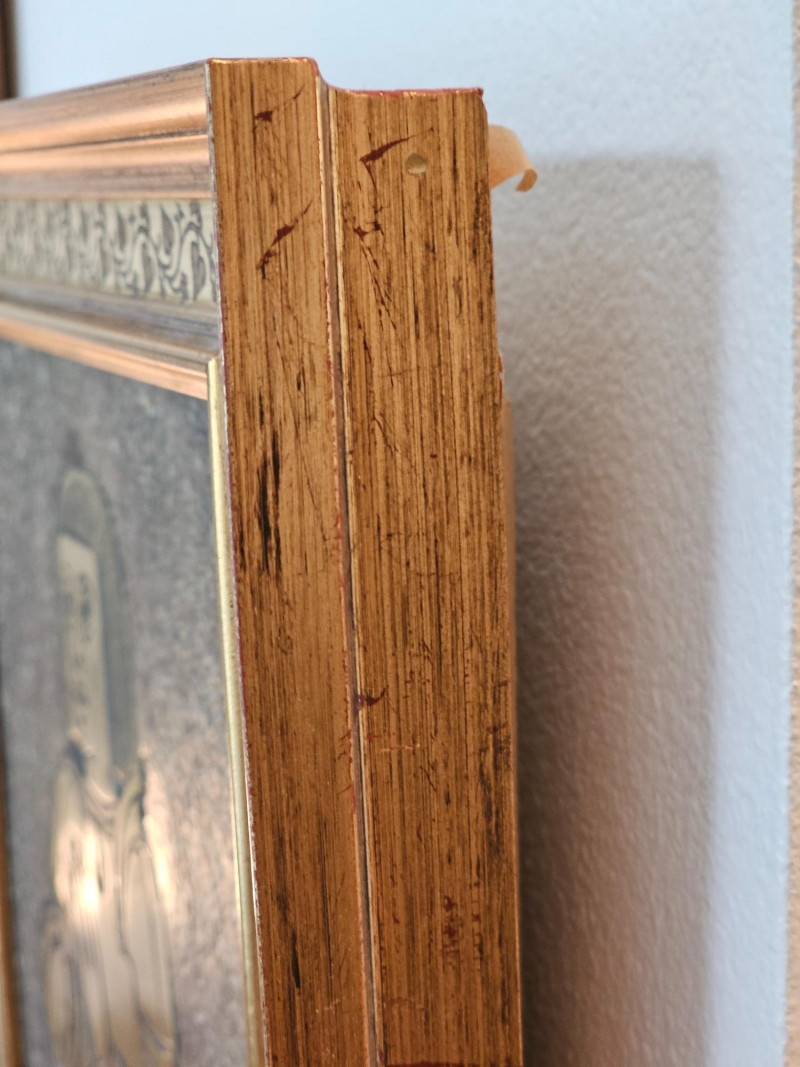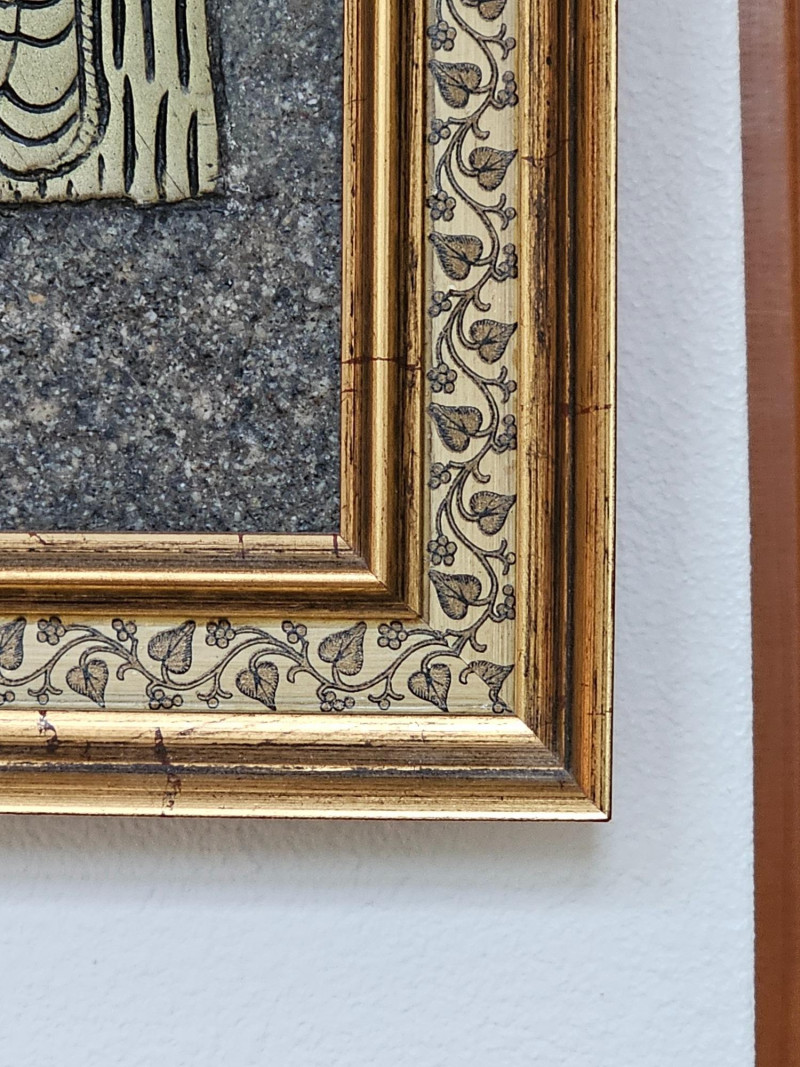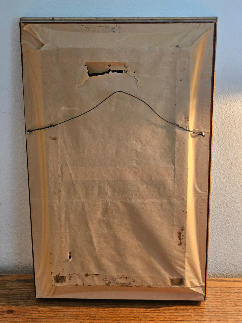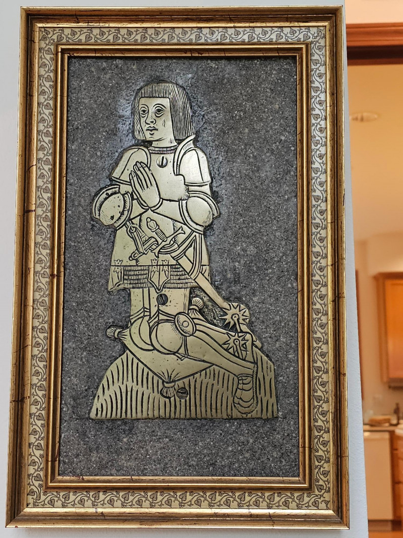 Vintage Framed Brass Rubbing Of Sir Thomas Golde Sir Thomas Golde, died in 1525 and was from Crewkerne, Somerset, England. The artwork is a brass rubbing, a traditional method of creating an impression of engraved brass plates, often found on tombs in churches. The figure of Sir Thomas Golde in the rubbing is depicted in armor, kneeling in prayer, which is characteristic of medieval tomb effigies The piece appears to date back to the late 1960s 16.5"T x 10.5"W