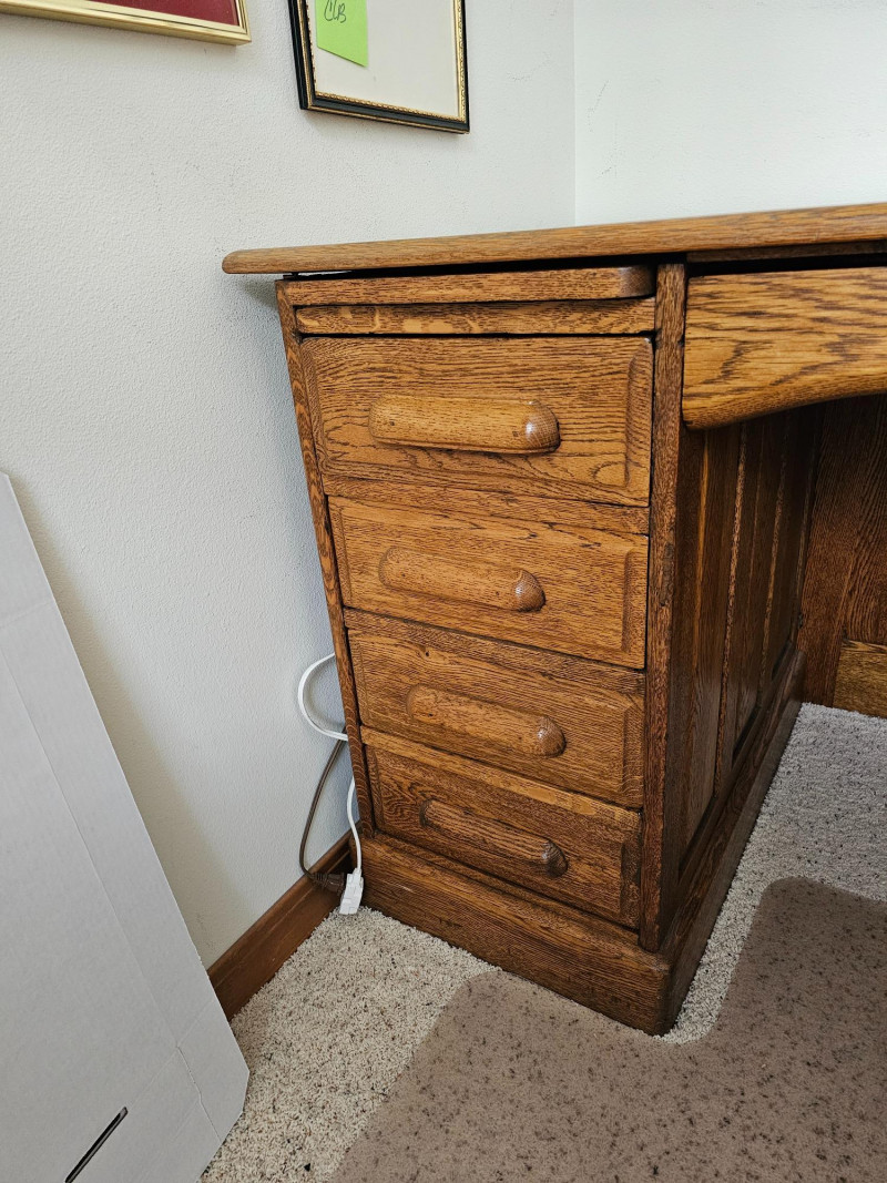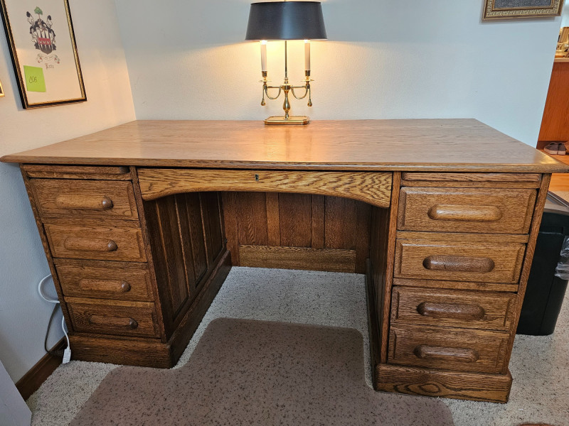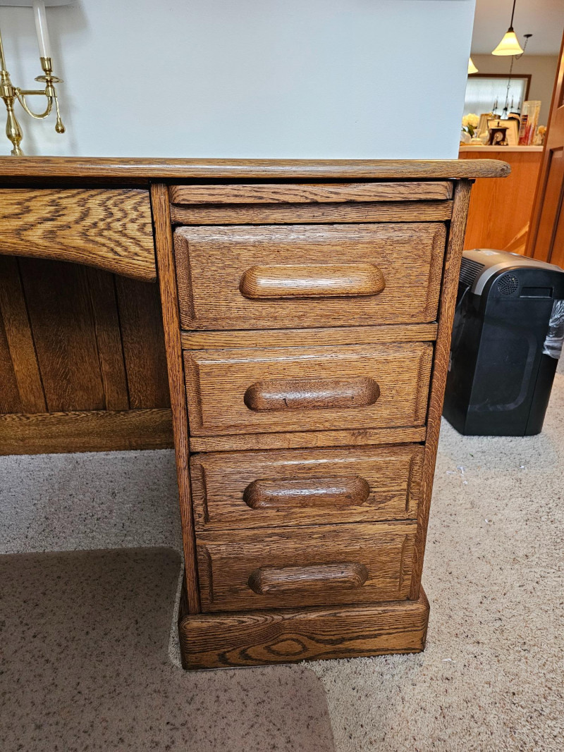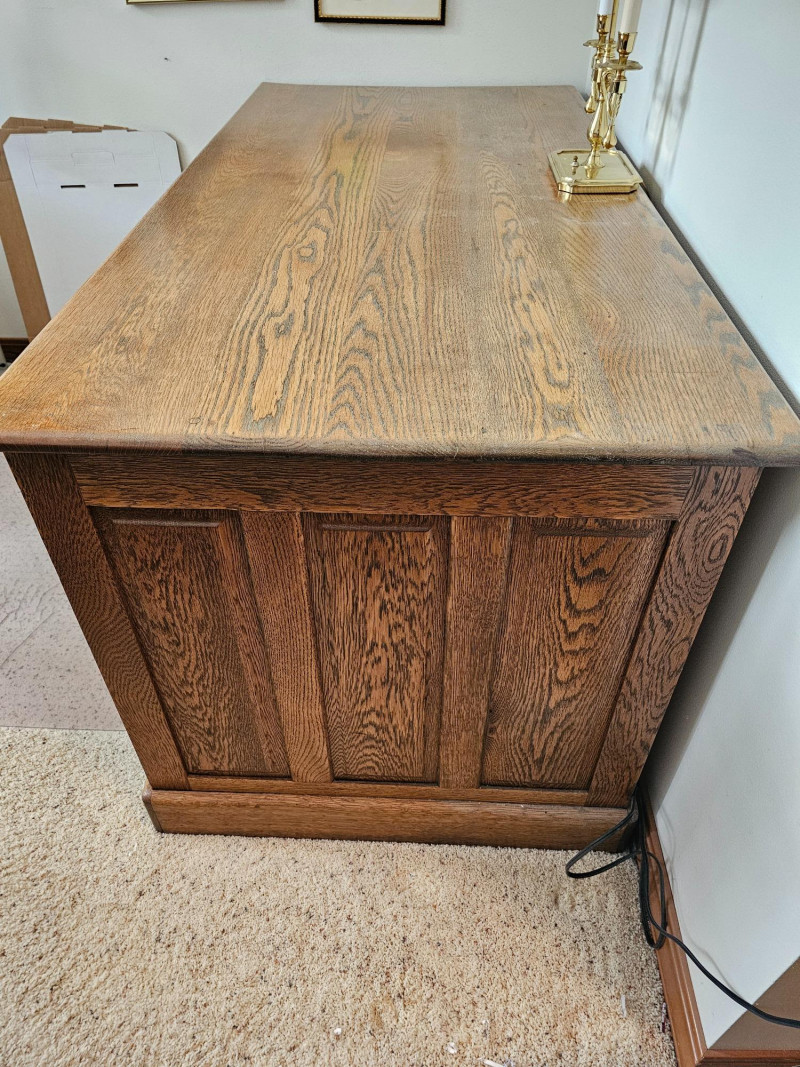Vintage Solid Oak 8-Drawer Desk With 2 Pull Out Writing Surfaces Nice condition dark stain solid oak desk Has 2 pull-out writing surfaces and 8 drawers Top and both drawer sides appear to unscrew for transport 22.5"T x 60"W x 30"D