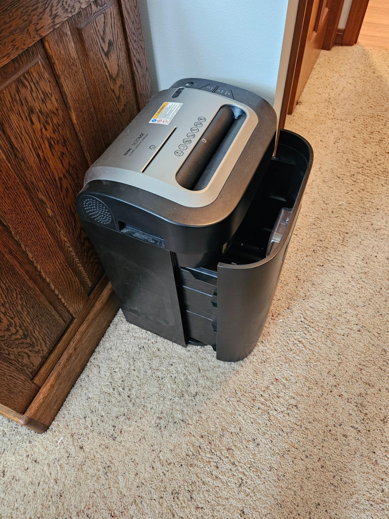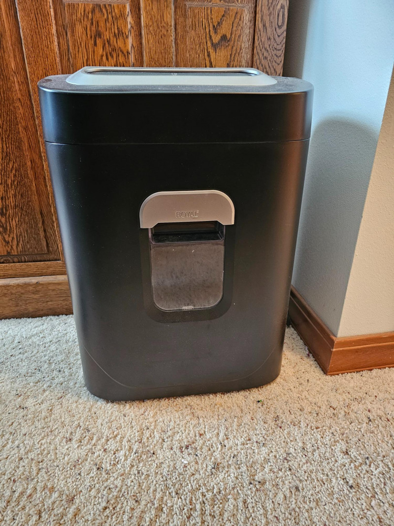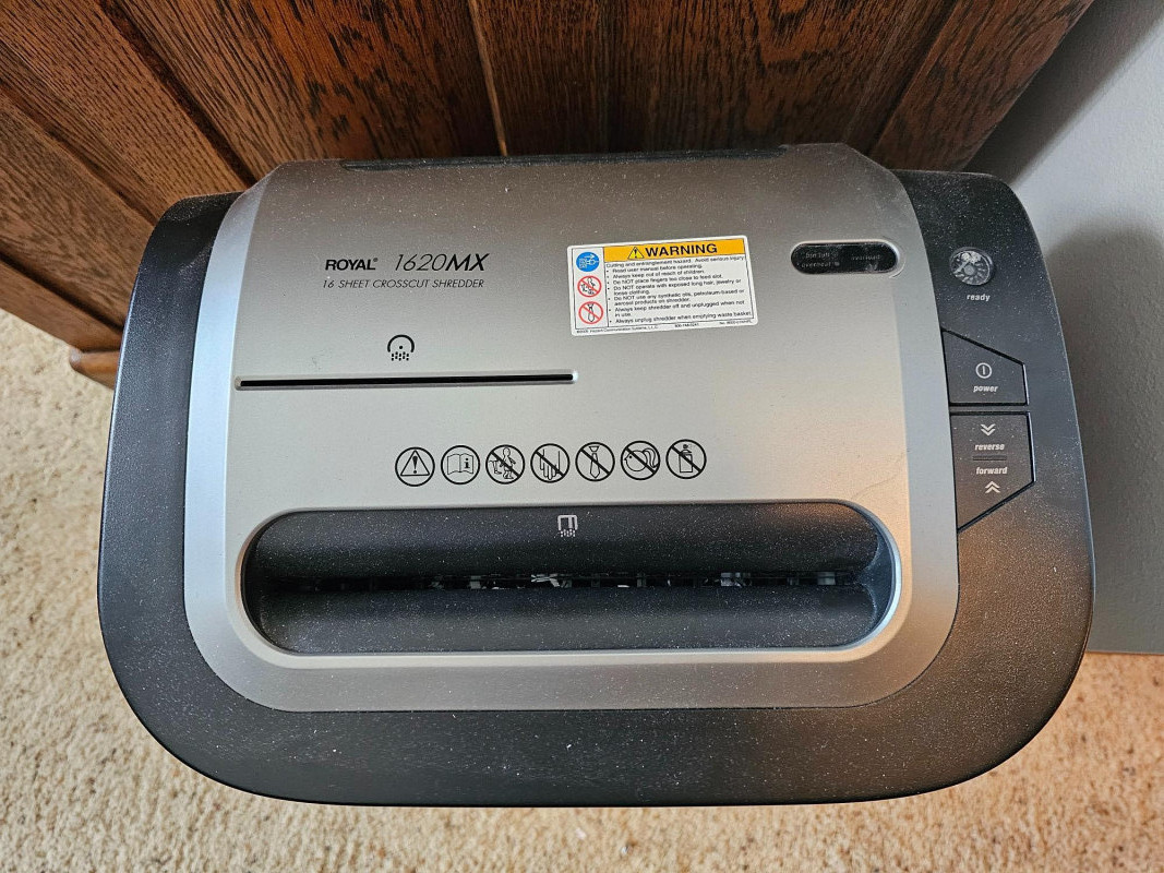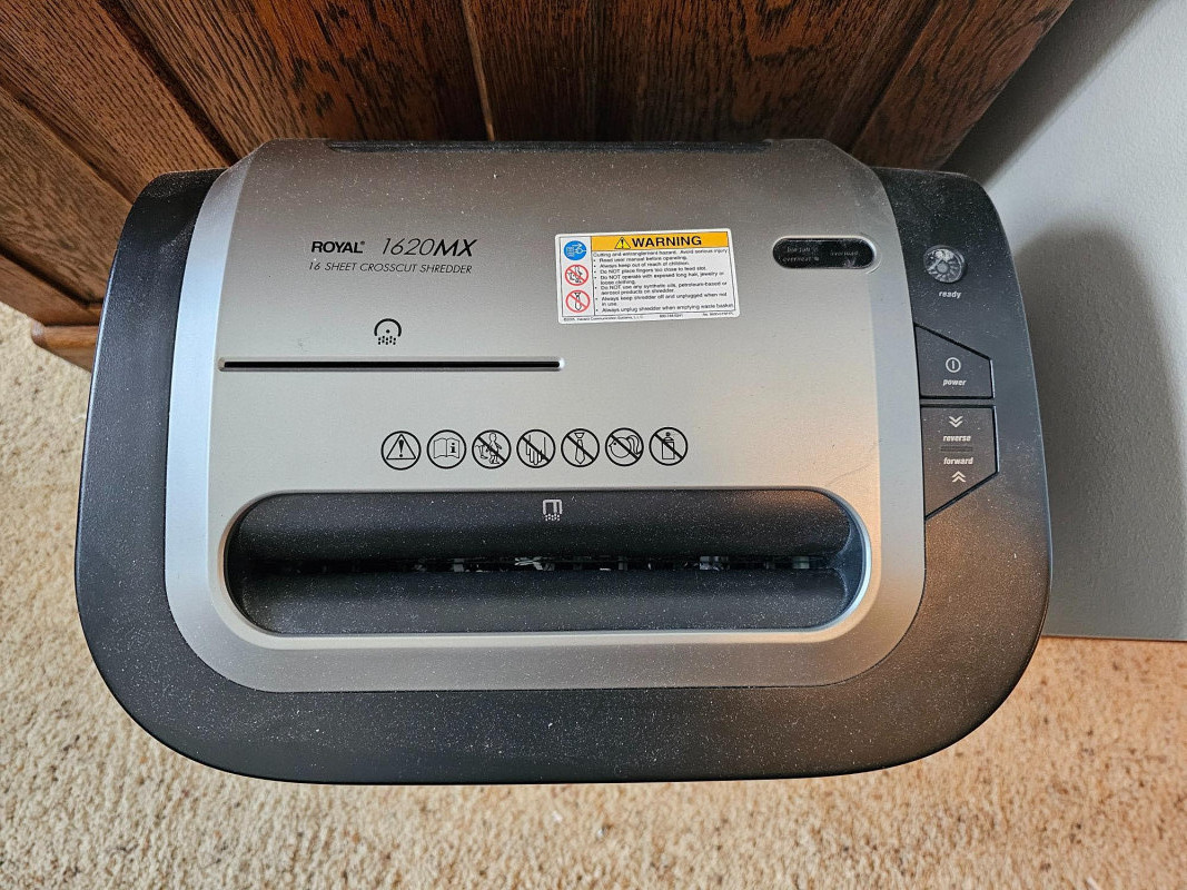 Royal 1620MX 16-Sheet Crosscut Shredder The Royal 1620MX is a 16-sheet crosscut shredder designed for use in both home offices and small businesses Shredding up to 16 sheets of 20-lb bond paper per pass. Also shreds staples, credit cards, CDs, and DVDs. Shred Type: Crosscut shreds documents into small pieces 0.15" x 1.312" Up to 30 or 40 minutes continuous run time before needing to cool down. 11 feet of paper per minute or 5 seconds per pass. 7.125 gallons pull-out basket bin capacity Tested - Works! 20.5"T x 14"W x 11"D