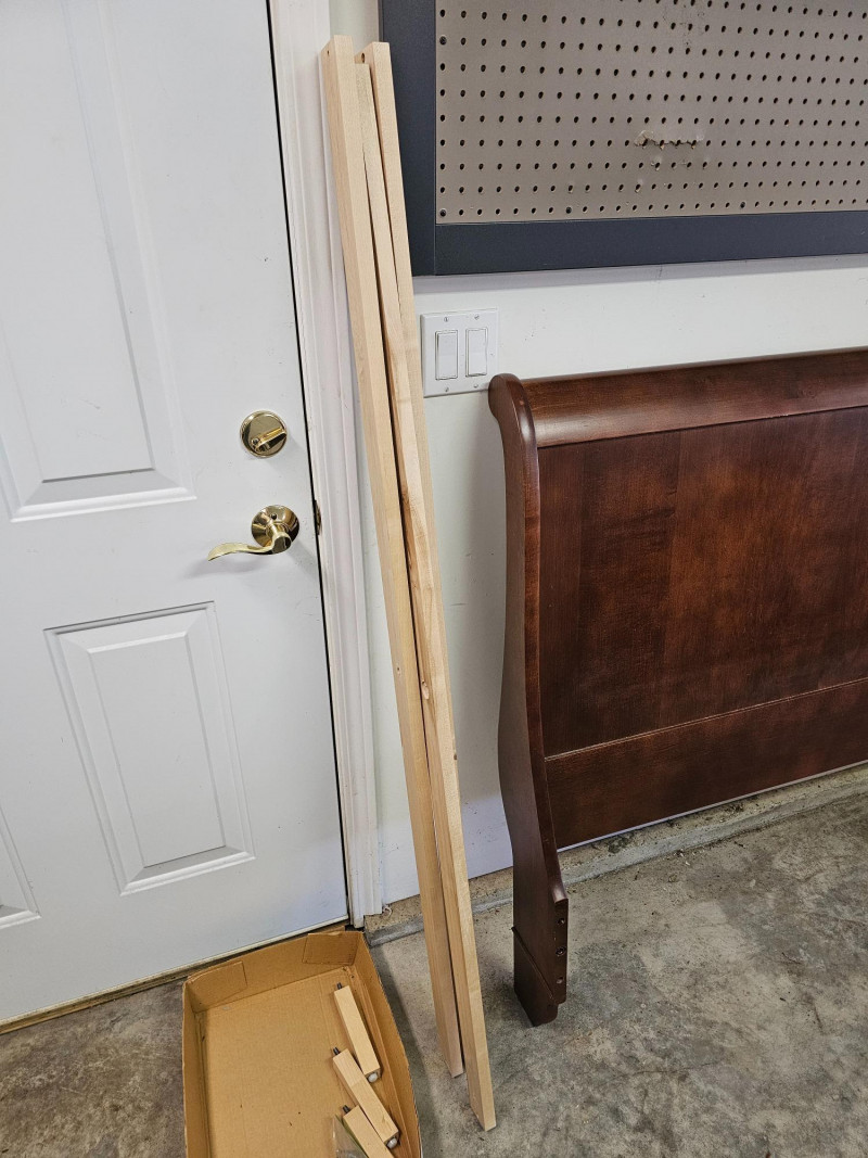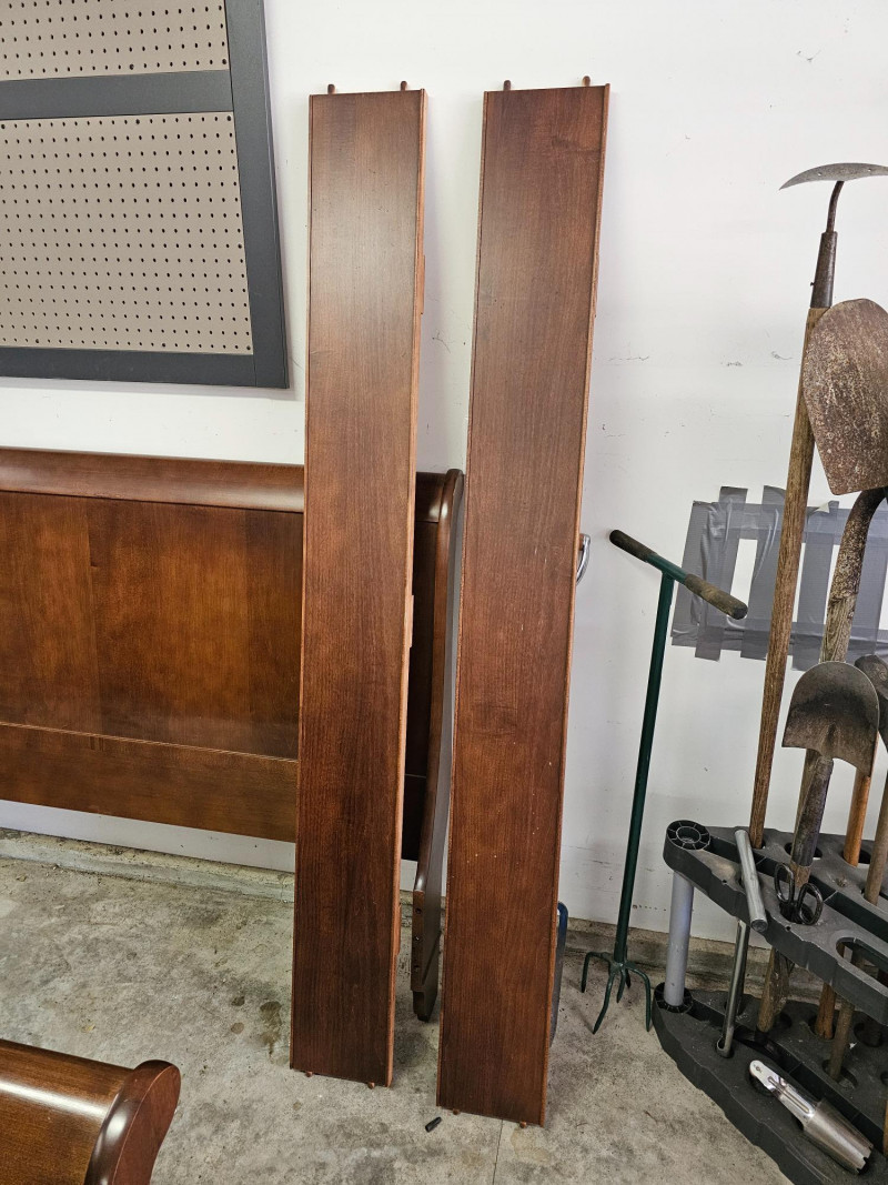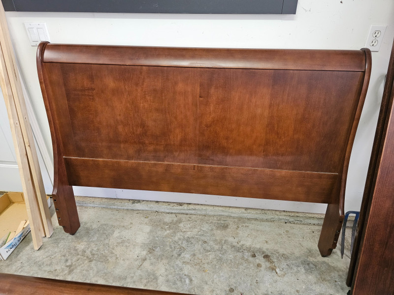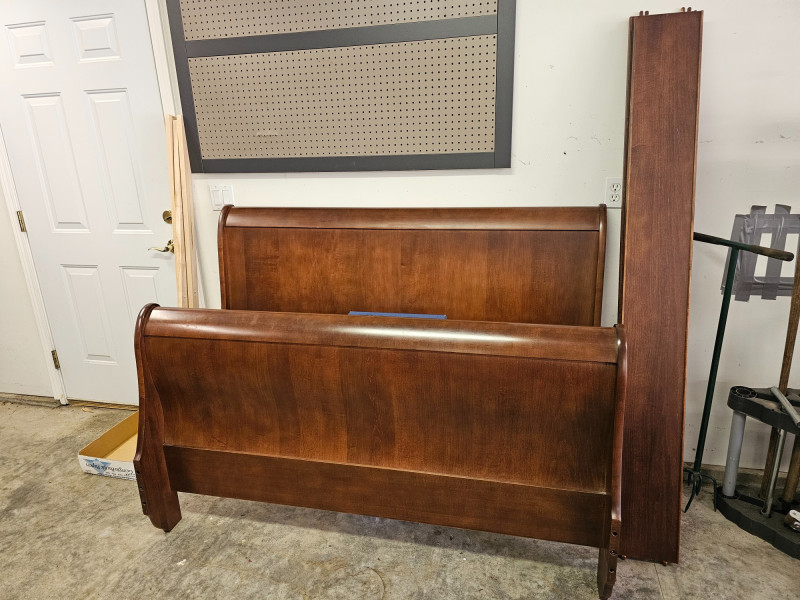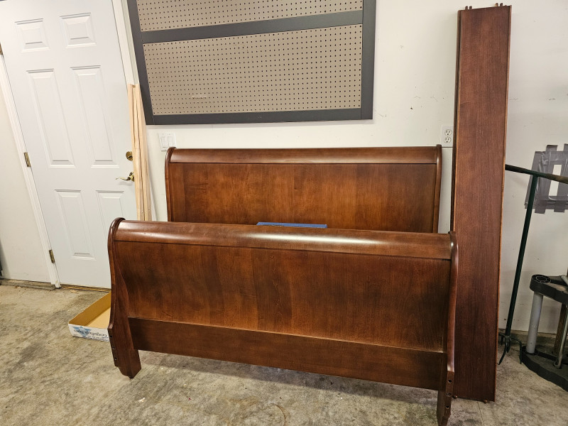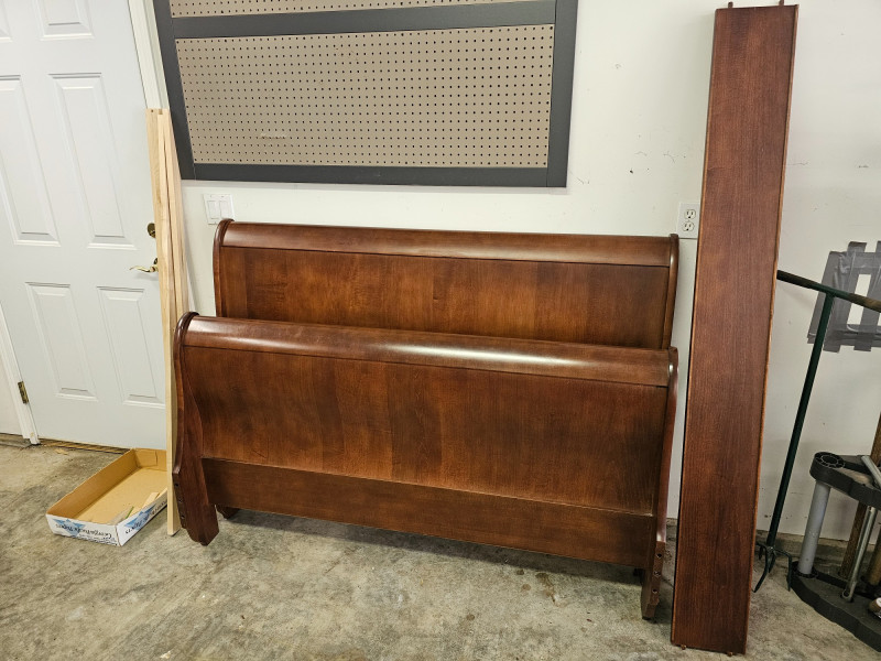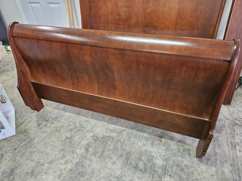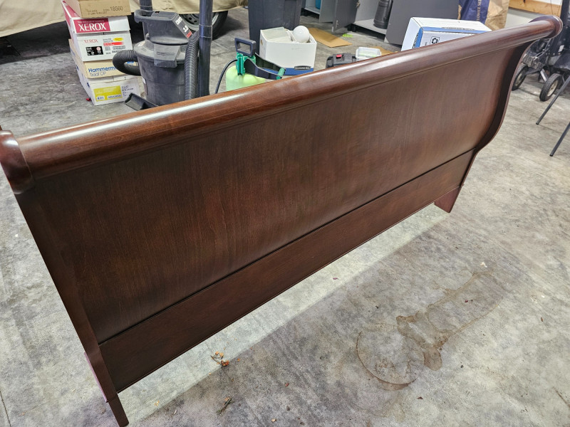 Queen-Size Sleigh Bed: Headboard, Footboard, Side Rails & Slats Dark stained queen size sleigh bed Includes headboard, footboard, side rails, slats, center feet for slats & Hardware Appears to be in great condition with rich colors and wonderful curved design! A couple of marks on headboard (see pics for condition) Headboard: 45"T x 62.5"W Footboard: 34"T x 62.5"W Siderails: 8"T x 71"L