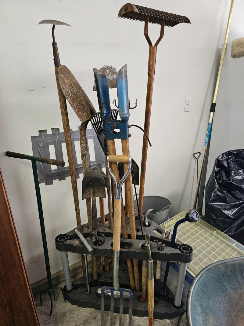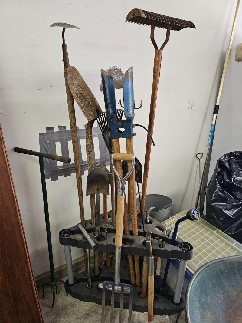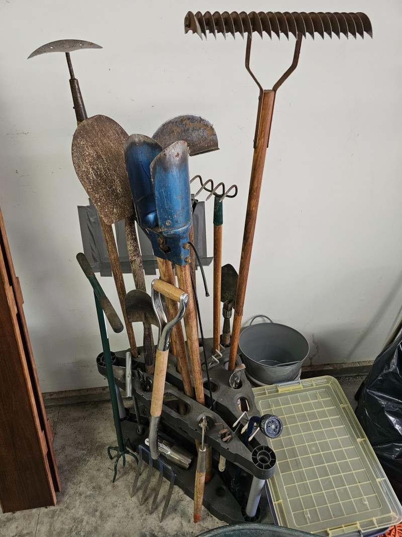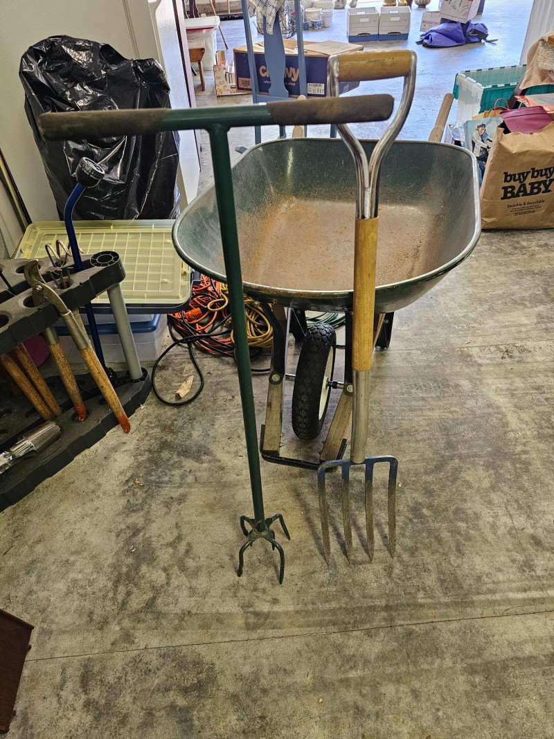 Garden Tool Lot Plus Wheelbarrow 20 garden tools: shovels, rakes, post hole digger, weedess, hand tools, pitch fork, axe, hook, edger, hose wand, pruners & hay rake (1) Handy plastic corner toll organizer (1) Single-wheel wheelbarrow All in good used condition!