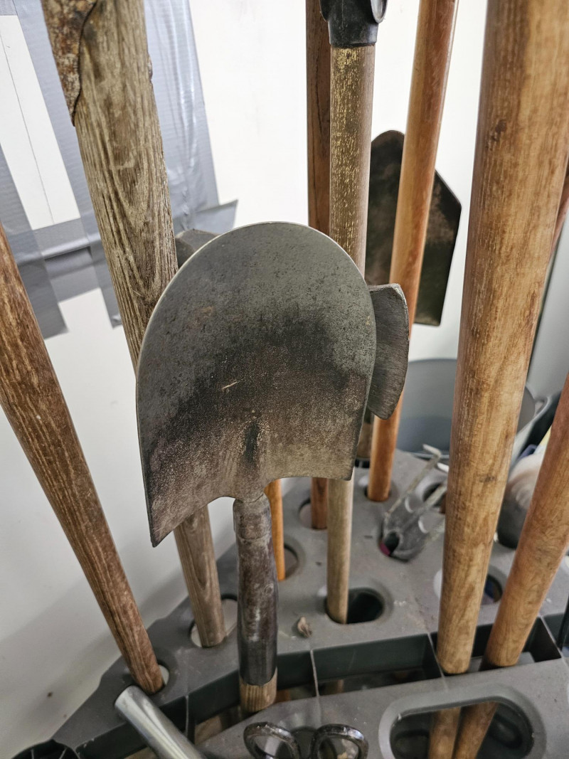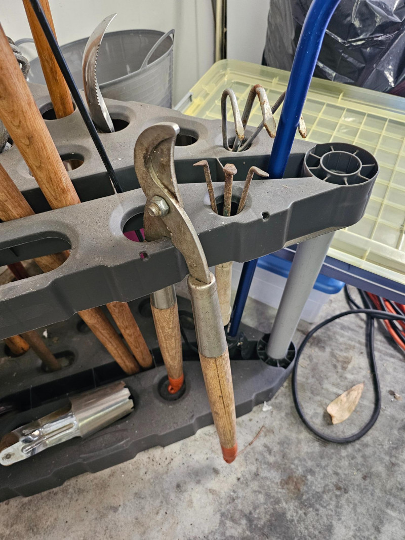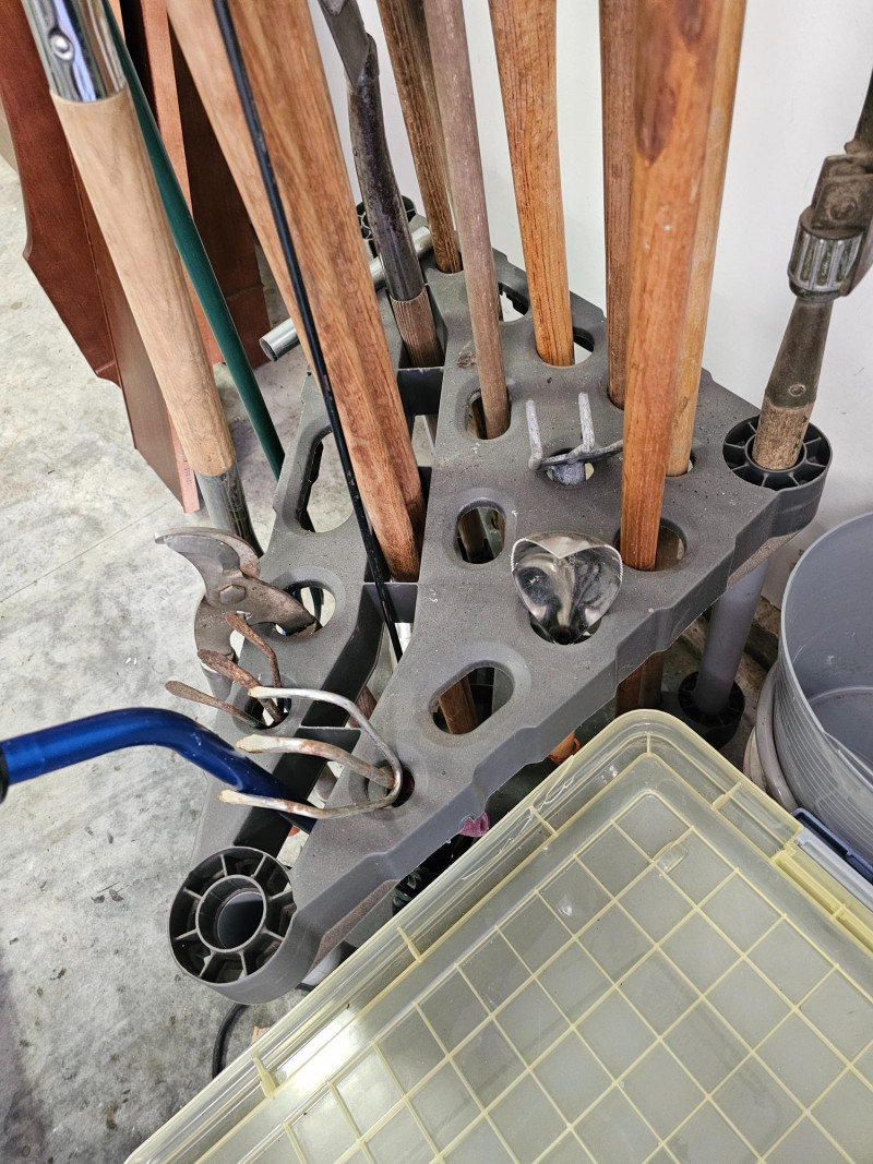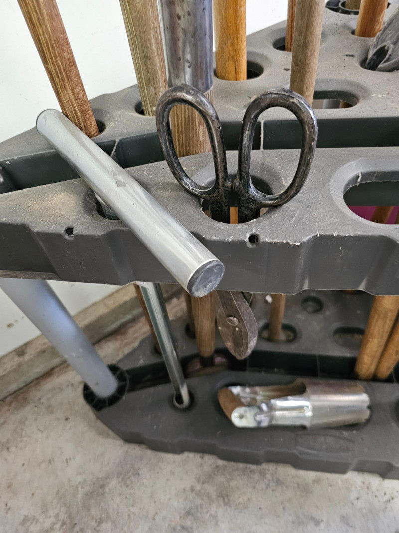 Garden Tool Lot Plus Wheelbarrow 20 garden tools: shovels, rakes, post hole digger, weedess, hand tools, pitch fork, axe, hook, edger, hose wand, pruners & hay rake (1) Handy plastic corner toll organizer (1) Single-wheel wheelbarrow All in good used condition!