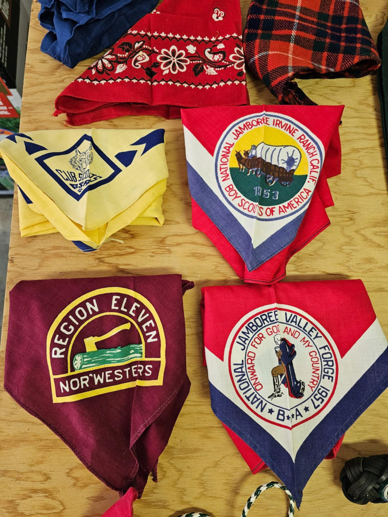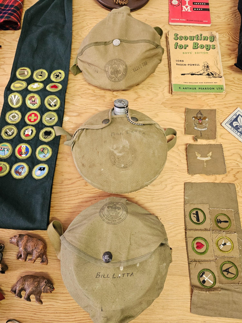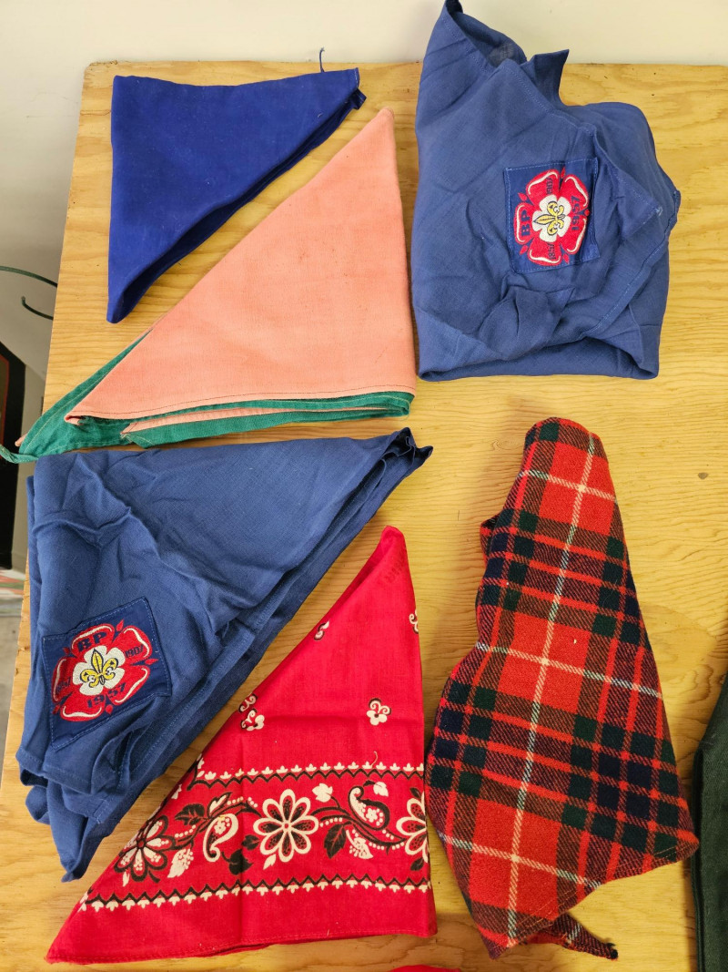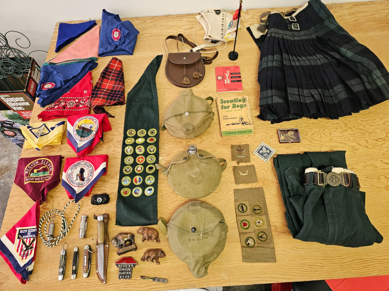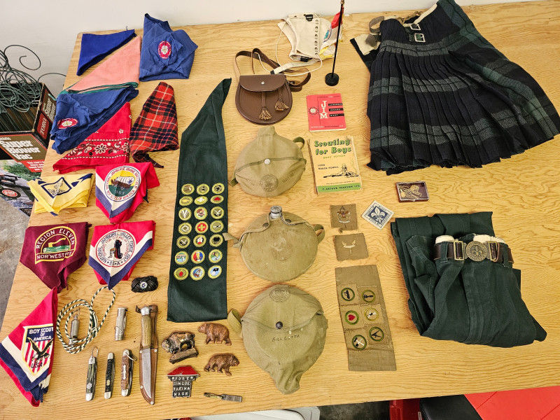 Huge Boy Scout Lot! (11) Scout scarves (4) Pocket knives (3) Canteens (1) Small leather bag (1) Sash full of patches (1) Wrap of leather cord (1) Boy Scout mini flag (1) Pair of Boy Scout leggings (5) Cloth patches (2) Scouting books (3) Scout uniforms with patches (1) Pair of pants with Scouting belt (1) Men's kilt (3) Bison & bear figures (2) Scouting tie clips 40 pieces of Boy Scout Memorabilia!