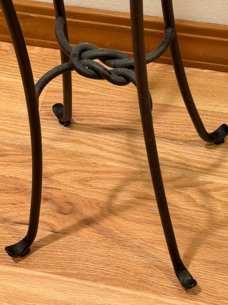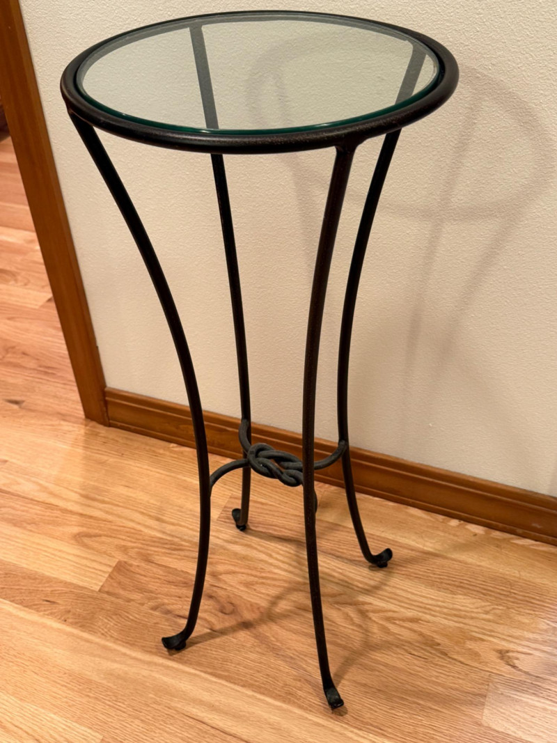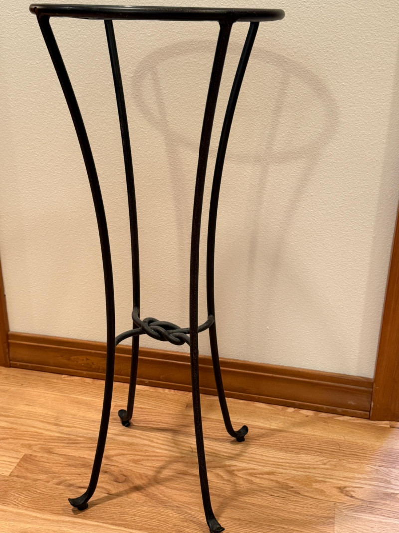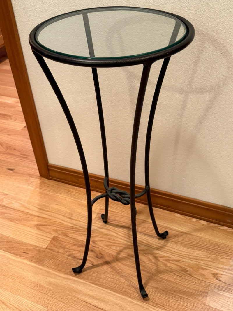 Twisted Iron and Glass Plant Stand 12 inch diameter top by 28.5 inches tall.