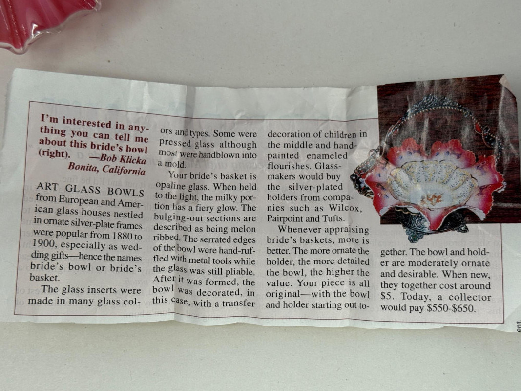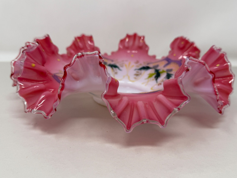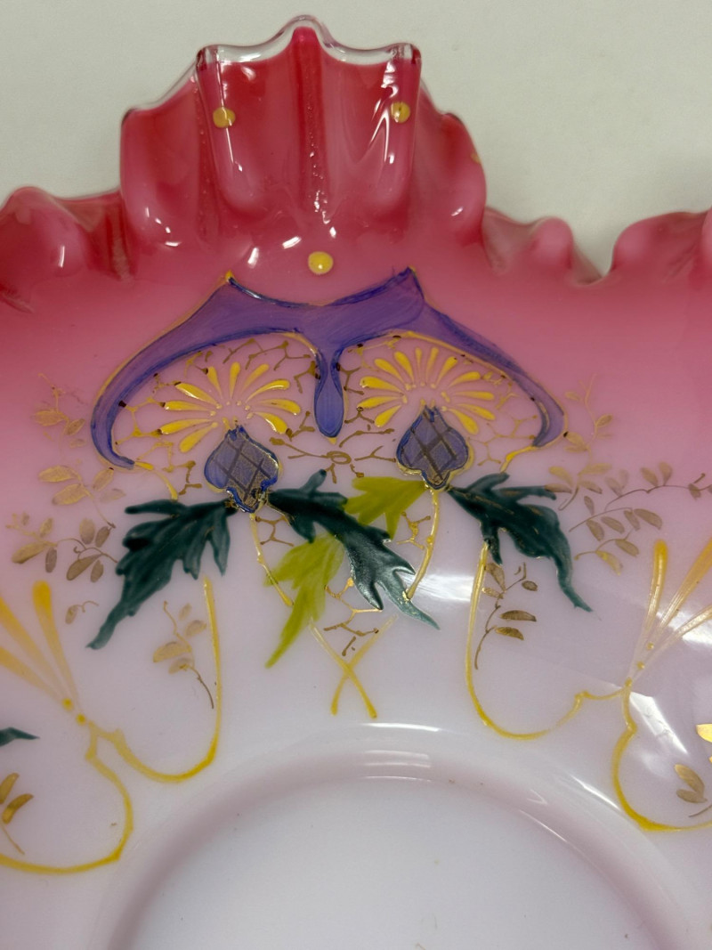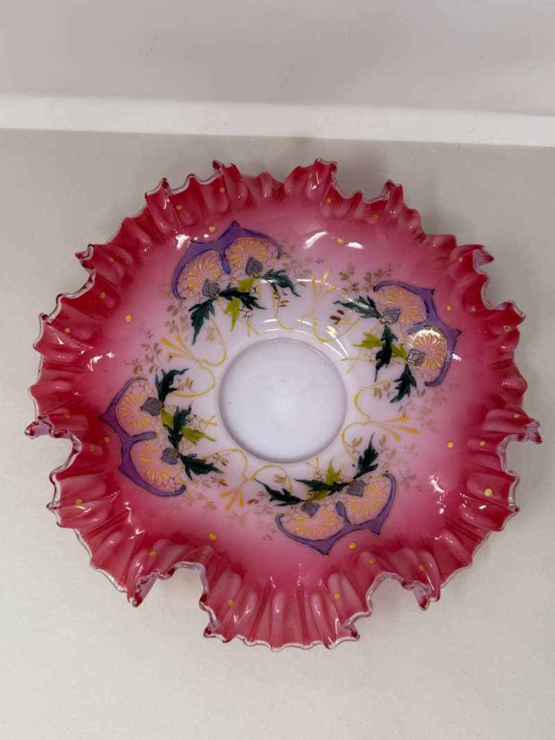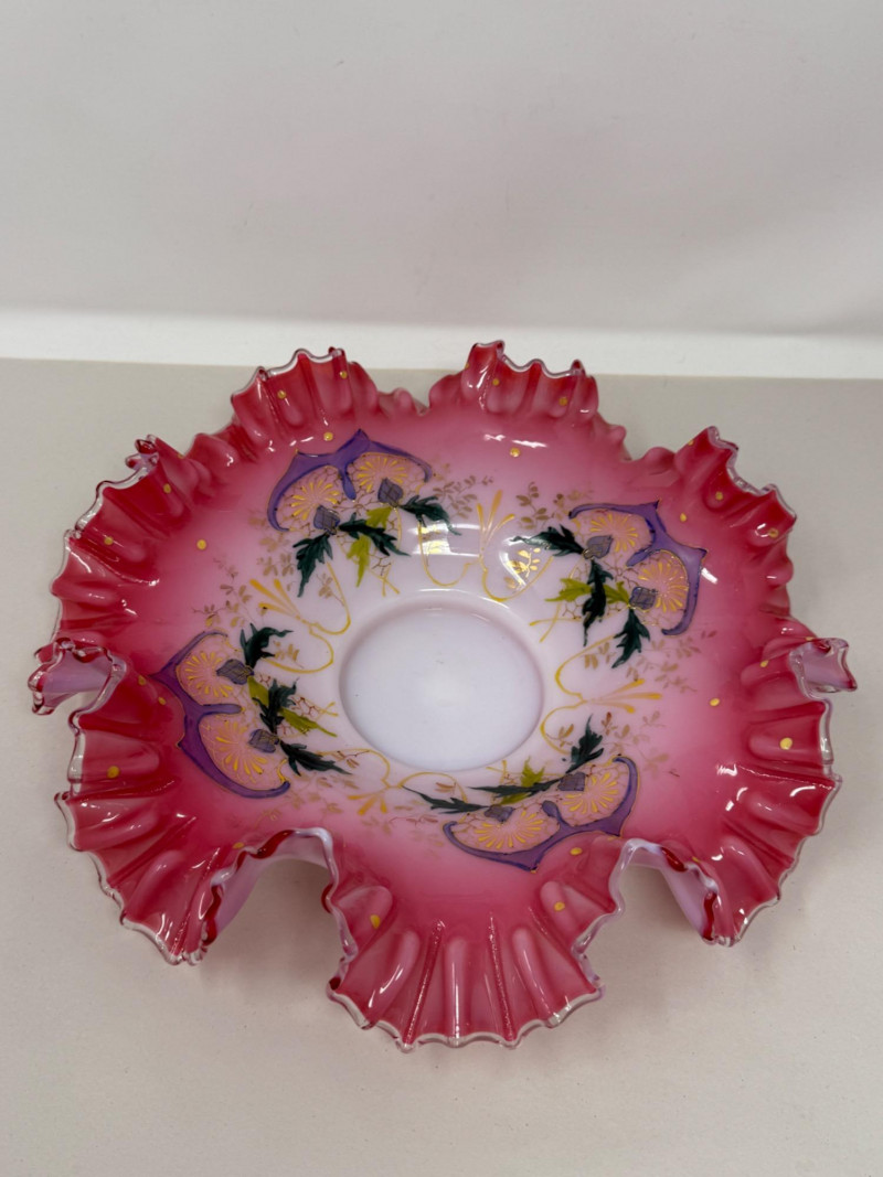 Antique Victorian bride's bowl, likely made of hand-painted art glass in the "peach blow" style.