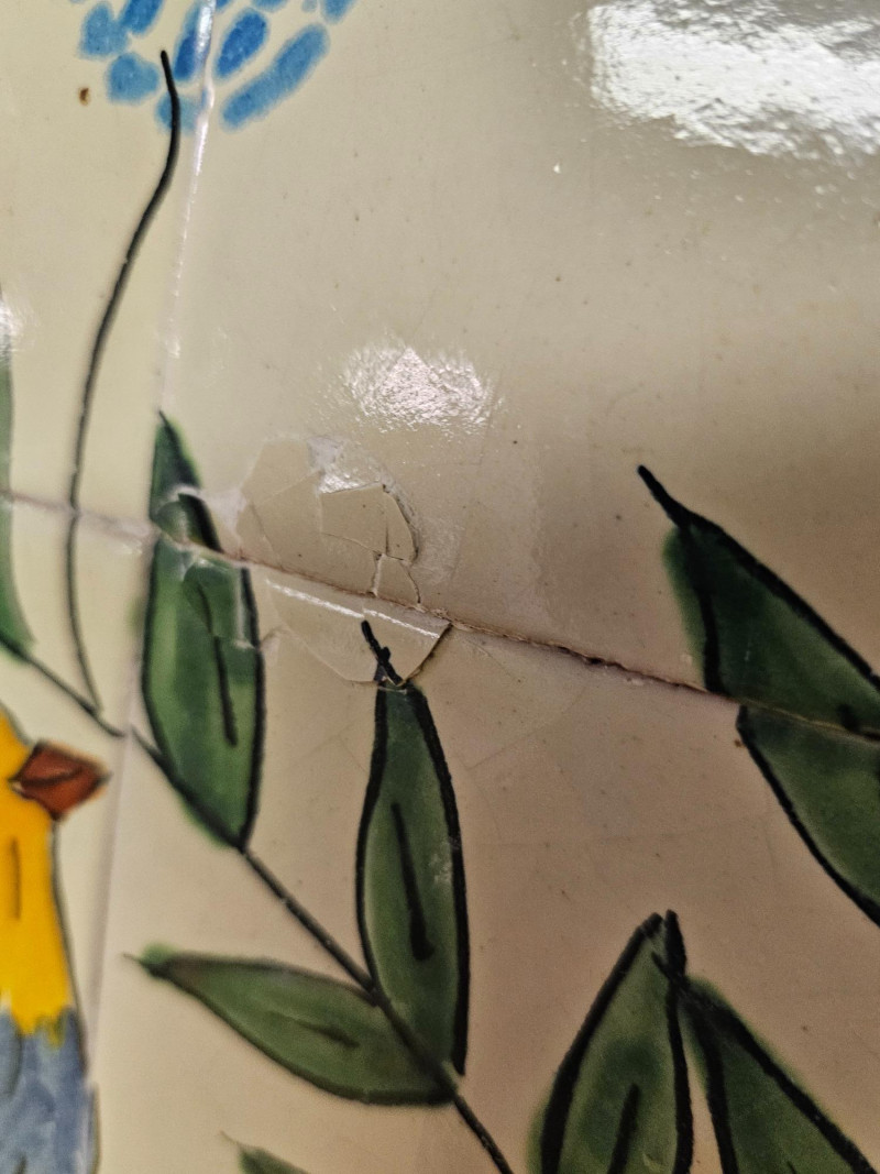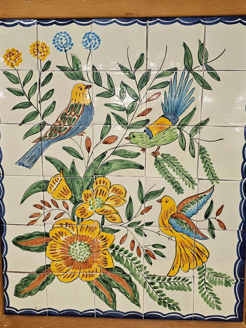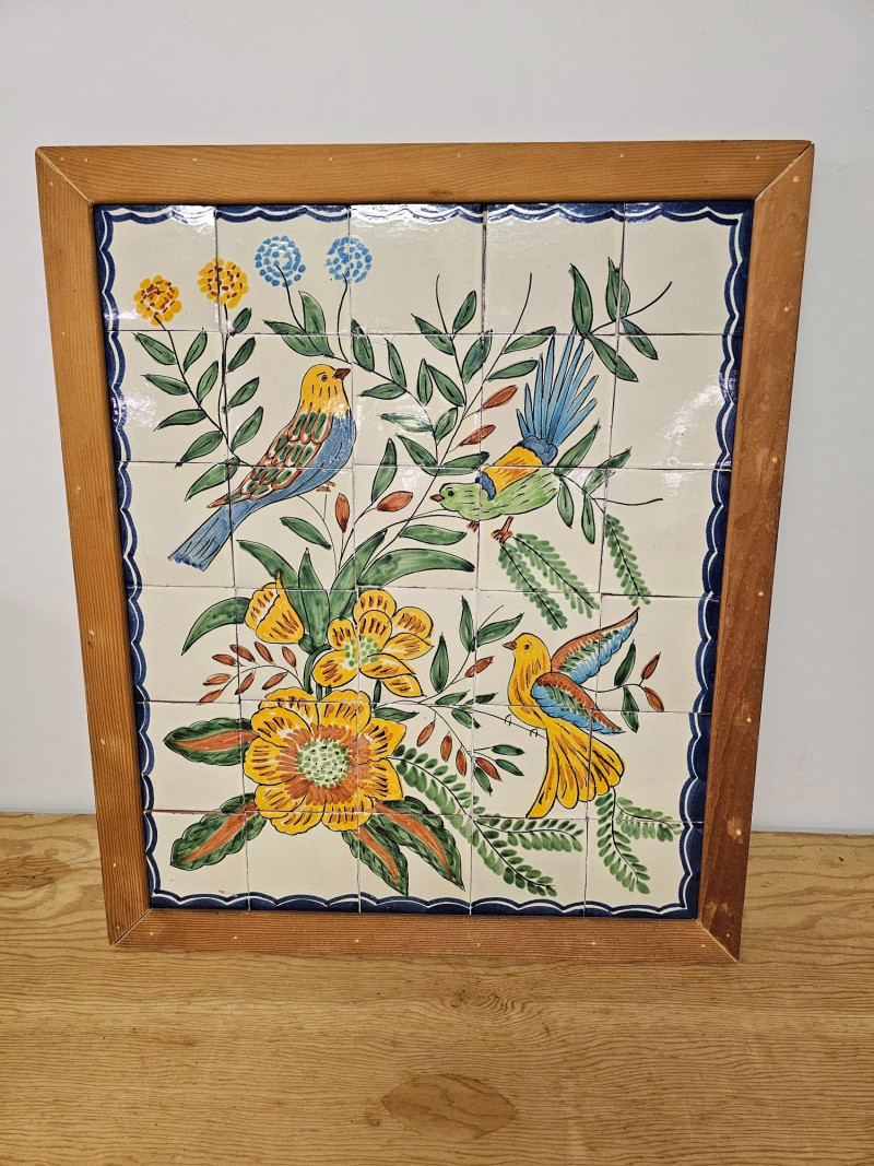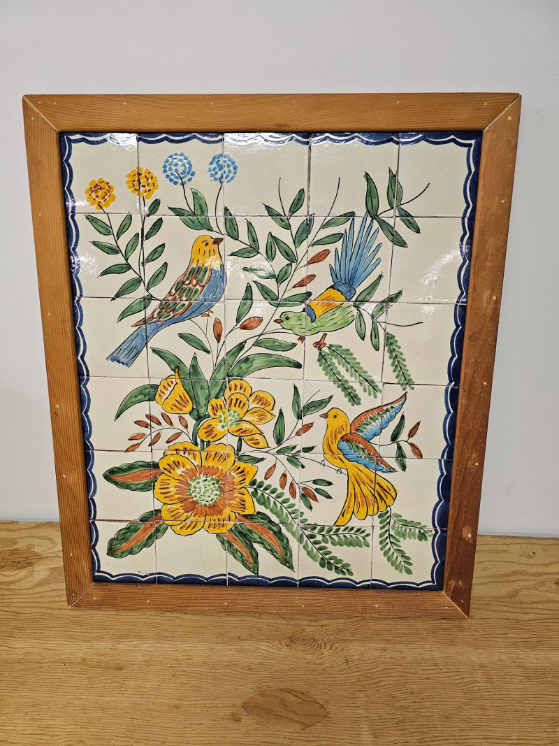 Framed Hand-Painted Ceramic Tile Mural Decorative art piece featuring hand-painted birds and flowers Homemade frame See pics for condition. One chip appears to have been glued back in 27"T x 23"W