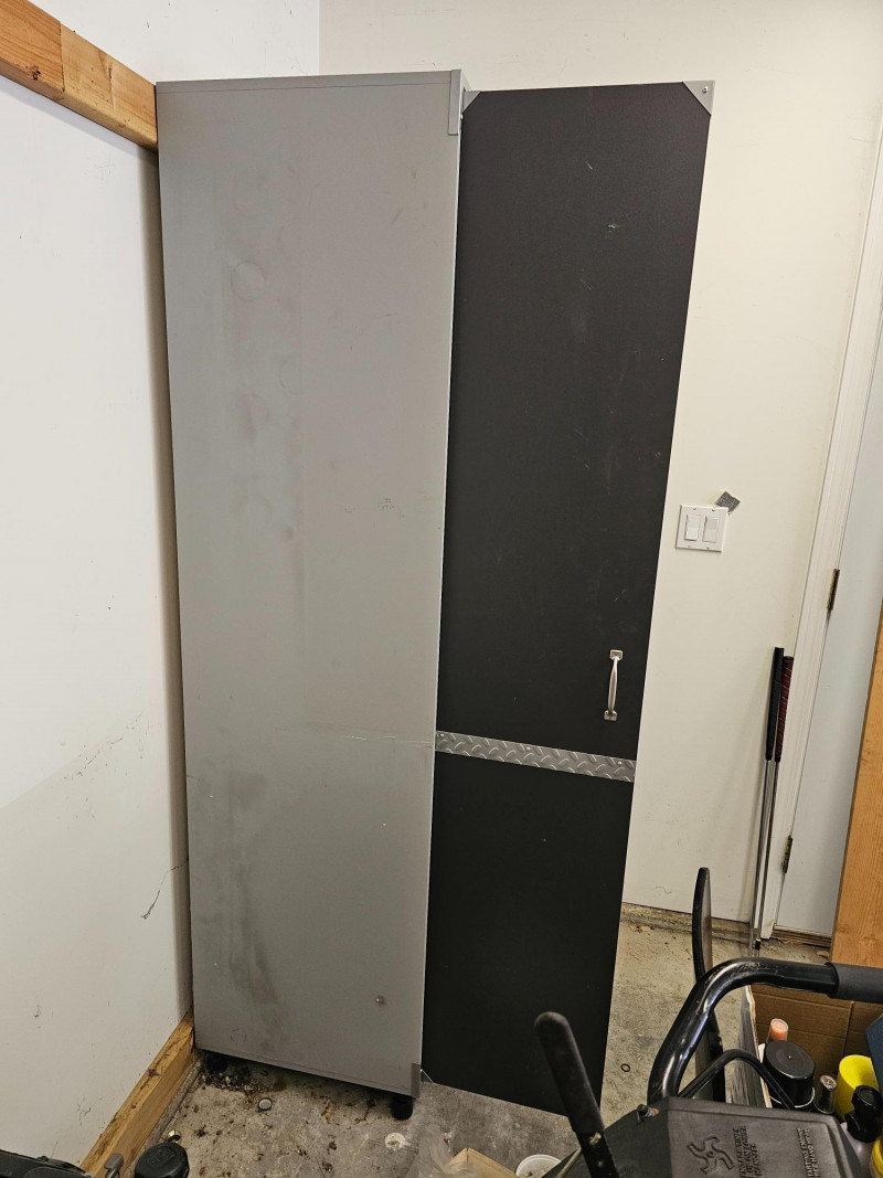 Medium Coleman Double Door Garage Cabinet Dark gray with diamond plate style trim Adjustable shelving Excellent storage for garage, shed, or utility areas. Made with a durable laminate material Lockable, but keys not included 76"T x 31.5"W x 19.5"D Items in/on cabinet not included!
