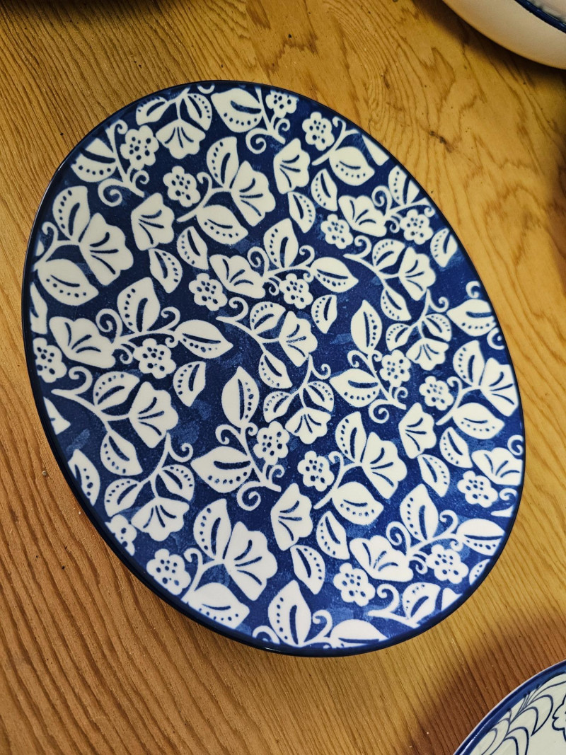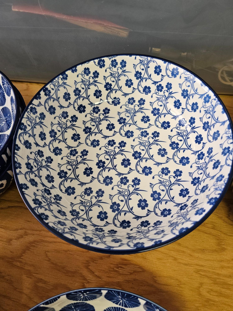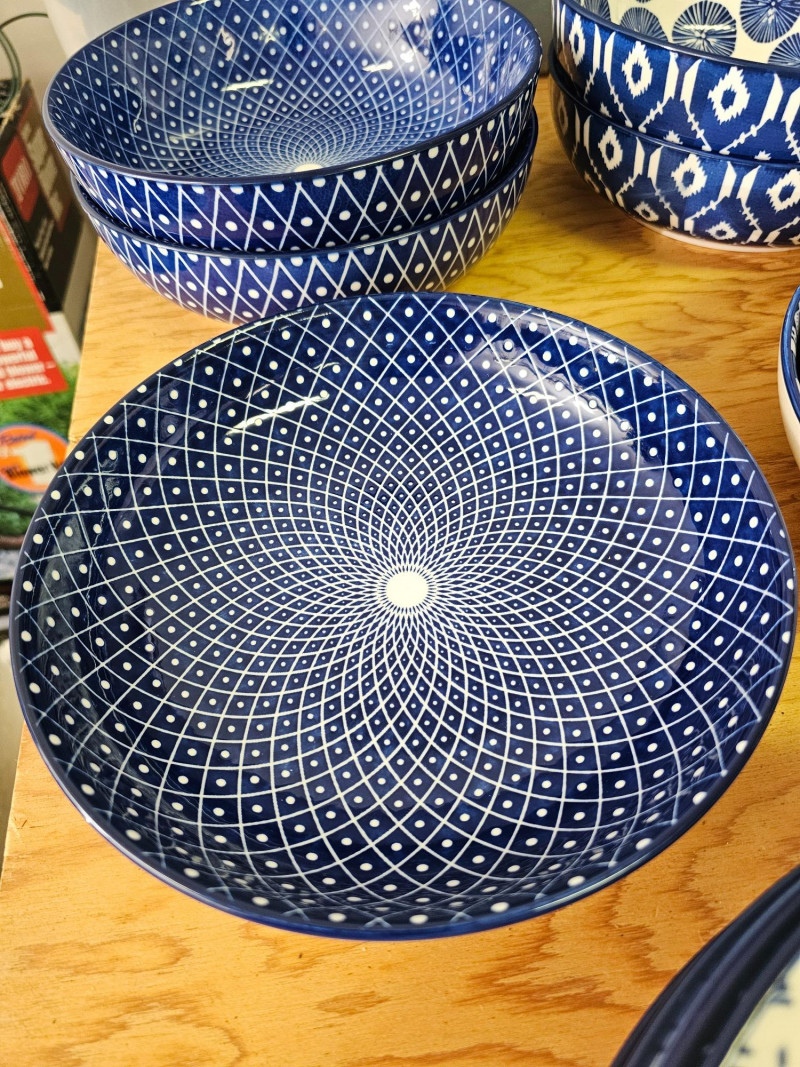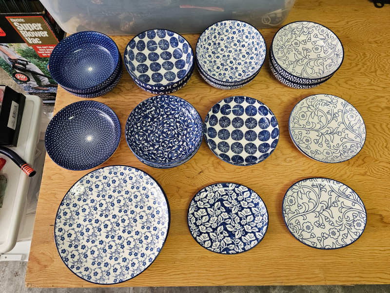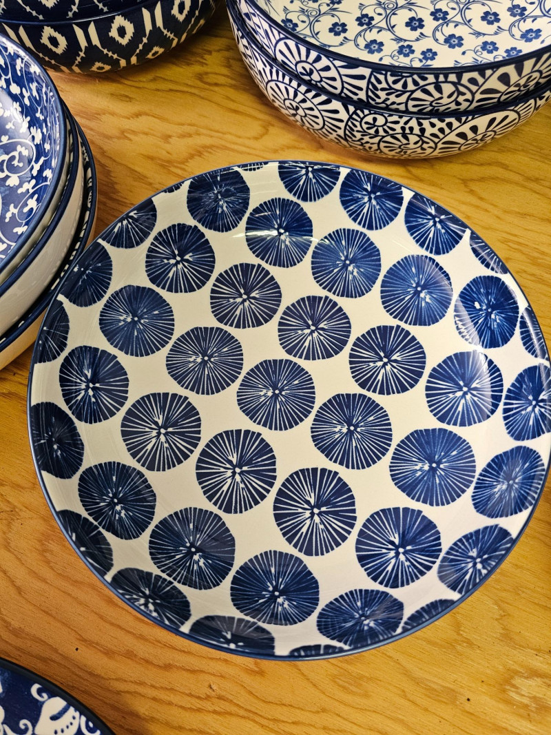Selamica Blue & White Patterned Dishes Microwave, oven, and dishwasher safe Lead-free (8) Large bowls (6) Medium bowls (6) Dinner plates (2) Small plates Not a full set of one pattern, but all dishes match in color. Set a fun table this summer! 22 dishes in all!