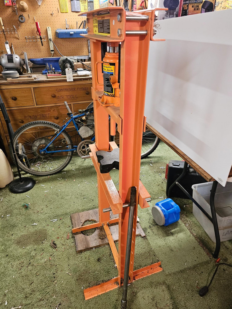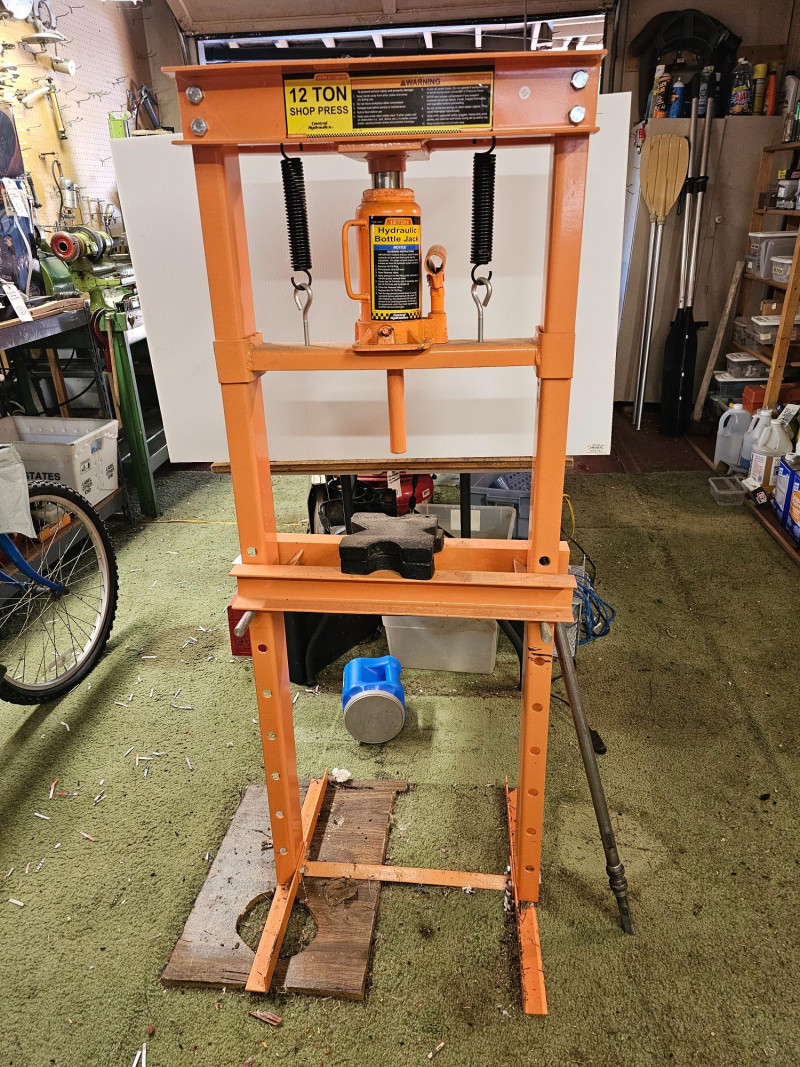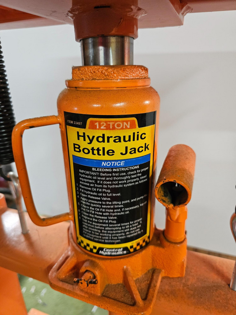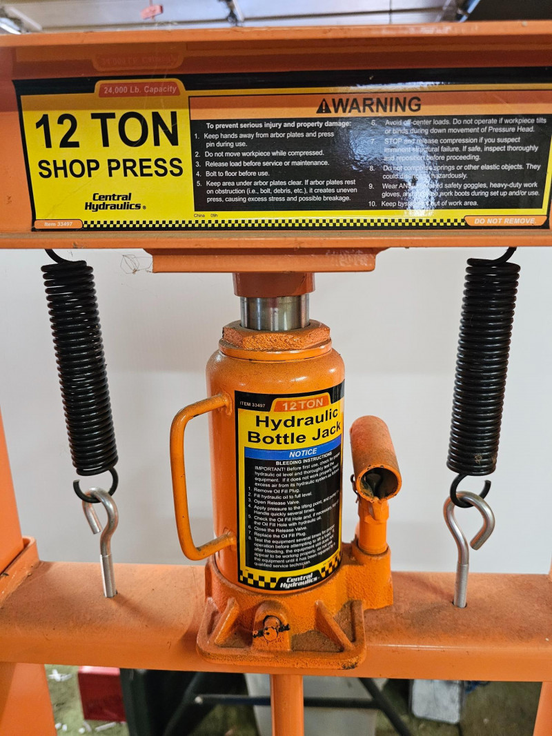 Central Machine 12 ton H-Frame Industrial Heavy Duty Floor Shop Press 12-ton capacity: This press is capable of generating significant pressure for various tasks. Utilizes the included/installed 12-ton Hydraulic Bottle Jack H-frame design: A common and sturdy design for shop presses. Industrial heavy-duty: Designed for demanding applications. Floor shop press: Intended for stationary use on a shop floor. Multipurpose: Can be used for a wide range of jobs, including: Removing and installing bearings, bushings, gears, ball joints, U-joints, and pulleys. Electric motor and armature repair. Installation and removal of pressure-fitted parts. Bending or straightening metal. Includes large metal bar for operating hydraulic jack Appears to in good condition! 53"T x 20"W x 20"D