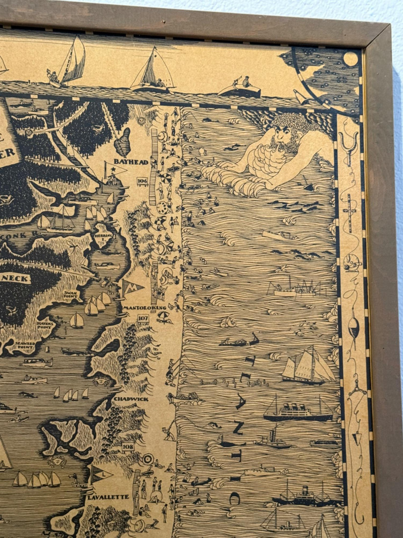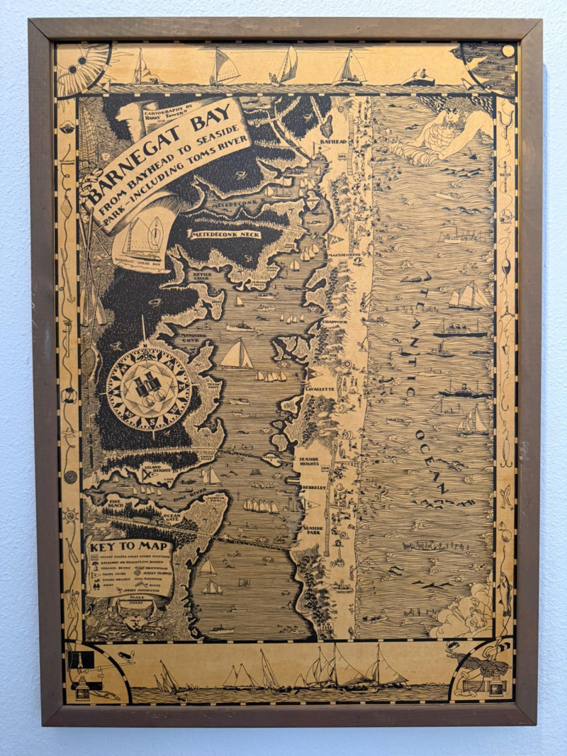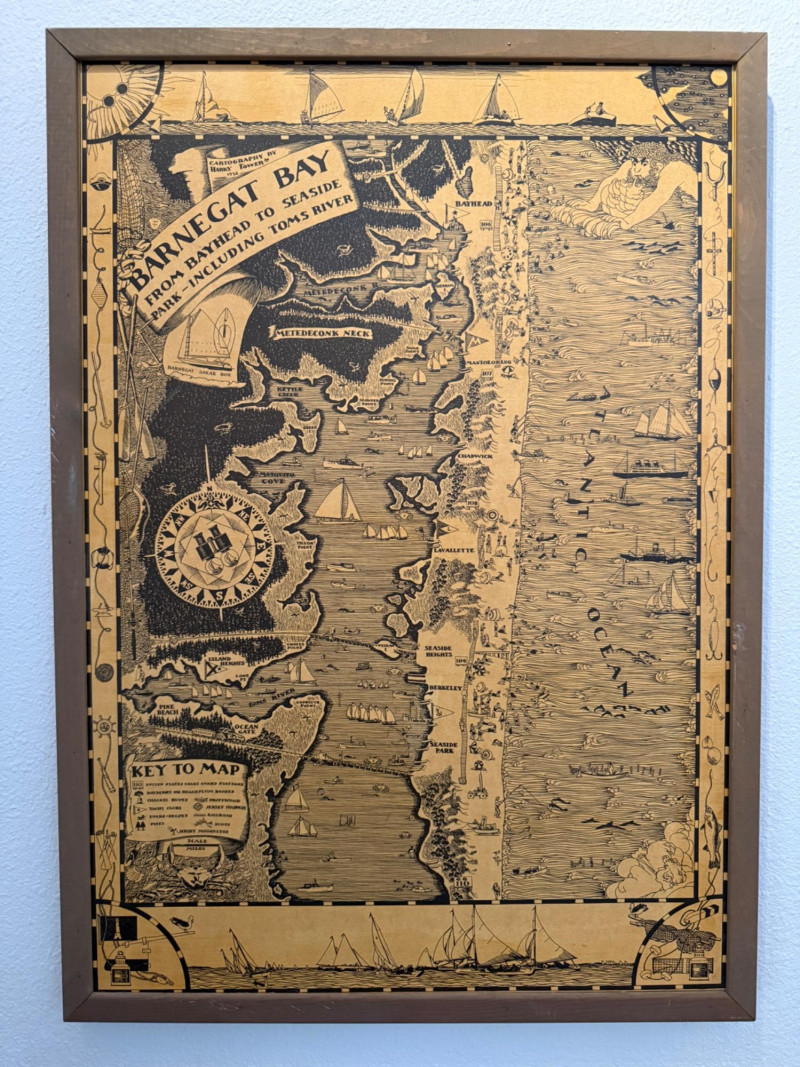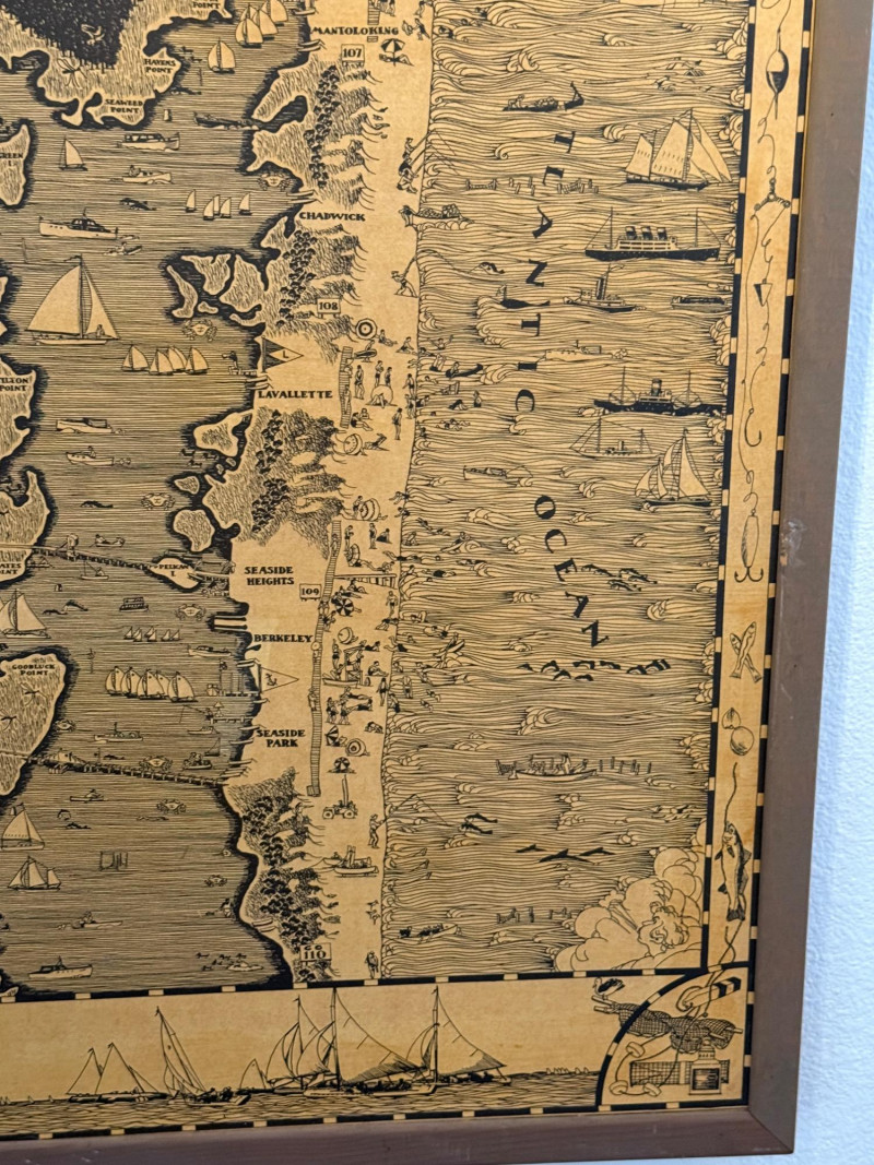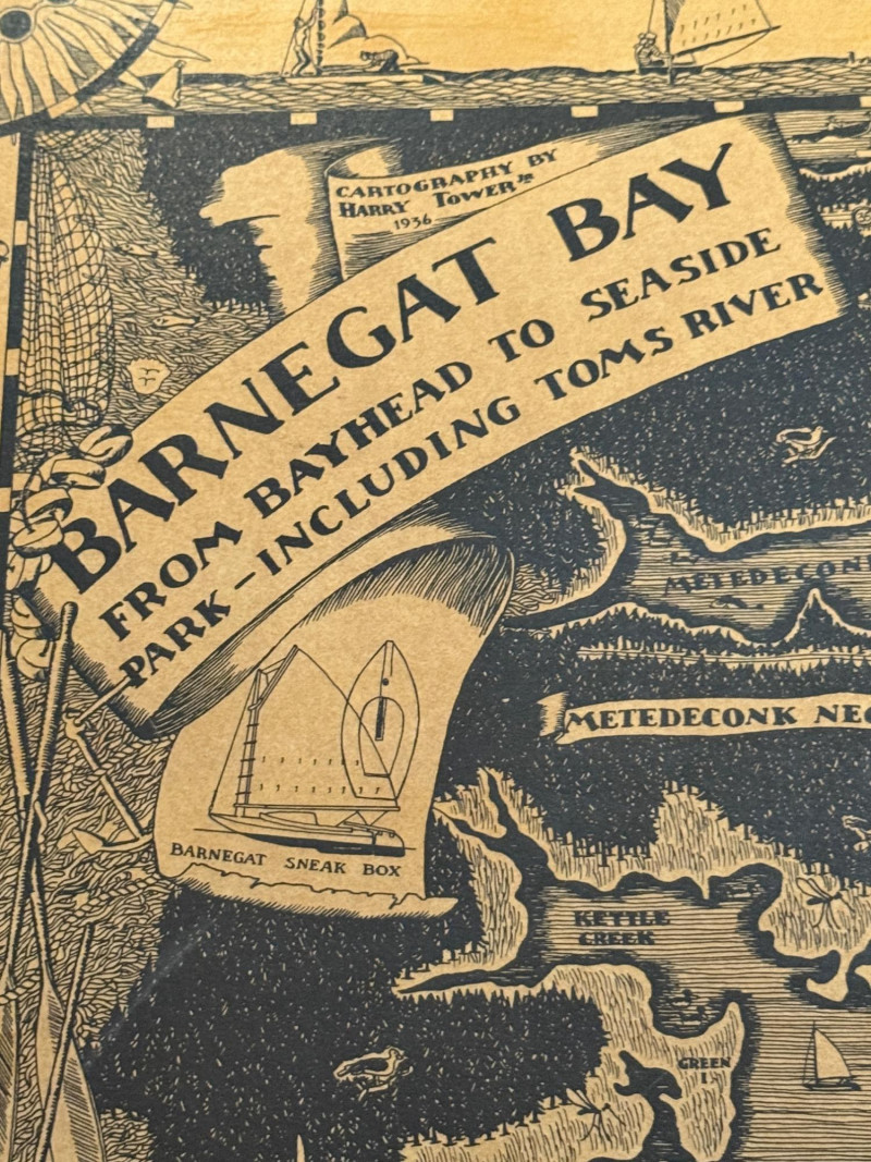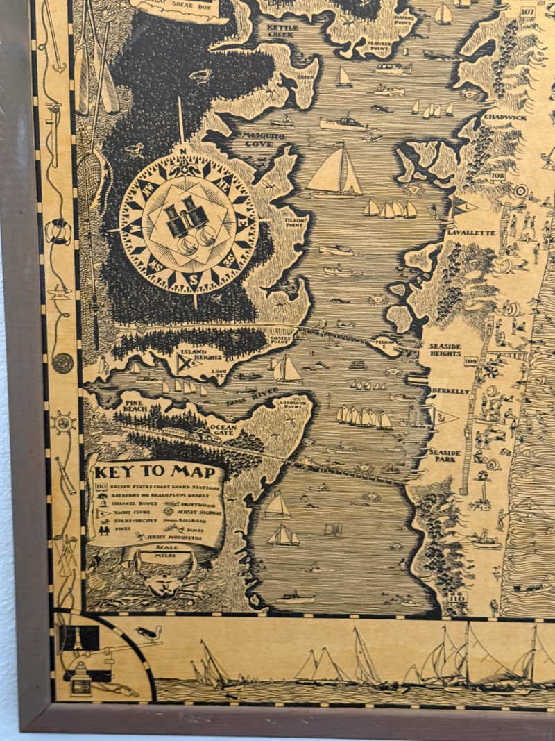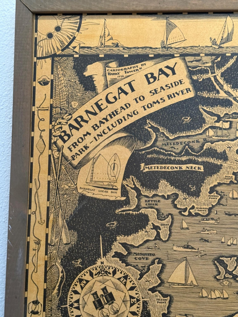 1936 Cartography of the Barnegat Bay Jersey Shore By Harry Tower Wood framed map created on wood. 20.5x29”