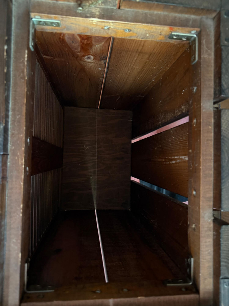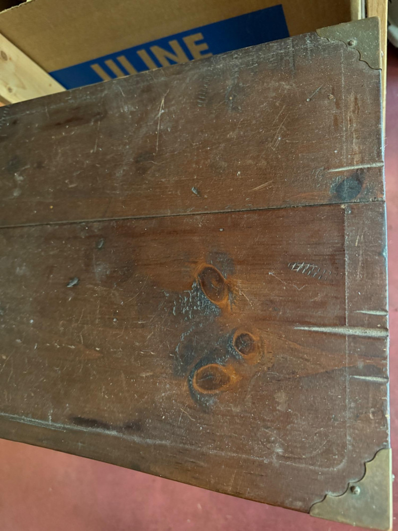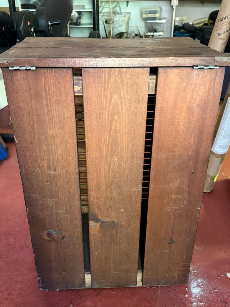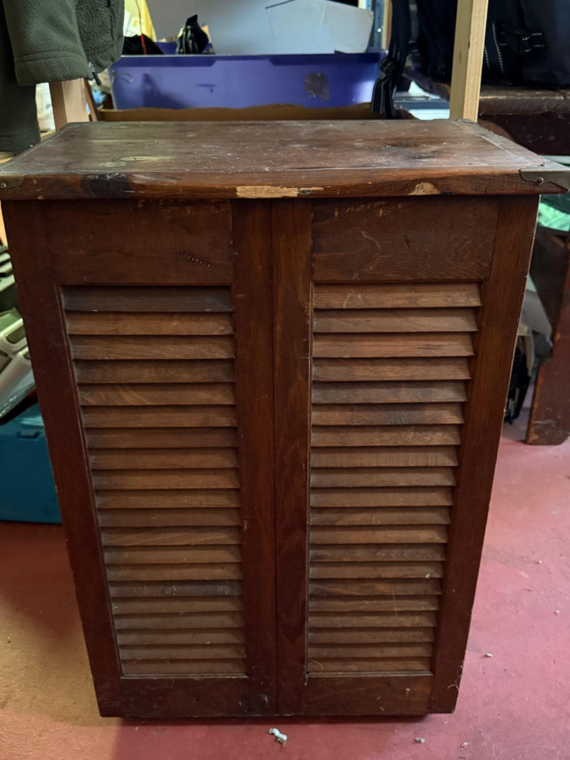 Wood Cabinet with louvered front, hinged top lid and brass corner protectors. Cool rustic piece. 19x13x28”