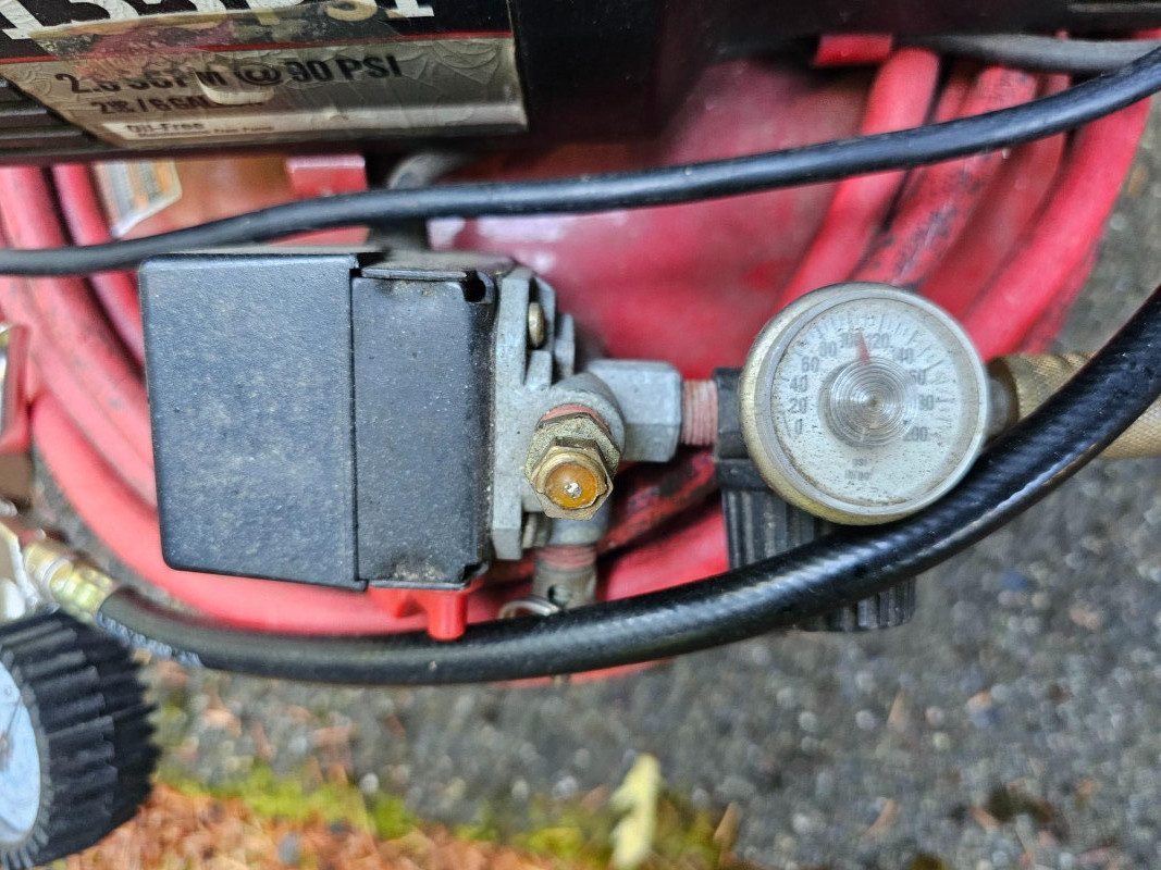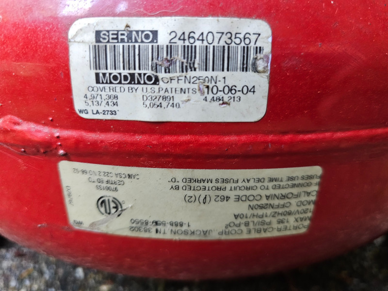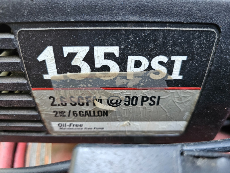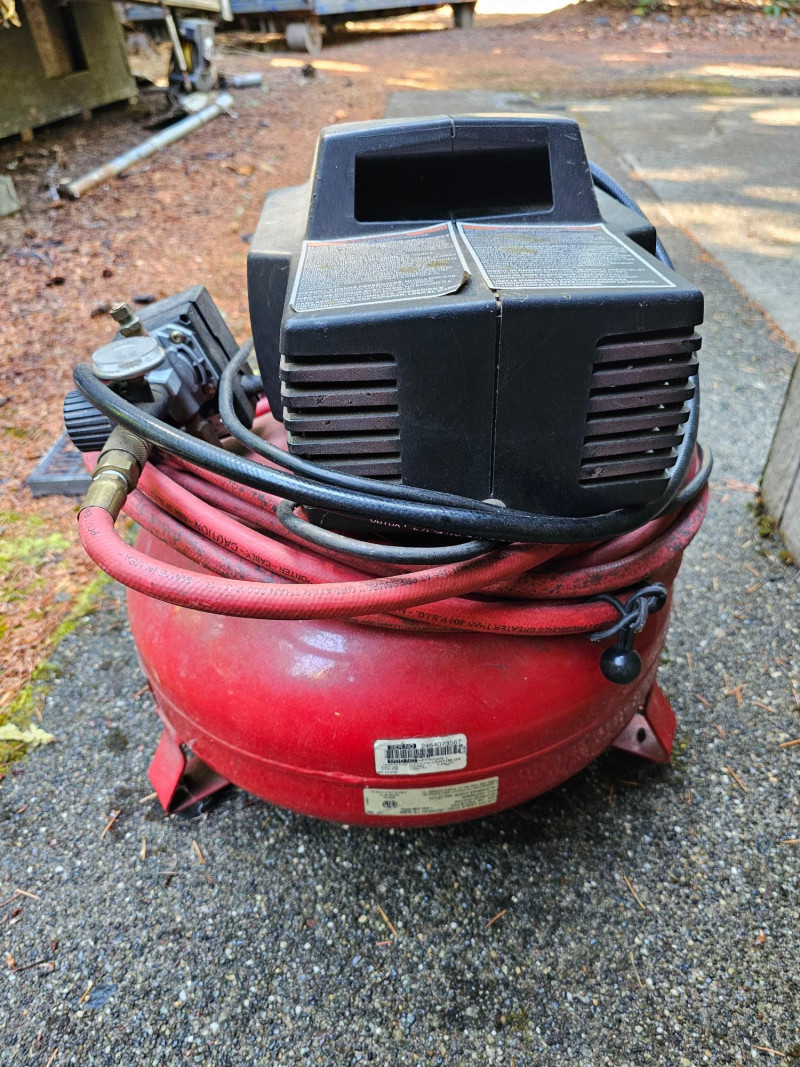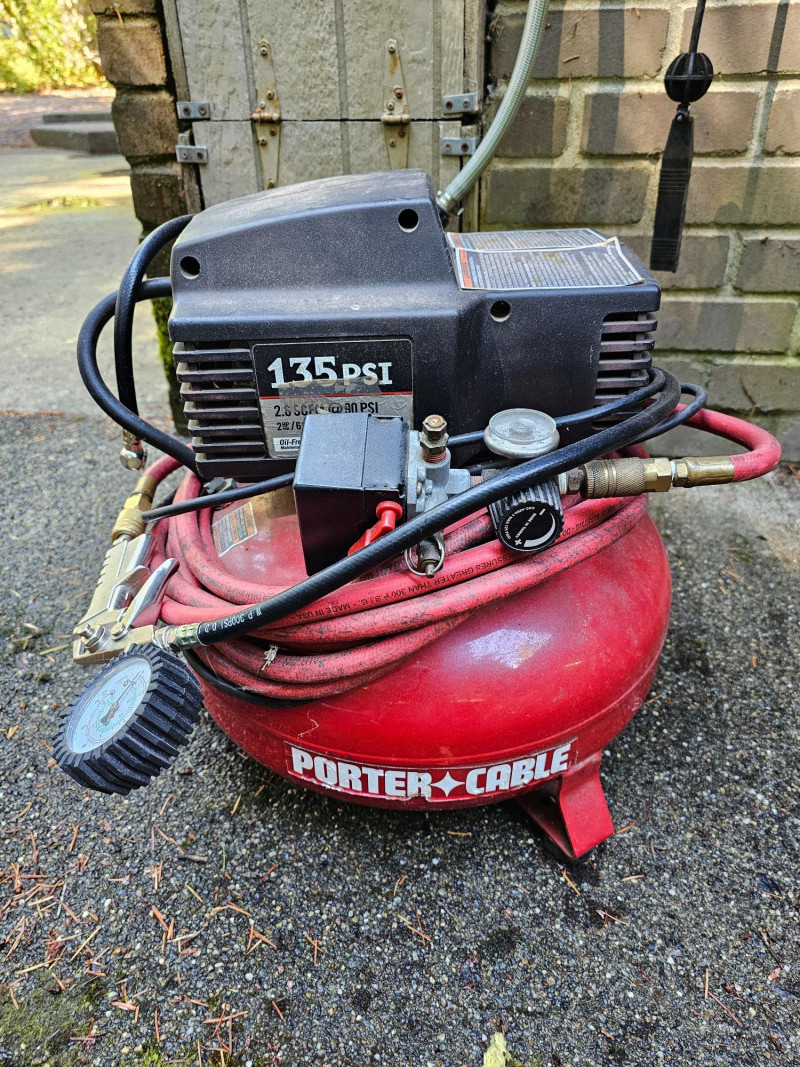 Porter Cable Gallon Pancake-Style Air Compressor Porter Cable #CFFN250N 6 Gallon 135psi 2hp Oil-free, maintenance free pump Includes air hose with air chuck & tire pressure gauge Tested - Works! 16"T x 16"W x 16"D