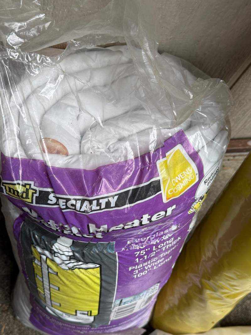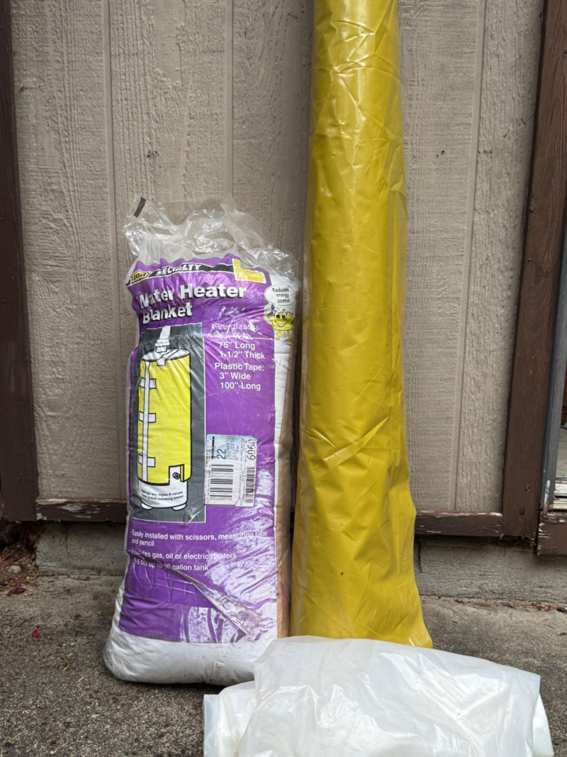 Roll of 48” yellow plastic, double wall with perforations every 25”. Clear plastic roll. Water heater blanket in sealed packaging.