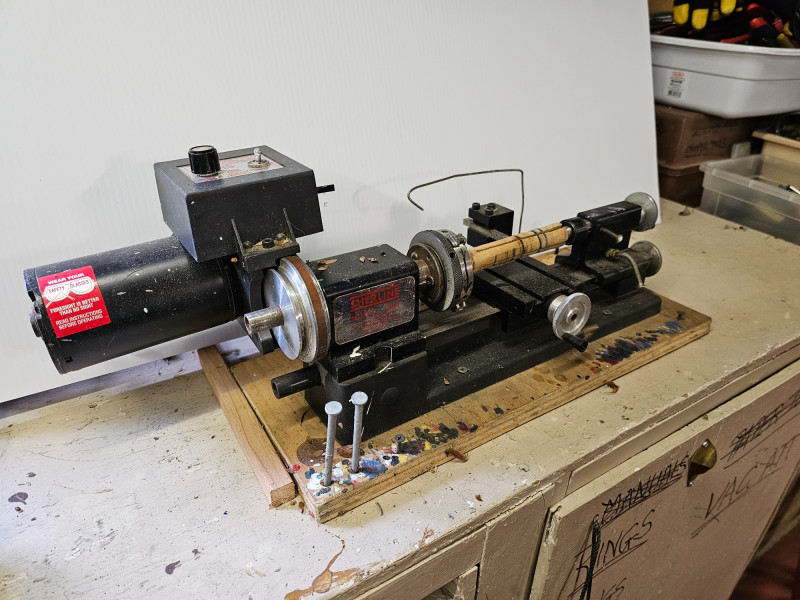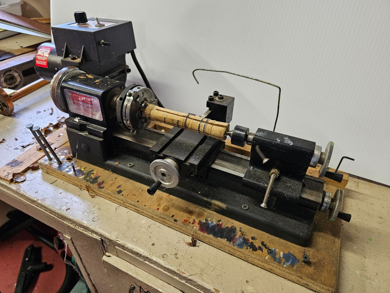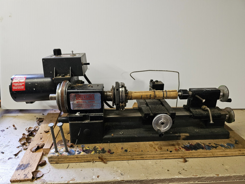Sherline 4000 Series Miniature Metalworking Lathe Compact 8-inch tabletop lathe known for its precision in machining small parts Precision Machining: This lathe is designed for precise work on small parts made from various materials, such as wood, plastic, aluminum, and steel. Motor and Speed Control: It is equipped with a 90V DC motor and an electronic speed controller, allowing for variable spindle speeds from 70 to 2800 RPM. Mounted to a wooden board Tested - Works! 8"T x 23.5"W x 8.5"D