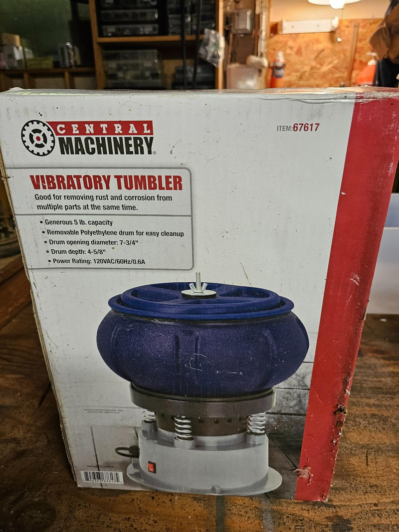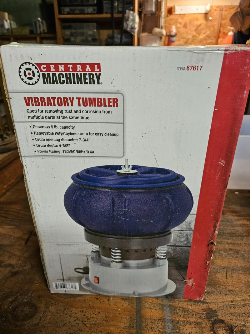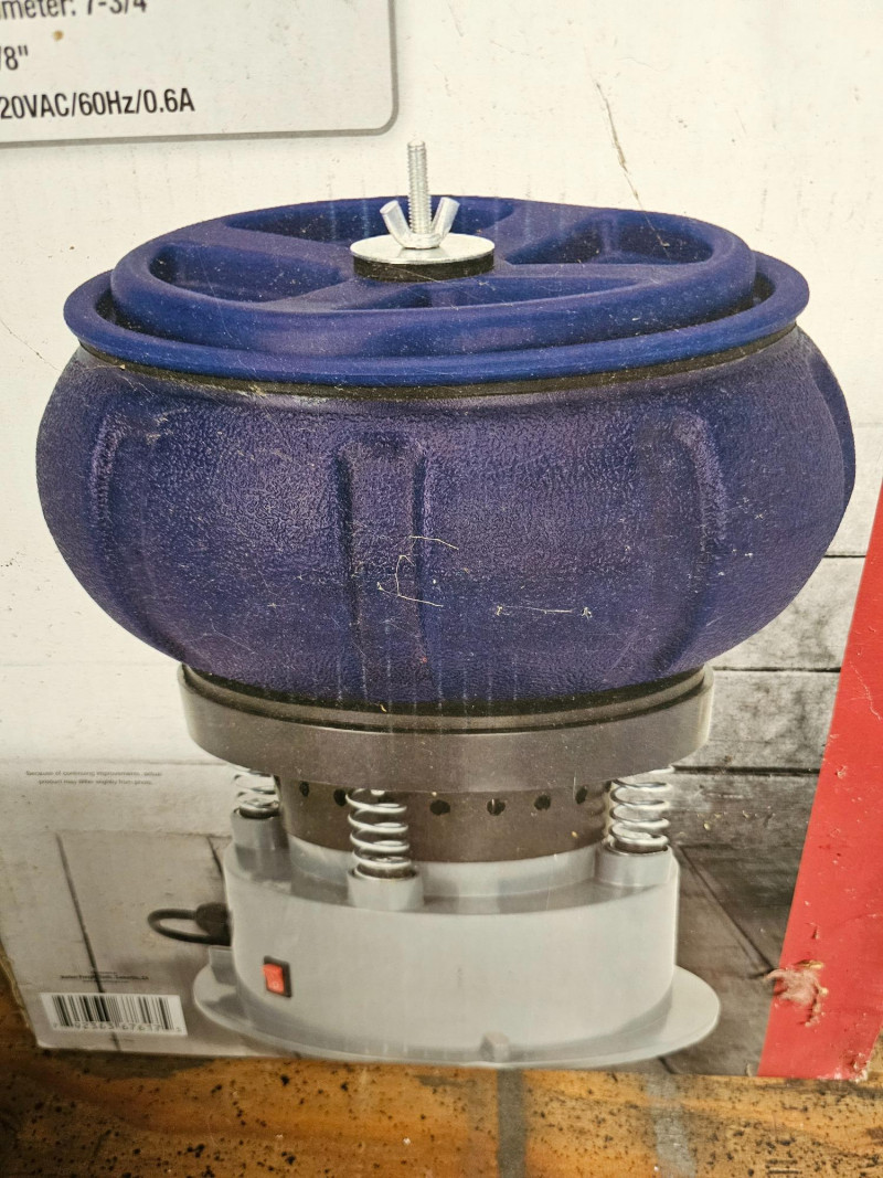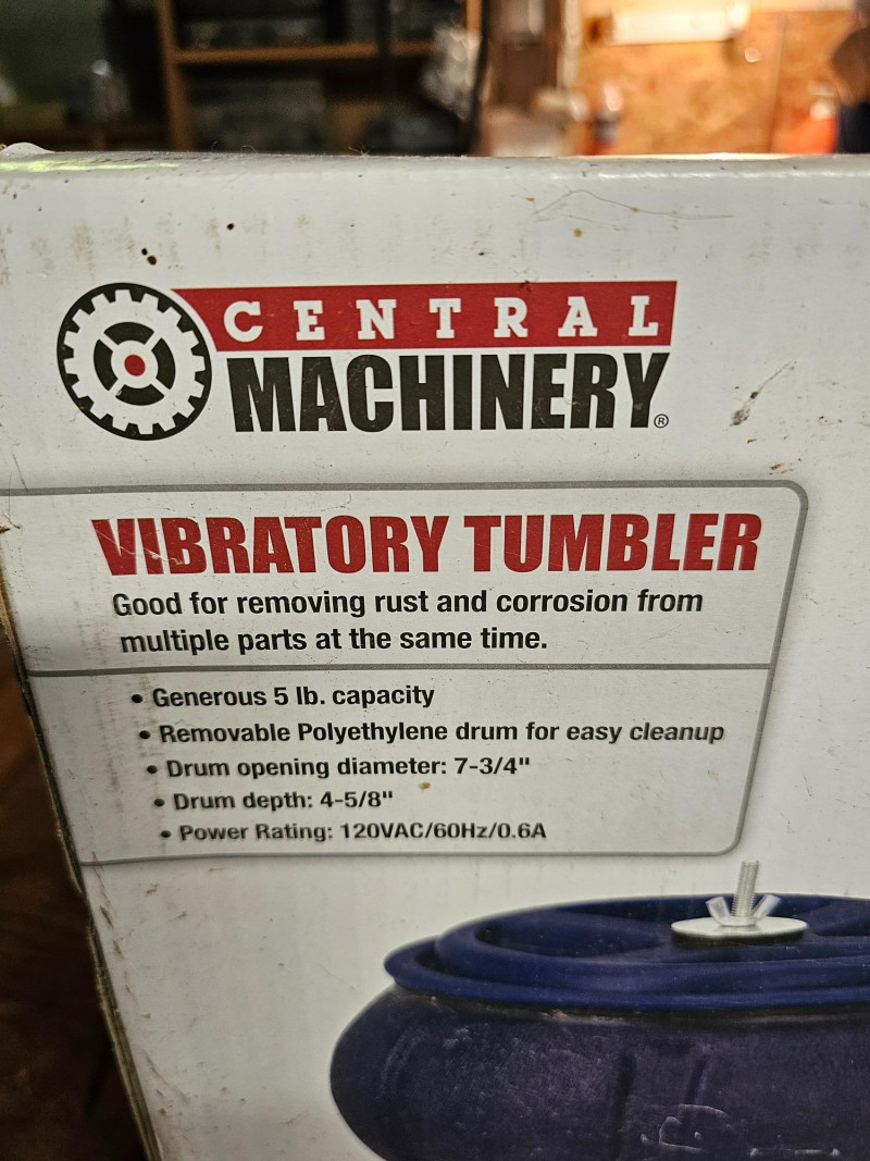 Central Machinery Vibratory Tumbler (New In Box!) Item #67617 Good for removing rust & corrosion from multiple parts at the same time 5lb capacity Removable polyethylene drum for easy cleanup Drum opening diameter: 7 3/4" Drum depth: 4 5/8" Power rating: 120VAC/60Hz/.6AMP Brand new in box!