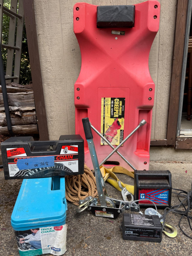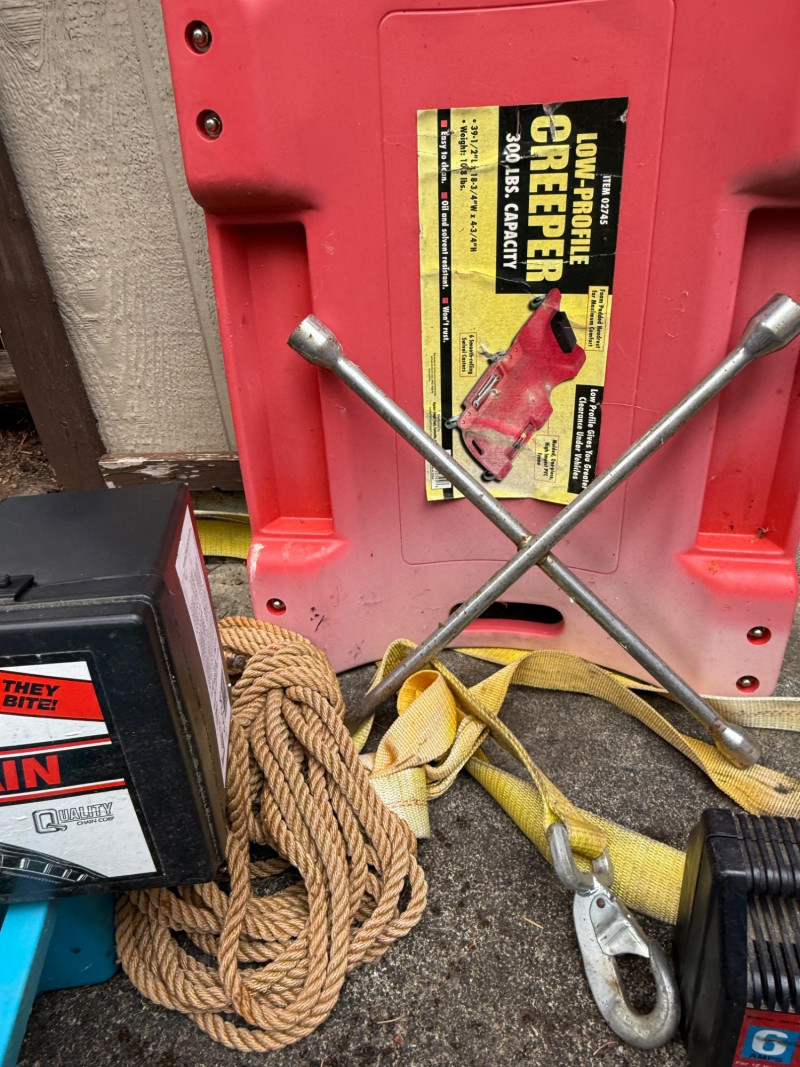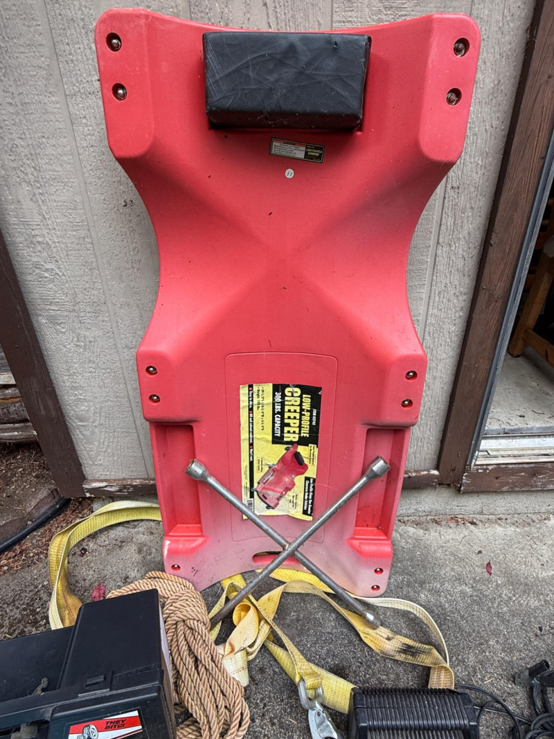 Automotive Needs Creeper - Cable Winch Puller- Lug Wrench - Strapping with Hook - Tire Chains - Rope - Safety Charger - Speed Charger