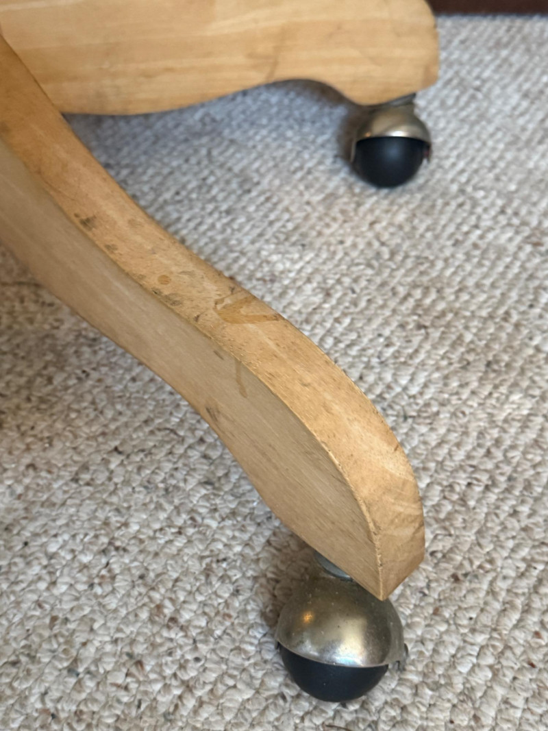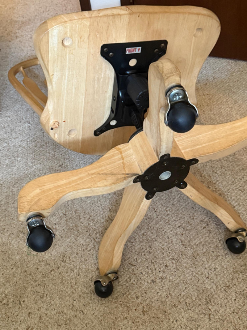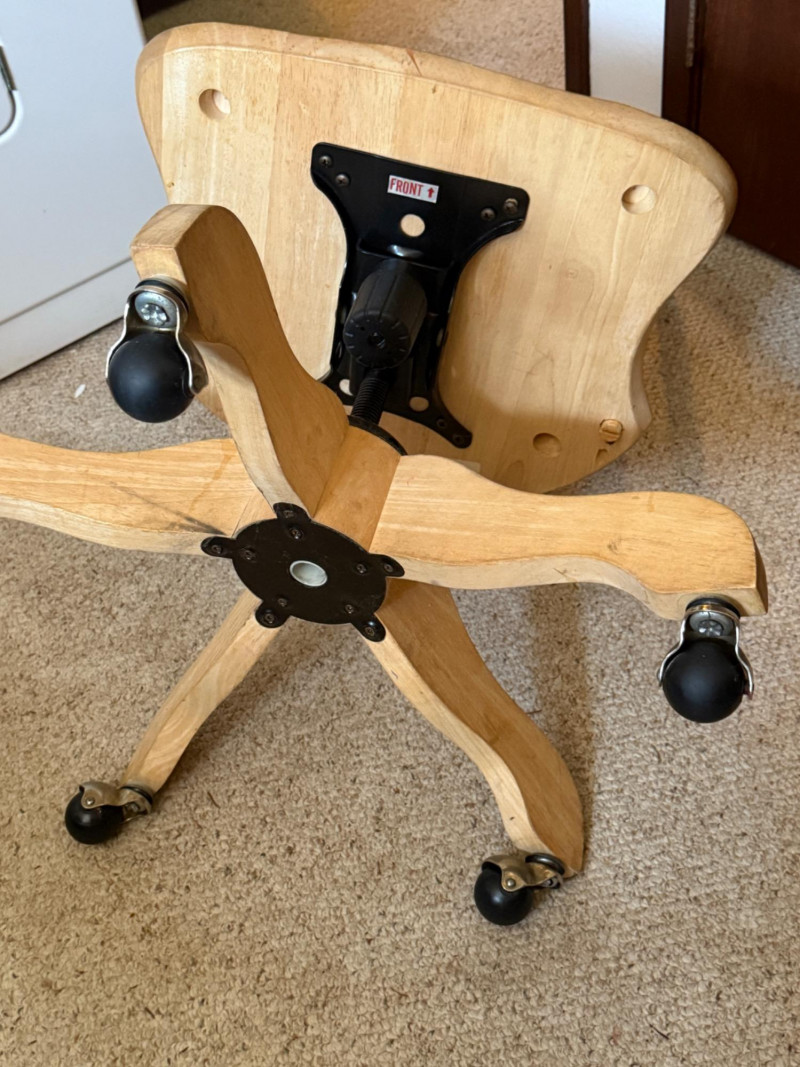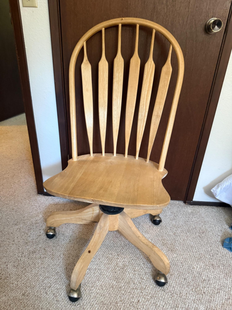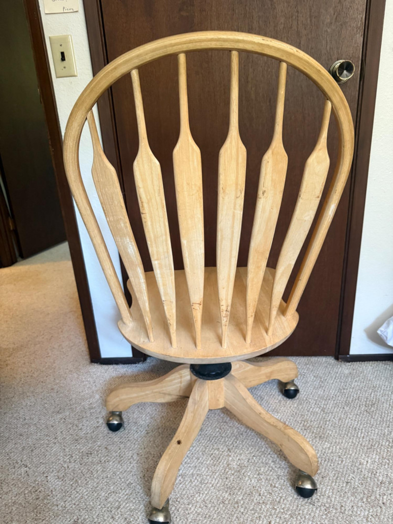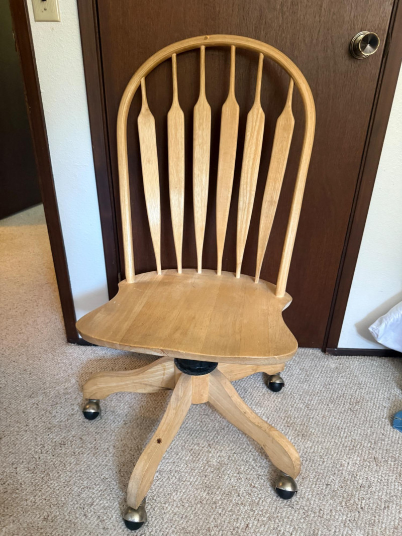 Unfinished pine Steambent Windsor Desk Chair 27” wide base 19.5” seat width and 17” height Back height is 40.5” swivel and roll