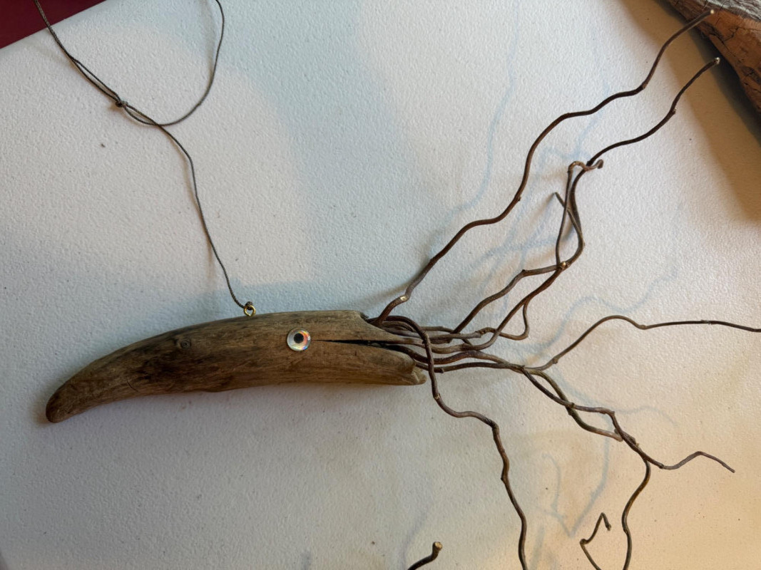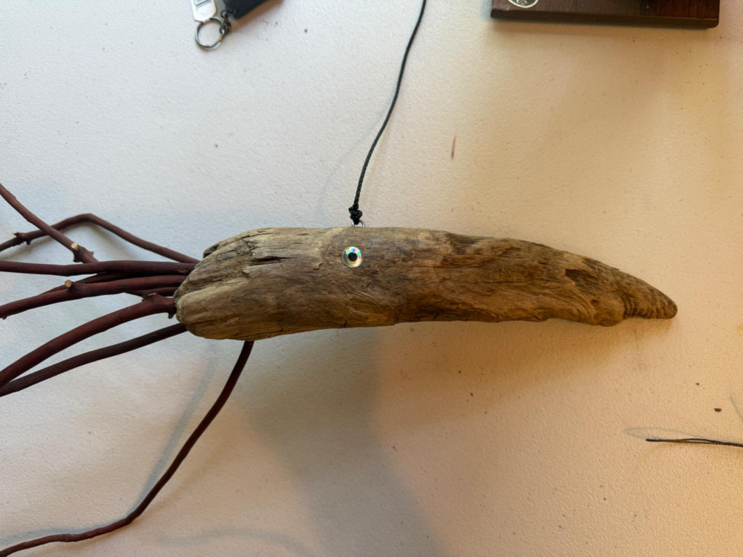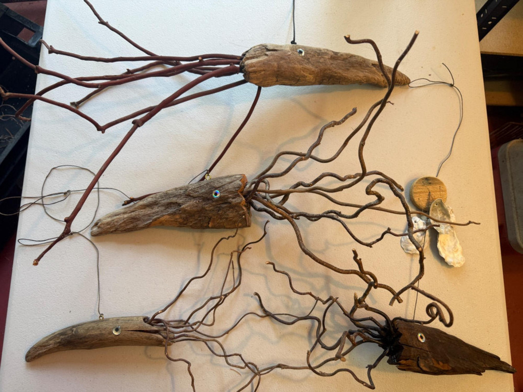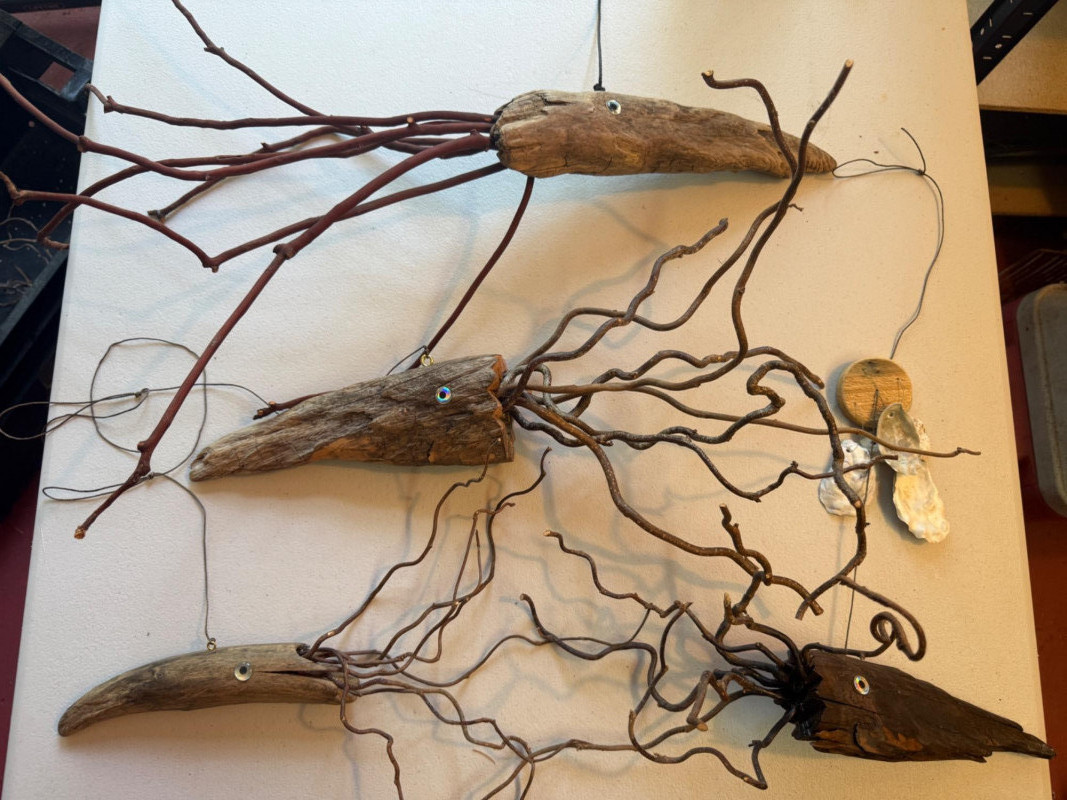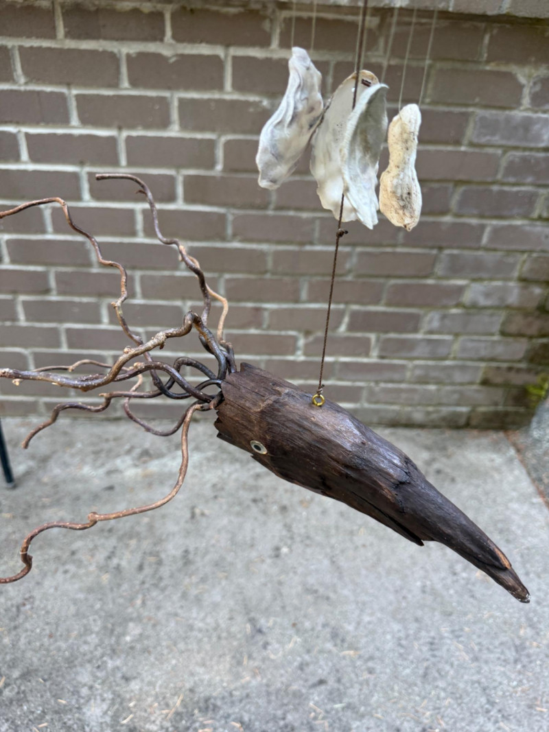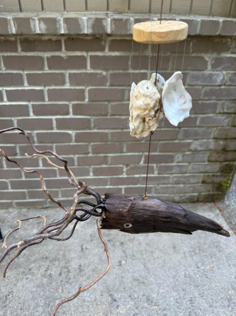 Hand crafted sea creatures made from an insulator and drift wood. Squid hanging with shell "chimes".